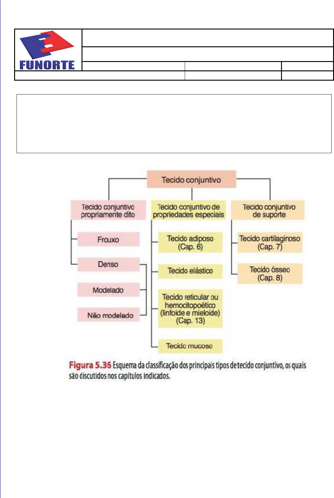 LIVRO: JUNQUEIRA & CARNEIRO, 12ª ED, PÁGINA 68, em relação ao termos lâmina e membrana basal. “Nem todos os estudiosos concordam com o uso dos termos membrana basal e lâmina basal, e ambos são às vezes usados indiscriminadamente, causando bastante confusão. Neste livro, "lâmina basal" é usado para indicar a lâmina densa e a presença eventual de uma lâmina rara, estruturas vistas ao microscópio eletrônico. "Membrana basal" é usado neste livro para indicar a faixa mais espessa vista ao microscópio de luz.” Classificação Tecidos conjuntivos embrionários Tecido conjuntivo mesenquimal Tecido conjuntivo mucoso Tecido conjuntivo propriamente dito Tecido conjuntivo frouxo Tecido conjuntivo denso- classificado em denso modelado; denso não modelado Tecido reticular Tecido adiposo FACULDADES UNIDAS DO NORTE DE MINAS CITOLOGIA/HISTOLOGIA AULA PRÁTICA TECIDO CONJUNTIVO CURSO: MEDICINA Período: 1º Turmas: A, B Professora Ms. KARINE CARDOSO DOS SANTOS Tecido conjuntivo especial Cartilagem Osso Sangue TECIDO CONJUNTIVO RETICULAR Formado principalmente por fibras de colágeno tipo III, constitui a trama em forma de rede de alguns órgãos tais como: fígado, baço, medula óssea, tecido muscular liso, linfonodos. Normalmente, as fibras reticulares são produzidas por fibroblastos, embora as células musculares lisas produzam o colágeno tipo III no músculo liso. TECIDO CONJUNTIVO DENSO Muito rico em fibras e pobre em células, em comparação ao tecido conjuntivo frouxo. Dependendo da orientação das fibras, o tecido conjuntivo denso é classificado em modelado e não modelado. As fibras de colágeno tipo I do tecido conjuntivo denso não modelado são dispostas aparentemente de maneira desorganizada e proporcionam ao tecido grande flexibilidade e elasticidade, mas, ao mesmo tempo, conferem a ele a capacidade de resistir às forças de tensão. Este tecido forma: derme da pele, a cápsula de muitos órgãos, uma fina camada de tecido conjuntivo que envolve os nervos e os grandes vasos sanguíneos. TECIDO CONJUNTIVO DENSO MODELADO É classificado em colagenoso e elástico, pois, depende do tipo de fibra que o compõe. TECIDO CONJUNTIVO DENSO MODELADO COLAGENOSO Forma: tendões, aponeuroses e ligamentos. É formado principalmente, de feixes espessos, grossos, paralelos de fibras de colágeno do tipo I densamente organizadas, contendo quantidade escassa de substância fundamental amorfa e fibroblastos comprimidos entre os feixes de fibras. TECIDO CONJUNTIVO DENSO MODELADO ELÁSTICO Formado por fibras elásticas densamente organizadas, dispostas paralelamente entre si com fibroblastos entre as lâminas elásticas. Este tecido se organiza em lâminas perfuradas, como na membrana fenestrada a aorta, ou em feixes espessos e curtos, como nos ligamentos da nuca na coluna vertebral. Células do tecido conjuntivo: -Fibroblastos -Macrófagos, -Mastócitos, -Plasmócitos, -Células adiposas: Células adiposas são células do tecido conjuntivo que se tornaram especializadas no armazenamento de energia na forma de triglicerídios (gorduras neutras). -Leucócitos. - Células fixas são: fibroblastos, adipócitos, pericitos, mastócitos, macrófagos. -células transitórias: leucócitos. Fibroblasto: célula mais comum do tec. conjuntivo é a principal responsável pela formação das fibras e do material intercelular amorfo. Possui mobilidade, porém, muito lenta. Sintetiza colágeno, elastina, proteoglicanas e glicoproteínas estruturais. Os fibroblastos raramente se dividem em pessoas adultas, exceto quando o organismo requer fibroblastos adicionais. Fibrócito: célula menor. Com estímulo adequado como ocorre nos processos de cicatrização, o fibrócito pode voltar a sintetizar fibras. -Macrófagos: Os macrófagos estão distribuídos na maioria dos órgãos e constituem o sistema fagocitário mononuclear. São células de vida longa e podem sobreviver por meses nos tecidos. Função: atuam como elementos de defesa. Eles fagocitam restos celulares, fragmentos de fibras da matriz extracelular, células neoplásicas (cancerosas), bactérias e elementos inertes que penetram o organismo. Os macrófagos também são células secretoras capazes de produzir uma impressionante variedade de substâncias que participam nas funções de defesa e reparo dos tecidos. Figura 5.2 Corte histológico de tecido conjuntivo frouxo que mostra vários fibroblastos (F) ativos com núcleo grande, nucléolo evidente e citoplasma abundante e basófilo. Observe os inúmeros prolongamentos citoplasmáticos dos fibroblastos (setas) que se destacam entre as fibrílas finas de colágeno. (Coloração: hematoxilina-eosina. Médio aumento. Imagem de T.M.T. Zom.) -Plasmócitos: são pouco numerosos no tecido conjuntivo normal, exceto nos locais sujeitos à penetração de bactérias e proteínas estranhas, como a mucosa intestinal. São abundantes nas inflamações crõnicas (em que predominam plasmócitos, linfócitos e macrofágos). www.unicamp.com.br http://www.unicamp.com.br/ -Mastócitos: amplamente distribuídos pelo corpo, porém, são particularmente abundantes na derme e nos tratos digestivo e respiratório. Esses mastócitos imaturos circulam no sangue, cruzam a parede de vênulas e capilares e penetram os tecidos, onde vão proliferar e se diferenciar. Embora sejam, em muitos aspectos, semelhantes aos leucócitos basófilos, os mastócitos se originam de tuna célula-tronco diferente. O núcleo é pequeno, esférico e central e de difícil observação por estar frequentemente encoberto pelos grânulos citoplasmáticos. Liberam: histamina, heparina, condroitinsulfato, arilsulfatase, proteases neutras, fator quimmiotático de: eosinófilo, neutrófilo, leucotrienos C4, D4, E4, prostaglandina D2, tromboxano A2, bradicininas, fator de ativação de plaquetas. Função: atuar em resposta as inflamações, colaboram com as reações imunes, nas reações alérgicas e nas infestações parasitárias. www.google.