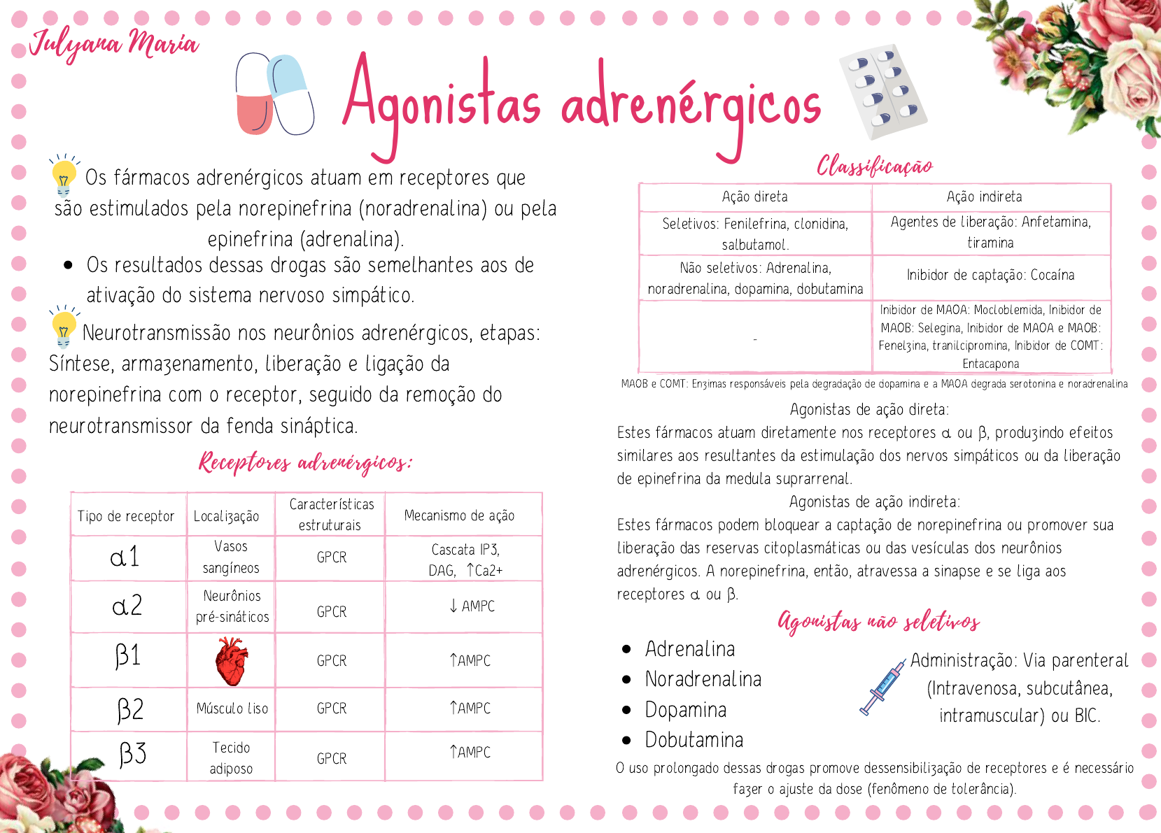 Os fármacos adrenérgicos atuam em receptores que são estimulados pela norepinefrina (noradrenalina) ou pela epinefrina (adrenalina). Agonistas adrenérgicos Neurotransmissão nos neurônios adrenérgicos, etapas: Síntese, armazenamento, liberação e ligação da norepinefrina com o receptor, seguido da remoção do neurotransmissor da fenda sináptica. Ação indiretaAção direta Seletivos: Fenilefrina, clonidina, salbutamol. Não seletivos: Adrenalina, noradrenalina, dopamina, dobutamina Agentes de liberação: Anfetamina, tiramina Inibidor de captação: Cocaína Inibidor de MAOA: Mocloblemida, Inibidor de MAOB: Selegina, Inibidor de MAOA e MAOB: Fenelzina, tranilcipromina, Inibidor de COMT: Entacapona Agonistas de ação direta: Estes fármacos atuam diretamente nos receptores α ou β, produzindo efeitos similares aos resultantes da estimulação dos nervos simpáticos ou da liberação de epinefrina da medula suprarrenal. Agonistas de ação indireta: Estes fármacos podem bloquear a captação de norepinefrina ou promover sua liberação das reservas citoplasmáticas ou das vesículas dos neurônios adrenérgicos. A norepinefrina, então, atravessa a sinapse e se liga aos receptores α ou β. Os resultados dessas drogas são semelhantes aos de ativação do sistema nervoso simpático. Receptores adrenérgicos: LocalizaçãoTipo de receptor Características estruturais Mecanismo de ação α1 α2 β1 β2 β3 Vasos sangíneos Neurônios pré-sináticos Músculo liso Tecido adiposo GPCR GPCR GPCR GPCR GPCR Cascata IP3, DAG, Ca2+ ↑ ↑AMPC ↓ AMPC ↑AMPC ↑AMPC Classificação - MAOB e COMT: Enzimas responsáveis pela degradação de dopamina e a MAOA degrada serotonina e noradrenalina Agonistas não seletivos Adrenalina Noradrenalina Dopamina Dobutamina Administração: Via parenteral (Intravenosa, subcutânea, intramuscular) ou BIC. O uso prolongado dessas drogas promove dessensibilização de receptores e é necessário fazer o ajuste da dose (fenômeno de tolerância). Julyana Maria Choque cardiogênico: Acontece quando o coração deixa de ser capaz de bombear o sangue pelo corpo e, por isso, é mais frequente após um caso de infarto, intoxicação por medicamentos ou infecção generalizada. Choque hipovolêmico: Surge quando não existe sangue suficiente para levar o oxigênio até para órgãos como o coração e cérebro. Normalmente, este tipo de choque aparece após um acidente quando existe uma hemorragia grave, que tanto pode ser externa como interna. Choque séptico: Ocorre quando uma infecção, que estava localizada em apenas um local, consegue chegar até o sangue e se espalha por todo o corpo, afetando vários órgãos. (vasodilatação sistêmica) Choque anafilático Reação de hipersensibilidade mediada pela IgE, podendo gerar edema de glote e broncoespasmos. (vasodilatação sistêmica) Indicações Choque cardiogênico Choque hipovolêmico Choque séptico Choque anafilático Choque - Definição: Síndrome clínica caracterizada por perfusão inadequada dos tecidos; em geral, está associado a hipotensão e pode causar falência dos sistemas orgânicos. Redução imediata e potencialmente fatal do suprimento de O2 e nutrientes para os órgãos. ↓ pressão arterial → acentuada ativação do SNS → vasoconstrição periférica e ↑ de cronotropismo e inotropismo → manutenção de pressão arterial e fluxo sanguíneo cerebral; podendo desencadear↓ fluxo sanguíneo renal. No choque, acontece: Adrenalina - Indicações É a menos seletiva. Ativa os receptores α1, β1 e β2. Baixas concentrações → efeito predominante β1e β2. Altas concentrações → efeito predominante α1. Quando a adrenalina interage com receptores α1, na musculatura vascular, o efeito que se observa é vasoconstrição. Quando a adrenalina interage com receptores β, no coração, o efeito que se observa é o aumento da quantidade de AMPC (efeitos cronotrópicos, dromotrópicos e inotrópicos positivos), no pulmão (β2), causa broncodilatação. É a droga de primeira escolha no choque anafilático (anafilaxia). Prolonga ação de anestésicos locais. Usada na parada cardíaca, pois, promove um aumento da força de contração do coração (inotropismo positivo). Adrenalina - Efeitos indesejáveis Aumenta a frequência cardíaca (maior consumo de O2). Aumenta a pressão arterial. Pode causar arritmias. Noradrenalina - Indicações Ativa os receptores α1 e β1 Quando a noradrenalina interage com receptores α1 (vasoconstrição) e β1 (inotropismo+) Prolonga ação de anestésicos locais. Sem ação no sistema respiratório, seu efeito é voltado para região vascular. Julyana Maria Usada na hipotensão grave, pois, causa vasoconstrição e isso contribui para aumentar a PA. Usada no choque cardiogênico, já que aumenta a força de contração do coração (desvantagem é o aumento do consumo no miocárdio de O2). Noradrenalina - Efeitos indesejáveis Causa vasoconstrição esplâncnica, hepática e renal e isso reduz fluxo sanguíneo renal, podendo levar a um caso de isquemia renal. Dopamina - Indicações Ativa os receptores D1, α1 e β1. O efeito desejado é dependente da dose. Baixas doses (≤2 μg/Kg/min), receptores D1, causa vasodilatação em especial nos leitos arteriais esplâncnicos e renais, levando a um aumento do fluxo sanguíneo renal e mantem a taxa de filtração glomerular adequada em pacientes com IC. Doses intermediárias (2-5 μg/Kg/min), receptores β1, causa inotropismo + e elevação do DC com pouca ou nenhuma alteração na FC ou na RVS Dose mais altas (10-20 μg/Kg/min), receptores α1, causa vasoconstrição arterial e venosa Dose alta: Importância em pacientes com hipotensão sistêmica acentuada ou choque cardiogênico, aumentando a PA. ICC grave e aguda (terapia crônica β-bloqueadores). Choque hipovolêmico. Choque séptico (atenção ao uso de antibióticos). Choque cardiogênico (↑ menos a FC que noradrenalina). Dopamina - Efeit