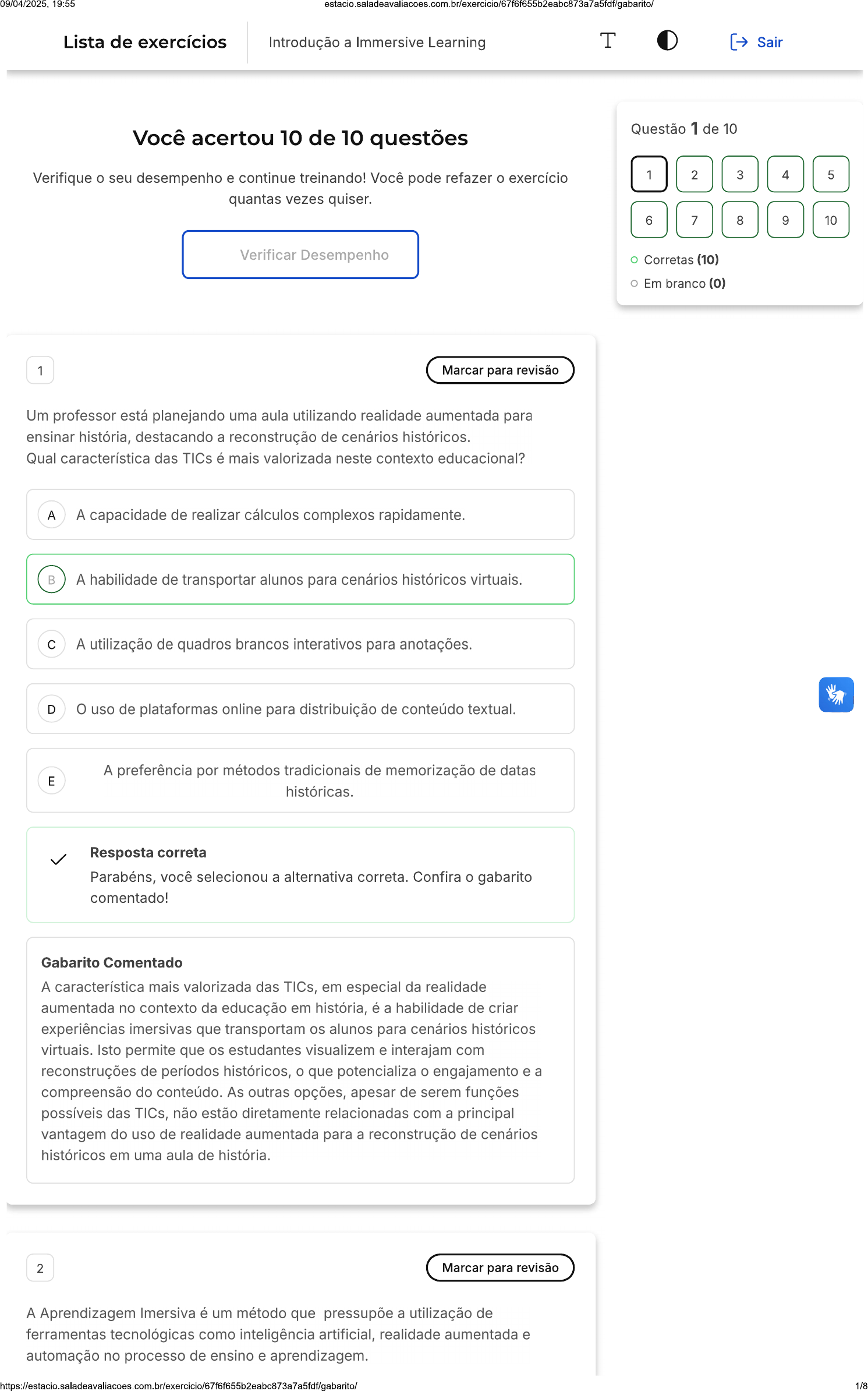 09/04/2025. 19:55 Lista de exercícios Introdução a Immersive Learning T Sair Você acertou 10 de 10 questões Questão 1 de 10 Verifique o seu desempenho e continue treinando! Você pode refazer o exercício 1 2 3 4 5 quantas vezes quiser. 6 7 8 9 10 Verificar Desempenho Corretas (10) Em branco (0) 1 Marcar para revisão Um professor está planejando uma aula utilizando realidade aumentada para ensinar história, destacando a reconstrução de cenários históricos. Qual característica das TICs é mais valorizada neste contexto educacional? A A capacidade de realizar cálculos complexos rapidamente. B A habilidade de transportar alunos para cenários históricos virtuais. C A utilização de quadros brancos interativos para anotações. D uso de plataformas online para distribuição de conteúdo textual. E A preferência por métodos tradicionais de memorização de datas Resposta correta Parabéns, você selecionou a alternativa correta. Confira o gabarito comentado! Gabarito Comentado A característica mais valorizada das TICs, em especial da realidade aumentada no contexto da educação em história, é a habilidade de criar experiências imersivas que transportam os alunos para cenários históricos virtuais. Isto permite que os estudantes visualizem e interajam com reconstruções de períodos históricos, o que potencializa o engajamento e a compreensão do conteúdo. As outras opções, apesar de serem funções possíveis das TICs, não estão diretamente relacionadas com a principal vantagem do uso de realidade aumentada para a reconstrução de cenários históricos em uma aula de história. 2 Marcar para revisão A Aprendizagem Imersiva é um método que pressupõe a utilização de ferramentas tecnológicas como inteligência artificial, realidade aumentada e automação no processo de ensino e aprendizagem. 1/809/04/2025, 19:55 Qual é um dos principais desafios enfrentados para a sua implementação nas instituições educacionais? A falta de autonomia dos estudantes durante o processo de ensino e A aprendizagem. A necessidade de proporcionar um contato mais profundo do aprendiz B com o conteúdo ensinado. A necessidade de infraestrutura adequada tanto nas residências quanto C nas instituições educacionais. A falta de motivação dos alunos para participar do processo de ensino e D aprendizagem imersiva. A falta de recursos tecnológicos disponíveis para facilitar o acesso ao E conteúdo educacional. Resposta correta Parabéns, você selecionou a alternativa correta. Confira o gabarito comentado! Gabarito Comentado Um dos desafios para a implementação da Aprendizagem Imersiva é a questão da infraestrutura, tanto nas residências quanto nas escolas e universidades. Isso é crucial para garantir que todos os alunos, independentemente de sua condição social, tenham acesso aos meios de informação, promovendo assim maior equidade. 3 Marcar para revisão Em uma aula de Biologia sobre células, um professor decide aplicar a aprendizagem imersiva. Para isso, ele utiliza um aplicativo de realidade aumentada que projeta o retículo endoplasmático e ribossomos em 3D. Qual é o principal benefício didático da utilização desta tecnologia pelo professor na sua aula? A Facilitar a memorização dos componentes celulares. B Permitir a visualização estática dos processos celulares. C Tornar o aprendizado mais interativo e compreensível. D Reduzir a necessidade de explicações detalhadas pelo professor. E Proporcionar uma experiência de aprendizado auditivo melhorada 2/809/04/2025, 19:55 Resposta correta Parabéns, você selecionou a alternativa correta. Confira o gabarito comentado! Gabarito Comentado A realidade aumentada, ao projetar elementos como o retículo endoplasmático e ribossomos em 3D, torna o aprendizado mais interativo e visualmente compreensível. Isso ajuda os alunos a visualizarem e entenderem melhor conceitos complexos de Biologia, o que é difícil de ser alcançado apenas com métodos tradicionais de ensino que muitas vezes se limitam a imagens estáticas e descrições textuais. 4 Marcar para revisão Em uma disciplina de geografia urbana, um software de realidade aumentada é usado para simular o crescimento de uma cidade e suas implicações socioambientais. Qual característica da realidade aumentada é primordial para este tipo de simulação? A A capacidade de visualizar dados históricos estáticos. B A interação com elementos geográficos em tempo real. C o acesso a informações escritas sobre urbanização. D A promoção de aprendizado auditivo sobre questões urbanas. E estímulo para o uso exclusivo de tecnologia em sala de aula. Resposta correta Parabéns, você selecionou a alternativa correta. Confira o gabarito comentado! Gabarito Comentado uso de realidade aumentada em uma disciplina de geografia urbana permite que os alunos interajam com elementos geográficos em tempo real. Isso proporciona uma compreensão mais dinâmica e integrada do crescimento urbano e suas consequências, o que é crucial para o estudo das implicações socioambientais de tal desenvolvimento. 5 Marcar para revisão Sabe-se que a aprendizagem significativa não se coaduna com a ideia de conhecimento linear e seriado. Para desenvolver oportunidades de uma aprendizagem significativa, cabe ao professor: 3/819:55 Manter o foco do trabalho disciplinar, graduando o ensino que é A oferecido aos alunos de maneira correspondente à sua capacidade de aprendizagem. Concentrar o ensino nos aspectos cognitivos dos envolvidos no B processo, evitando o tratamento curricular de referências pessoais, sociais e afetivas oriundas dos alunos. Manter o processo de comunicação e avaliação, objetivando garantir as C aprendizagens previstas para cada etapa, numa perspectiva ascendente e atenta aos pré-requisitos. Definir processos de gestão do conhecimento pelos alunos para garantir D a aprendizagem dos elementos fundamentais do currículo nos tempos adequados. Orie