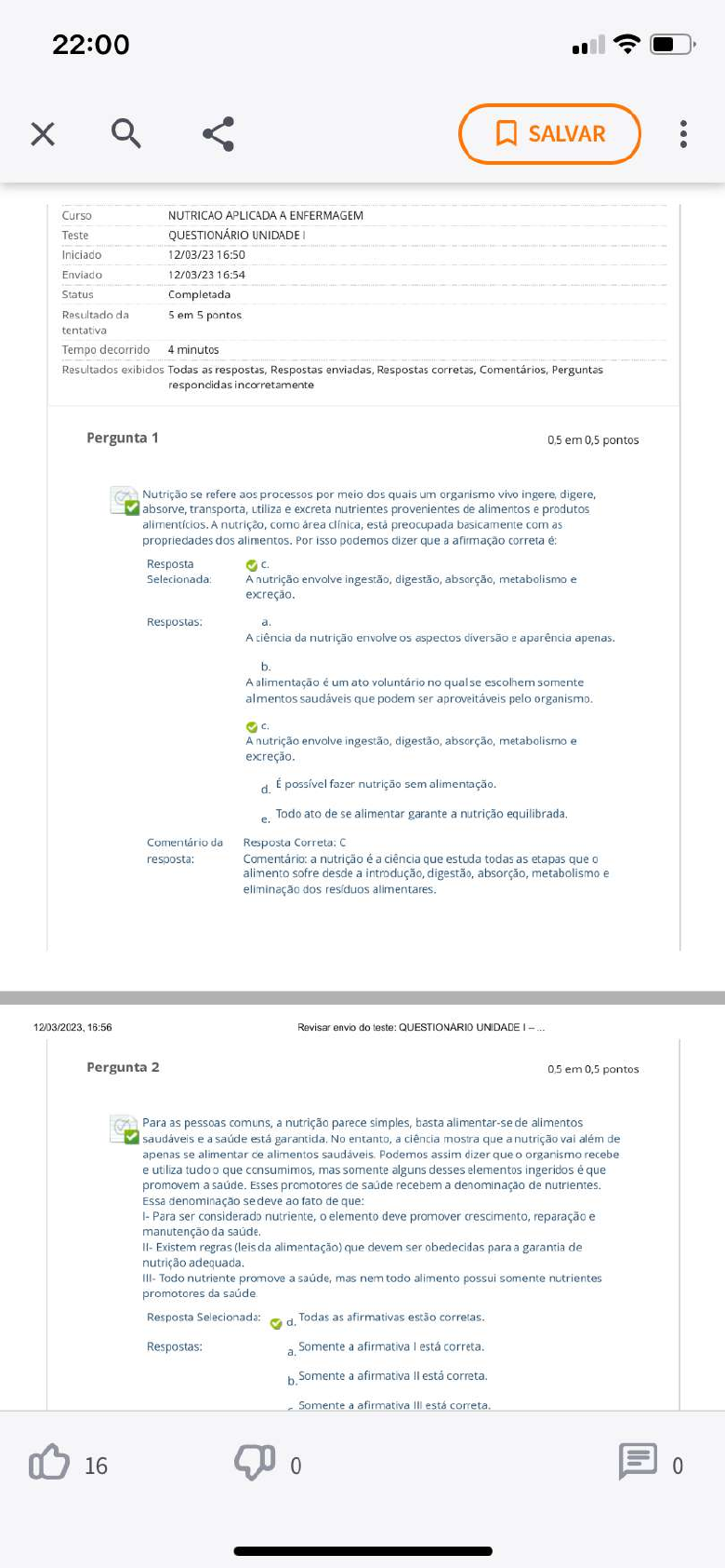 22:00 X SALVAR : Curso NUTRICAO APLICADA A ENFERMAGEM Teste QUESTIONÁRIO UNIDADE Iniciado 12/03/23 16:50 Enviado 12/03/23 16:54 Status Completada Resultado da 5 em 5 pontos tentativa Tempo decorrido 4 minutos Resultados exibidos Todas as respostas, Respostas enviadas, Respostas corretas, Perguntas respondidas incorretamente Pergunta 1 0.5 em 0,5 pontos Nutrição se refere aos processos por meio dos quais um organismo vivo ingere, digere, transporta, utiliza e excreta nutrientes provenientes de alimentos e produtos A nutrição, como área clínica, está preocupada basicamente com as propriedades dos Por isso podemos dizer que a afirmação correta é: Resposta Selecionada A nutrição envolve digestão, absorção, metabolismo e excreção. Respostas: a. A ciência da nutrição envolve os aspectos diversão e aparência apenas b. A alimentação é um ato voluntário no qual se escolhem somente alimentos saudáveis que podem ser aproveitáveis pelo organismo. A nutrição envolve ingestão, digestão, metabolismo e excreção. d. É possível fazer nutrição sem alimentação. Todo ato de se alimentar garante a nutrição equilibrada. e. Comentário da Resposta Correta: C resposta: Comentário: a nutrição é a ciência que estuda todas as etapas que alimento sofre desde a introdução, digestão, absorção, metabolismo e eliminação dos 16:56 Revisar envio do teste: UNIDADE - Pergunta 2 em 0,5 pontos Para as pessoas comuns, a nutrição parece simples, basta alimentar-se de alimentos saudáveis e a saúde está garantida. No a ciência mostra que a nutrição vai além de apenas se alimentar de alimentos Podemos assim dizer que organismo recebe e utiliza tudo que consumimos, mas somente alguns desses elementos ingeridos é que promovem a saúde. Esses promotores de saúde recebem a denominação de nutrientes. Essa denominação se deve ao fato de que: Para ser considerado nutriente, elemento deve promover crescimento, reparação e manutenção da Existem regras (leis da alimentação) que devem ser obedecidas para a garantia de nutrição adequada. Todo nutriente promove a saúde, mas nem todo alimento possui somente nutrientes promotores da Resposta Selecionada: d. Todas as afirmativas estão Respostas: Somente a afirmativa está correta. b. Somente a afirmativa está correta. Somente a afirmativa III está correta. 16 0 022:00 X SALVAR 12/03/2023 16:56 Revisar envio do teste: UNIDADE Pergunta 2 em 0,5 pontos Para as pessoas comuns, a nutrição parece simples, basta alimentar-se de alimentos saudáveis e a saúde está No a ciência mostra que a vai além de apenas se alimentar de alimentos Podemos assim dizer que organismo recebe e utiliza tudo que mas somente alguns desses elementos ingeridos é que promovem a saúde. Esses promotores de saúde recebem a denominação de Essa denominação se deve ao fato de que: Para ser considerado o elemento deve promover reparação e manutenção da Existem regras (leis da alimentação) que devem ser obedecidas para a garantia de III- Todo nutriente promove a mas nem todo alimento possui somente nutrientes promotores da Resposta Selecionada: Todas as afirmativas estão d. Respostas: Somente a afirmativa está correta. a. Somente a afirmativa está correta. b. Somente a afirmativa III está correta. d. Todas as afirmativas estão Não há alternativa correta. e. Comentário Resposta Correta: D da resposta: Comentário: nutrientes são todas substâncias químicas contidas nos alimentos capazes de promover, reparar e manter a Para que isso ocorra, a alimentação deve estar dentro dos parâmetros propostos por Escudero conhecidos como as Leis da Nutrição (Lei da Lei da Qualidade, Lei da Harmonia e Lei da Bem como, embora os alimentos possuam nutrientes, eles podem conter elementos que não são necessários ou são, até mesmo, danosos para organismo como agrotóxicos. Pergunta 3 0.5 em 0,5 pontos Os carboidratos são considerados as principais fontes alimentares para a produção de energia, além de exercer inúmeras funções metabólicas e estruturais no organismo. As principais fontes de carboidratos são grãos, vegetais, melado e Fornecem combustível para o a medula, os nervos periféricos e as células vermelhas para sangue. A ingestão insuficiente desse macronutriente traz prejuízos ao sistema nervoso central e outros. Os carboidratos estão presentes, na maioria das vezes, nos alimentos de origem vegetal. Frente a esse enunciado, associe as duas colunas e assinale a alternativa 12/03/2023 16:56 Revisar envio do teste: QUESTIONARIO UNIDADE correta: A B 1- Açúcar de cana de açúcar 2- Lactose A Monossacarideo 3- Amido B 4- das frutas C Polissacarideo 5- Glicose Resposta Selecionada: 1B; 2B: 3C; 16 0 022:00 12/03/2023 16:56 Revisar envio do teste: QUESTIONARIO UNIDADE correta: A B de cana de açúcar 2- Lactose A 3. Amido B 4- das frutas C 5- Glicose Resposta Selecionada: 1B: 4A; 5A. e. Respostas: 1C; 2A: 3A 4C: a. b. 1B: 2A: 3C; 4C; 5A 1A: 2A: 3C: 4B: 5A d. 1A; 2C; 3C; 4B: 5B. 1B; 4A: 5A e. Comentário Resposta Correta: E da resposta: Comentário: os são os carboidratos mais simples da natureza, pois não sofrem transformações para serem absorvidos (glicose, frutose, galactose). são carboidratos que possuem duas de açúcar juntas (maltose = glicose glicose; sacarose glicose lactose glicose + galactose). são carboidratos com várias moléculas de glicose unidas (amido, fibras e Pergunta 4 em 0,5 pontos o glicêmico (IG) mede a quantidade de glicose liberada no sangue, a partir da ingestão de alimentos. Um IG maior leva ao aumento da resistência à insulina, que pode acarretar aumento de gordura da glicemia e do Conhecê-lo permite controlar a liberação da glicose no sangue. Frente a isso é possível afirmar que: Quanto mais simples é a molécula de mais fácil é sua absorção consequentemente, maior IG Quanto mais complexa é a molécula de mais é sua absorção e, menor IG III- de mesa (sacarose) possui I