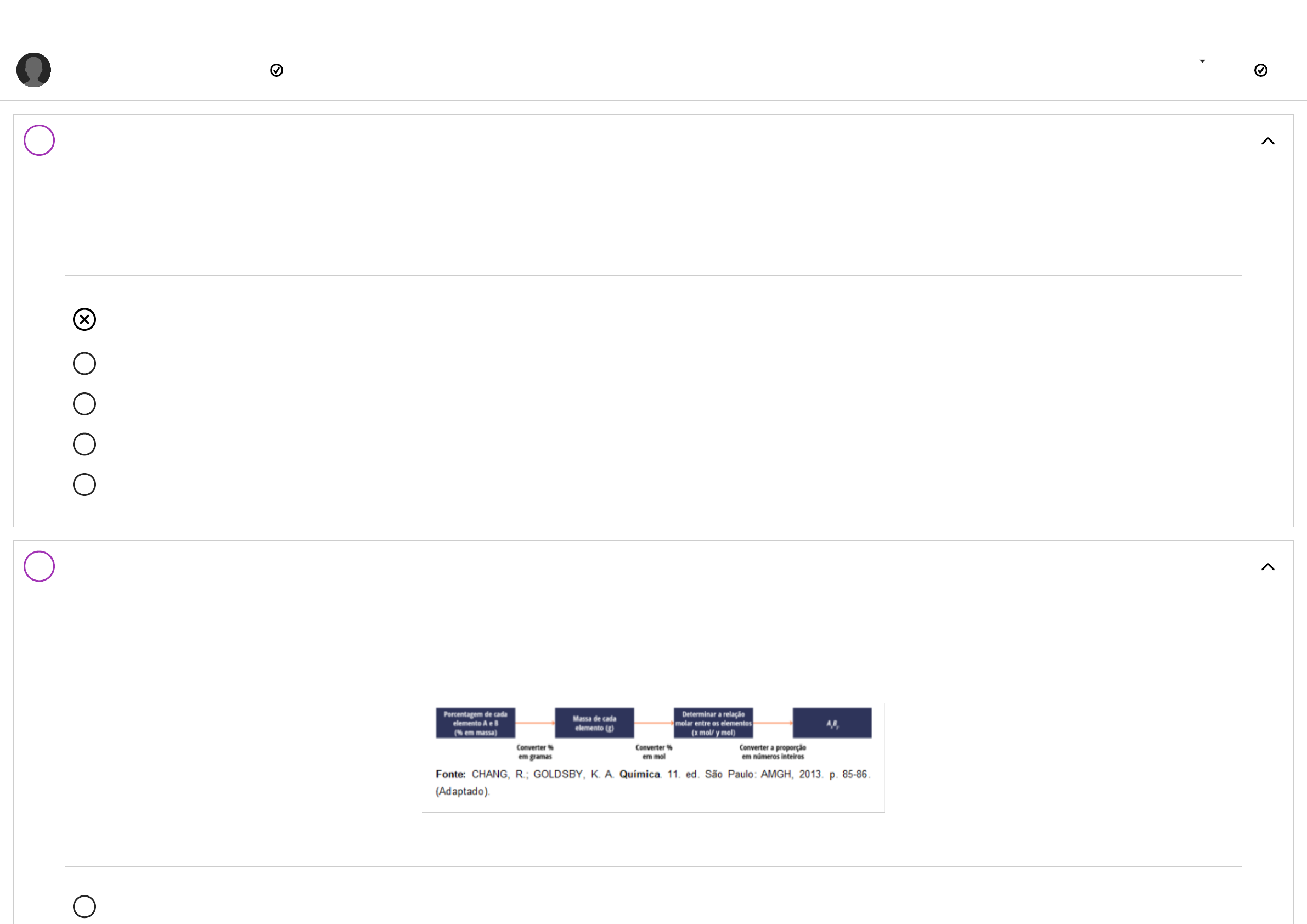 Atividade de Autoaprendizagem 3 1 MÚLTIPLA ESCOLHA INCORRETO 0 / 0 2 MÚLTIPLA ESCOLHA INCORRETO 0 / 0 Uma dúzia de bananas corresponde a exatamente 12 bananas. Na química, também se faz necessário adotar uma quantidade que facilite expressar numa escala maior o número de moléculas, átomos ou íons da matéria. Esses são bem menores do que bananas e, portanto, o número para expressá-los deve ser bem maior do que a dúzia. Essa quantidade adotada foi o mol, que demonstra o mesmo número de entidades elementares (átomos, moléculas ou outras partículas) que o número de átomos existentes em exatamente 12 gramas do isótopo 12 do carbono (12C). Fonte: BURDGE, J. Chemistry. 5. ed. New York: McGraw-Hill Education, 2020. p. 93. Considerando essas informações e o conteúdo estudado sobre os conceitos de mol, massa molar e fração molar, é correto afirmar que: Incorreta: o número de átomos de carbono em uma solução aquosa com 20 gramas de glicose (C6H12O6) é de 6,62.1022 átomos. B Resposta corretao número de mols de glicose em uma solução aquosa com 20 gramas de glicose (C6H12O6) é de 0,11 mols. C o número de mols de glicose em uma solução aquosa com 20 gramas de glicose (C6H12O6) é de 1,1 mols. D o número de moléculas de glicose em uma solução aquosa com 20 gramas de glicose (C6H12O6) é de 0,11 moléculas. E o número de moléculas de glicose em uma solução aquosa com 20 gramas de glicose (C6H12O6) é de 6,62.1023 moléculas. Leia o excerto a seguir: “A partir da fórmula conseguimos saber a massa total de cada elemento na amostra. Experimentalmente, obteremos a sua composição percentual. Comparando os dois resultados é possível estimar o grau de pureza da amostra. A composição percentual em massa é a porcentagem em massa de cada elemento em um composto. A porcentagem de composição é obtida dividindo-se a massa do elemento existente em um mol de composto pela massa molar, e multiplicando em seguida por 100.” Analogamente, o procedimento invertido pode ser realizado a partir do percentual de cada elemento para obtenção da fórmula empírica ou molecular: Considerando essas informações e o conteúdo estudado sobre fórmulas moleculares, pode-se afirmar que: A a fórmula empírica ou mínima indica o número de átomos que está presente na menor fração de uma substância molecular RECIBO: F713E3F6B5A140A4A5CD48B879BD112A TENTATIVA 1/5 (ENVIADA EM 21/04/25 19:18)Nota final Tentativa com a nota mais alta 3 MÚLTIPLA ESCOLHA INCORRETO 0 / 0 B a fórmula molecular corresponde ao número de elétrons que uma molécula pode absorver em sua estrutura molecular. C a fórmula molecular é como a identidade de um composto químico, sendo uma estrutura única e específica para cada substância. D a fórmula empírica representa uma estrutura tridimensional apresentada individualmente para cada composto molecular. E Resposta corretaa fórmula molecular representa a quantidade de átomos que está presente na menor fração de uma substância molecular. Leia o trecho a seguir: “A massa em gramas de 1 mol de certa substância (isto é, a massa em gramas por mol) é chamada de massa molar. A massa molar (em g/mol) de uma substância é sempre numericamente igual a sua massa molecular (em u). O NaCl, por exemplo, tem massa molar de 58,5 g/mol.” Fonte: BROWN, T. L.; LEMAY H. E.; BURSTEN, B. E. Química: a ciência central. 9. ed. São Paulo: Pearson Universidades, 2012. p. 79. Considerando essas informações e o conteúdo estudado sobre os conceitos de mol, massa molar e fração molar, analise as afirmat I. A massa atômica do nitrogênio molecular (N2(g)) é de 14 u. II. O íon de prata tem massa atômica de 107,9 u. A I, III e IV. B IV e V. C I, II e IV. D III e V. E Resposta corretaII e V. 4 MÚLTIPLA ESCOLHA INCORRETO 0 / 0 5 MÚLTIPLA ESCOLHA INCORRETO 0 / 0 Leia o excerto a seguir: “Um reagente limitante é como uma parte em uma fábrica de motocicletas. Imagine que só existem oito rodas e sete chassis de motos. Como cada chassi requer duas rodas, só existem rodas suficientes para quatro motos. Em outras palavras, as rodas fazem o papel de reagente limitante. Quando todas as rodas forem usadas, três chassis permanecerão sem uso porque há chassis em excesso.” Fonte: ATKINS, P. W.; JONES, L. Princípios de química: questionando a vida moderna e o meio ambiente. 5. ed. Porto Alegre: Bookman, 2012. p. F96. Considerando essas informações e o conteúdo estudado sobre reagente limitante, analise as asserções a seguir e a relação proposta entre elas: I. Na reação de 100 g carbeto de cálcio (CaC2) com 100 g água para formar hidróxido de cálcio e gás acetileno, o CaC2 é o reagente limitante. Porque: II. A razão molar da reação indica que a quantidade de H2O presente é duas vezes a de CaC2. A seguir, assinale a alternativa correta: A Resposta corretaAs asserções I e II são proposições verdadeiras, mas a II não é uma justificativa correta da I. B As asserções I e II são proposições verdadeiras, e a II é uma justificativa correta da I. C A asserção I é uma proposição falsa, e a II é uma proposição verdadeira. D As asserções I e II são proposições falsas. E A asserção I é uma proposição verdadeira, e a II é uma proposição falsa. Um mesmo composto molecular pode ser representado de diferentes formas na química, variando com as informações que desejamos transmitir ao público de interesse. Por exemplo, se a informação essencial se relacionar à identificação do composto, apenas a fórmula empírica ou mínima pode não ser suficiente. Considerando essas informações e o conteúdo estudado sobre cálculos específicos para fórmulas químicas, analise as asserções a seguir e a relação proposta entre elas: I. A fórmula condensada de uma substância molecular é uma fórmula compatível com a representação molecular completa. Porque: II. Na fórmula condensada, a função química pres