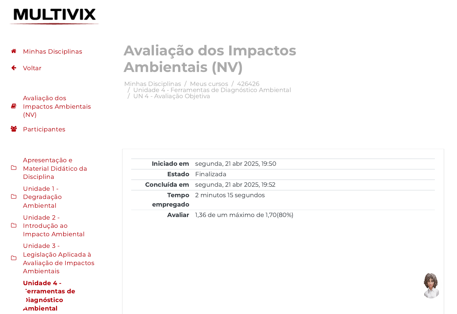 Minhas Disciplinas / Meus cursos / 426426 / Unidade 4 - Ferramentas de Diagnóstico Ambiental / UN 4 - Avaliação Objetiva Avaliação dos Impactos Ambientais (NV) Iniciado em segunda, 21 abr 2025, 19:50 Estado Finalizada Concluída em segunda, 21 abr 2025, 19:52 Tempo empregado 2 minutos 15 segundos Avaliar 1,36 de um máximo de 1,70(80%) Minhas Disciplinas Voltar Avaliação dos Impactos Ambientais (NV) Participantes Apresentação e Material Didático da Disciplina Unidade 1 - Degradação Ambiental Unidade 2 - Introdução ao Impacto Ambiental Unidade 3 - Legislação Aplicada à Avaliação de Impactos Ambientais Unidade 4 - Ferramentas de Diagnóstico Ambiental https://avap.multivix.edu.br/my/ https://avap.multivix.edu.br/course/view.php?id=33399 https://avap.multivix.edu.br/course/view.php?id=33399§ion=5 https://avap.multivix.edu.br/mod/quiz/view.php?id=1884035 https://avap.multivix.edu.br/my/ https://avap.multivix.edu.br/course/view.php?id=33399 https://avap.multivix.edu.br/user/index.php?id=33399 https://avap.multivix.edu.br/course/view.php?id=33399§ion=1 https://avap.multivix.edu.br/course/view.php?id=33399§ion=2 https://avap.multivix.edu.br/course/view.php?id=33399§ion=3 https://avap.multivix.edu.br/course/view.php?id=33399§ion=4 https://avap.multivix.edu.br/course/view.php?id=33399§ion=5 https://avap.multivix.edu.br/ https://avap.multivix.edu.br/ https://avap.multivix.edu.br/ https://avap.multivix.edu.br/ https://avap.multivix.edu.br/ https://avap.multivix.edu.br/ https://avap.multivix.edu.br/ https://avap.multivix.edu.br/ https://avap.multivix.edu.br/ https://avap.multivix.edu.br/ https://avap.multivix.edu.br/ Questão 1 Correto Atingiu 0,34 de 0,34 Desde a década de 30, o Brasil dispõe do Código de Águas – Decreto no 24.643, de 10 de julho de 1934. Entretanto, em vista do aumento das demandas e de mudanças institucionais, tal ordenamento jurídico não foi capaz de incorporar meios para combater o desequilíbrio hídrico e os conflitos de uso, tampouco de promover meios adequados para uma gestão descentralizada e participativa, exigências dos dias de hoje. Para preencher essa lacuna, foram sancionadas a Lei no 9.433, de 08 de janeiro de 1997, que instituiu a Política Nacional de Recursos Hídricos e estabeleceu o Sistema Nacional de Gerenciamento de Recursos Hídricos, e a Lei no 9.984, de 17 de julho de 2000, que criou a Agência Nacional de Águas – ANA, entidade federal encarregada da implementação dessa Política e da coordenação desse Sistema. (SETTI, A.A.; LIMA, J.E.F.W.; CHAVES, A.G.de M.; PEREIRA, I.de C. Introdução ao gerenciamento de recursos. 2ª ed. – Brasília: Agência Nacional de Energia Elétrica, Superintendência de Estudos e Informações Hidrológicas, 2000.) Especificamente falando da análise dos recursos hídricos, Richter e Azevedo Netto (2005) ressaltam que as características físicas das águas são de pouca importância na questão sanitária e, normalmente, são fáceis de determinar. (RICHTER, C. A.; AZEVEDO NETTO, J. M. Tratamento de Água: tecnologia utilizada. 6. ed. São Paulo: Blücher, 2005.) Entre as características físicas, pode-se citar Escolha uma opção: a. sólidos em suspensão, temperatura, sabor e odor e a condutividade elétrica. Minhas Disciplinas Voltar Avaliação dos Impactos Ambientais (NV) Participantes Apresentação e Material Didático da Disciplina Unidade 1 - Degradação Ambiental Unidade 2 - Introdução ao Impacto Ambiental Unidade 3 - Legislação Aplicada à Avaliação de Impactos Ambientais Unidade 4 - Ferramentas de Diagnóstico Ambiental https://avap.multivix.edu.br/my/ https://avap.multivix.edu.br/course/view.php?id=33399 https://avap.multivix.edu.br/user/index.php?id=33399 https://avap.multivix.edu.br/course/view.php?id=33399§ion=1 https://avap.multivix.edu.br/course/view.php?id=33399§ion=2 https://avap.multivix.edu.br/course/view.php?id=33399§ion=3 https://avap.multivix.edu.br/course/view.php?id=33399§ion=4 https://avap.multivix.edu.br/course/view.php?id=33399§ion=5 https://avap.multivix.edu.br/ https://avap.multivix.edu.br/ https://avap.multivix.edu.br/ https://avap.multivix.edu.br/ https://avap.multivix.edu.br/ https://avap.multivix.edu.br/ https://avap.multivix.edu.br/ https://avap.multivix.edu.br/ https://avap.multivix.edu.br/ https://avap.multivix.edu.br/ https://avap.multivix.edu.br/ b. temperatura, sabor e odor e a condutividade elétrica. c. turbidez, cor e sólidos em suspensão. d. turbidez, cor, sólidos em suspensão, temperatura, sabor e odor e a condutividade elétrica. e. turbidez, cor, temperatura, sabor e odor. Minhas Disciplinas Voltar Avaliação dos Impactos Ambientais (NV) Participantes Apresentação e Material Didático da Disciplina Unidade 1 - Degradação Ambiental Unidade 2 - Introdução ao Impacto Ambiental Unidade 3 - Legislação Aplicada à Avaliação de Impactos Ambientais Unidade 4 - Ferramentas de Diagnóstico Ambiental https://avap.multivix.edu.br/my/ https://avap.multivix.edu.br/course/view.php?id=33399 https://avap.multivix.edu.br/user/index.php?id=33399 https://avap.multivix.edu.br/course/view.php?id=33399§ion=1 https://avap.multivix.edu.br/course/view.php?id=33399§ion=2 https://avap.multivix.edu.br/course/view.php?id=33399§ion=3 https://avap.multivix.edu.br/course/view.php?id=33399§ion=4 https://avap.multivix.edu.br/course/view.php?id=33399§ion=5 https://avap.multivix.edu.br/ https://avap.multivix.edu.br/ https://avap.multivix.edu.br/ https://avap.multivix.edu.br/ https://avap.multivix.edu.br/ https://avap.multivix.edu.br/ https://avap.multivix.edu.br/ https://avap.multivix.edu.br/ https://avap.multivix.edu.br/ https://avap.multivix.edu.br/ https://avap.multivix.edu.br/ Questão 2 Correto Atingiu 0,34 de 0,34 Sánchez (2013) descreve que, em território nacional, é quase padrão a divisão do ambiente em três grandes compartimentos para fins de diagnóstico ambiental, sendo que os meios físicos englobam tudo o que diz respe