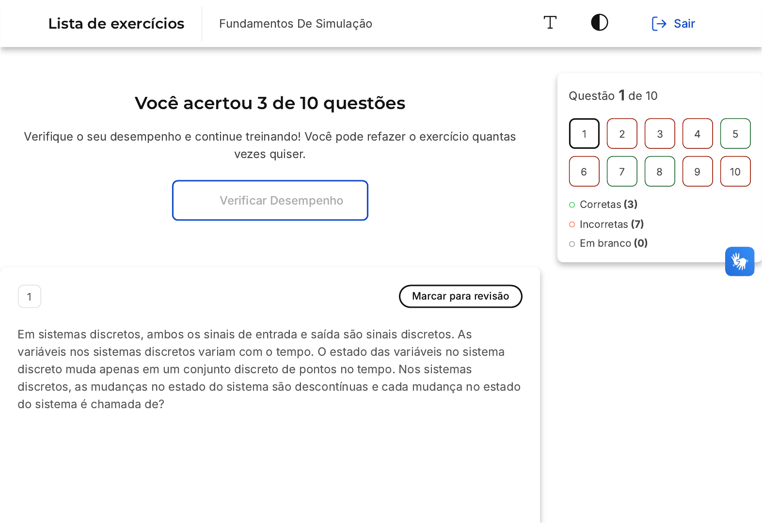 Você acertou 3 de 10 questões Verifique o seu desempenho e continue treinando! Você pode refazer o exercício quantas vezes quiser. Verificar Desempenho 1 Marcar para revisão Em sistemas discretos, ambos os sinais de entrada e saída são sinais discretos. As variáveis nos sistemas discretos variam com o tempo. O estado das variáveis no sistema discreto muda apenas em um conjunto discreto de pontos no tempo. Nos sistemas discretos, as mudanças no estado do sistema são descontínuas e cada mudança no estado do sistema é chamada de? Questão 1 de 10 Corretas (3) Incorretas (7) Em branco (0) 1 2 3 4 5 6 7 8 9 10 Lista de exercícios Fundamentos De Simulação Sair A B C D E Estado Evento Modelo Objeto Restrição Resposta incorreta Opa! A alternativa correta é a letra B. Confira o gabarito comentado! Gabarito Comentado Explicação: Em sistemas discretos, as mudanças no estado do sistema são descontínuas e cada mudança no estado do sistema é chamada de evento. A B C 2 Marcar para revisão A simulação pode ser definida como a técnica que representa o funcionamento de um sistema real. Para isso, deve ser desenvolvido um modelo que expresse matematicamente as condições de operação do sistema e as relações entre seus componentes. Em relação às principais características dos sistemas e seus modelos de simulação, considere as afirmações abaixo. I. Um sistema pode ser entendido como um conjunto de entidades que agem e interagem para atingir um objetivo lógico. II. Um sistema dinâmico deve ser representado apenas por variáveis aleatórias contínuas. III. Um modelo de simulação determinístico é aquele em que as variáveis são aleatórias discretas. Está correto o que se afirma em: I III I e II D E II e III I, II e III Resposta incorreta Opa! A alternativa correta é a letra A. Confira o gabarito comentado! Gabarito Comentado Resolução Todo sistema é composto de entrada, processamento (interação), saída. I) correta. II) Não necessariamente tem que ser variáveis aleatórias contínuas. III) Na teoria, não existe sequer uma variável aleatória na simulação determinística. 3 Marcar para revisão Entidades são os objetos dinâmicos em uma simulação. Eles são criados pelo analista, circulam e são descartados à medida que saem do sistema. Também é possível ter entidades que nunca saem do sistema, continuam circulando dentro do sistema. A descrição detalhada das restrições de entidade, relacionamentos de entidade e tipos de entidade é expressa em: A B C D E Projeto de esquema de baixo nível Design conceitual Projeto físico Projeto lógico Projeto de esquema de alto nível Resposta incorreta Opa! A alternativa correta é a letra B. Confira o gabarito comentado! Gabarito Comentado O design conceitual é uma etapa inicial no processo de desenvolvimento de um sistema. Esta fase envolve a concepção de interações, experiências, processos e estratégias. É nesse estágio que se compreende as necessidades do sistema e como atendê-las. Portanto, a descrição detalhada das restrições de entidade, relacionamentos de entidade e tipos de entidade é expressa no design conceitual. Isso ocorre porque é nessa fase que se define a estrutura geral do sistema e como as A B C D E diferentes partes irão interagir. Portanto, a alternativa correta é a B: "Design conceitual". 4 Marcar para revisão Para aplicar a simulação ao mundo real, os matemáticos devem trabalhar com cientistas e engenheiros, para transformar problemas da vida real em matemática e, então, resolver as equações resultantes. Chamamos esse processo de modelagem matemática. A função objetivo e as restrições são funções de dois tipos de variáveis: Positivo e negativo Controlável e incontrolável Forte e fraca Conhecida e desconhecida Variável e fixa Resposta incorreta Opa! A alternativa correta é a letra B. Confira o gabarito comentado! Gabarito Comentado Na modelagem matemática, a função objetivo e as restrições são funções de dois tipos de variáveis: controláveis e incontroláveis. As variáveis controláveis são aquelas que podem ser manipuladas ou ajustadas de acordo com a necessidade, enquanto as variáveis incontroláveis são aquelas que não podem ser alteradas ou controladas. A simulação é comparada a um modelo matemático, que é uma simplificação do problema para um sistema de equações que captura a essência essencial do problema. Este modelo é simples o suficiente para permitir cálculos analíticos. Uma fórmula derivada de um cálculo analítico pode fornecer uma visão clara do papel dos parâmetros nesse sistema sem ter que executar um número muito grande de cálculos. Portanto, na modelagem matemática, lidamos com esses dois tipos de variáveis: controláveis e incontroláveis. 5 Marcar para revisão Os modelos matemáticos são classificados de acordo com o tipo de equação utilizada em sua formulação. Os modelos em que o sinal de saída pode ser calculado com precisão, assim que o sinal de entrada e as condições iniciais são conhecidos, são classificados como: A B C D E Estocástico Heurístico Determinístico Fenomenológico Transubstancial Resposta correta Parabéns, você selecionou a alternativa correta. Confira o gabarito comentado! Gabarito Comentado Os modelos matemáticos podem ser classificados em diferentes tipos, como estáticos ou dinâmicos. No caso dos modelos dinâmicos, eles podem ser determinísticos ou estocásticos. Os modelos determinísticos são aqueles em que, conhecendo-se o sinal de entrada e as condições iniciais, é possível calcular com precisão o sinal de saída. Por outro lado, os modelos estocásticos incluem variáveis aleatórias em sua formulação. Além disso, os modelos podem ser discretos, que requerem atenção a eventos discretos, ou contínuos, que requerem observação em tempo integral. As opções heurísticas, fenomenológicas e transubstanciais não são classifica