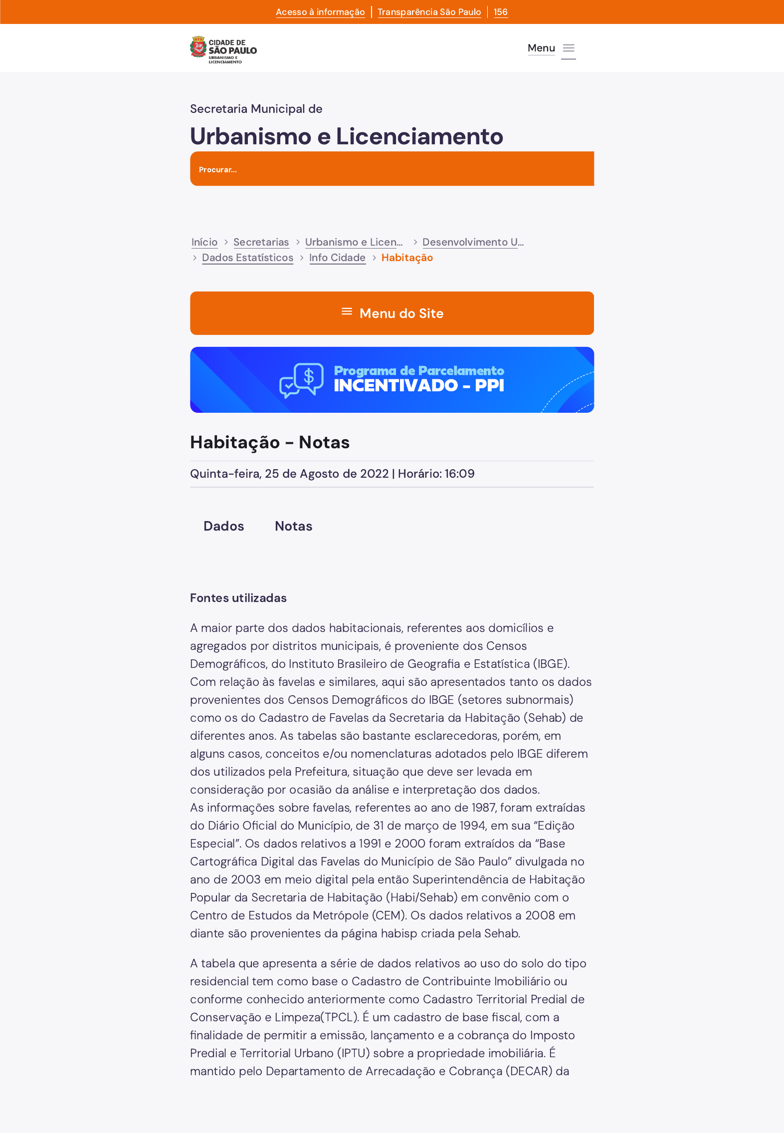 Acesso à informação Transparência São Paulo 156 Menu Secretaria Municipal de Urbanismo e Licenciamento Procurar... Início Secretarias Urbanismo e Licen… Desenvolvimento U… Dados Estatísticos Info Cidade Habitação Habitação - Notas Quinta-feira, 25 de Agosto de 2022 | Horário: 16:09 Dados Notas Fontes utilizadas A maior parte dos dados habitacionais, referentes aos domicílios e agregados por distritos municipais, é proveniente dos Censos Demográ�cos, do Instituto Brasileiro de Geogra�a e Estatística (IBGE). Com relação às favelas e similares, aqui são apresentados tanto os dados provenientes dos Censos Demográ�cos do IBGE (setores subnormais) como os do Cadastro de Favelas da Secretaria da Habitação (Sehab) de diferentes anos. As tabelas são bastante esclarecedoras, porém, em alguns casos, conceitos e/ou nomenclaturas adotados pelo IBGE diferem dos utilizados pela Prefeitura, situação que deve ser levada em consideração por ocasião da análise e interpretação dos dados. As informações sobre favelas, referentes ao ano de 1987, foram extraídas do Diário O�cial do Município, de 31 de março de 1994, em sua “Edição Especial”. Os dados relativos a 1991 e 2000 foram extraídos da “Base Cartográ�ca Digital das Favelas do Município de São Paulo” divulgada no ano de 2003 em meio digital pela então Superintendência de Habitação Popular da Secretaria de Habitação (Habi/Sehab) em convênio com o Centro de Estudos da Metrópole (CEM). Os dados relativos a 2008 em diante são provenientes da página habisp criada pela Sehab. A tabela que apresenta a série de dados relativos ao uso do solo do tipo residencial tem como base o Cadastro de Contribuinte Imobiliário ou conforme conhecido anteriormente como Cadastro Territorial Predial de Conservação e Limpeza(TPCL). É um cadastro de base �scal, com a �nalidade de permitir a emissão, lançamento e a cobrança do Imposto Predial e Territorial Urbano (IPTU) sobre a propriedade imobiliária. É mantido pelo Departamento de Arrecadação e Cobrança (DECAR) da Menu do Site http://transparencia.prefeitura.sp.gov.br/sistema-eletronico-de-informacao-ao-cidadao-e-sic/ http://transparencia.prefeitura.sp.gov.br/ https://sp156.prefeitura.sp.gov.br/portal https://capital.sp.gov.br/web/prefeitura-de-sao-paulo/ https://capital.sp.gov.br/web/prefeitura-de-sao-paulo/secretarias https://capital.sp.gov.br/web/licenciamento https://capital.sp.gov.br/web/licenciamento/desenvolvimento_urbano https://capital.sp.gov.br/web/licenciamento/desenvolvimento_urbano/dados_estatisticos https://capital.sp.gov.br/web/licenciamento/desenvolvimento_urbano/dados_estatisticos/info_cidade http://www.prefeitura.sp.gov.br/cidade/secretarias/urbanismo/dados_estatisticos/info_cidade/habitacao/index.php?p=260285 http://www.prefeitura.sp.gov.br/cidade/secretarias/urbanismo/dados_estatisticos/info_cidade/habitacao/index.php?p=260288 https://fiqueemdia.prefeitura.sp.gov.br/ppi https://fiqueemdia.prefeitura.sp.gov.br/ppi https://capital.sp.gov.br/web/licenciamento/ https://capital.sp.gov.br/web/licenciamento/ Secretaria Municipal da Fazenda (SF) da Prefeitura de São Paulo e publicado e disponibilizado com suas principais variáveis no GEOSAMPA desde 2016. No ano de 2019 estas informações referentes ao tema “Uso do Solo Urbano” no Infocidade passa por substituição da sua base de dados. Essa alteração, contudo, se dá apenas no tocante à mudança da data de coleta dos seus dados primários junto ao Cadastro da Secretaria da Fazenda (SF) já mencionado. Este acervo tem data base de coleta no mês de janeiro do ano indicado, quando da emissão geral do IPTU. Em razão da mudança na data de coleta, os dados quantitativos apresentam ligeira diferença (menos de 5%) em relação aos até então divulgados como TPCL. É importante, portanto, para efeito de comparações em novas pesquisas, a utilização da série histórica produzida com esta fonte, que passa a ser divulgado como “IPTUEG” tendo em vista a referência à Emissão Geral do IPTU. Conceitos de favela Conforme o IBGE no Censo Demográ�co-2000, favela e setores assemelhados são considerados do tipo “setor especial de aglomerado subnormal”, de�nido como aglomerado de, no mínimo, 51 unidades habitacionais em terreno alheio, dispostas, em geral, de forma desordenada, e carentes da maioria dos serviços essenciais. Já o Sistema Municipal de Habitação adotou outra conceituação em 1972, utilizada também em 1987 no Censo de Favelas e pela pesquisa contratada à Fundação Instituto de Pesquisas Econômicas (Fipe) em 1993, ambos levantamentos a cargo da Superintendência de Habitação Popular da Secretaria de Habitação (Habi/Sehab). Favelas foram então de�nidas como “aglomerados de moradias de reduzidas dimensões, construídas com materiais inadequados (madeira velha, zinco, latas e até papelão) distribuídos irregularmente em terrenos quase sempre desprovidos de serviços e de equipamentos urbanos e sociais, compondo um complexo de ordem social, econômica, sanitária, educacional e urbanística”; e núcleos foram de�nidos como aglomerados com até dez domicílios. Posteriormente, desde que a Sehab passou a trabalhar com indicadores para diagnosticar e intervir em áreas de ocupação precária, essa conceituação tem exigido uma revisão de critérios. Conceitos adotados no Censo Demográ�co 2000 Domicílio Domicílio é o local estruturalmente separado e independente que se destina a servir de habitação a uma ou mais pessoas, ou que esteja sendo utilizado como tal. Situação do domicílio Segundo a localização do domicílio, a situação é urbana ou rural, conforme de�nida por lei municipal em vigor em 1º de agosto de 2000. Em situação urbana consideram-se as áreas urbanizadas ou não, correspondentes às cidades (sedes municipais), às vilas (sedes distritais) ou às áreas urbanas isoladas. A situação rural abra