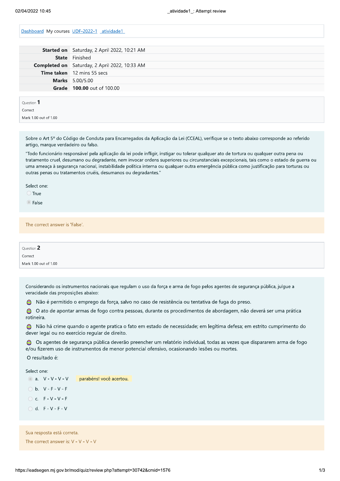 02/04/2022 10:45 Attempt review Dashboard My courses UDF-2022-1 Started on Saturday, 2 April 2022, 10:21 AM State Finished Completed on Saturday, 2 April 2022, 10:33 AM Time taken 12 mins 55 secs Marks 5.00/5.00 Grade 100.00 out of 100.00 Question 1 Correct Mark 1,00 out of Sobre o Art 5° do Código de Conduta para Encarregados da Aplicação da Lei (CCEAL), verifique se o texto abaixo corresponde ao referido artigo, marque verdadeiro ou falso. "Todo funcionário responsável pela aplicação da lei pode infligir, instigar ou tolerar qualquer ato de tortura ou qualquer outra pena ou tratamento cruel, desumano ou degradante, nem invocar ordens superiores ou circunstanciais excepcionais, tais como o estado de guerra ou uma ameaça à segurança nacional, instabilidade política interna ou qualquer outra emergência pública como justificação para torturas ou outras penas ou tratamentos cruéis, desumanos ou degradantes." Select one: True False The correct answer is 'False'. Question 2 Correct Mark out of Considerando os instrumentos nacionais que regulam o uso da força e arma de fogo pelos agentes de segurança pública, julgue a veracidade das proposições abaixo: Não é permitido emprego da força, salvo no caso de resistência ou tentativa de fuga do preso. O ato de apontar armas de fogo contra pessoas, durante os procedimentos de abordagem, não deverá ser uma prática rotineira. Não há crime quando o agente pratica o fato em estado de necessidade; em legítima defesa; em estrito cumprimento do dever legal ou no exercício regular de direito. Os agentes de segurança pública deverão preencher um relatório individual, todas as vezes que dispararem arma de fogo e/ou fizerem uso de instrumentos de menor potencial ofensivo, ocasionando lesões ou mortes. O resultado é: Select one: a. parabéns! você acertou. b. V-F-V-F C. d. Sua resposta está correta. The correct answer is: https://eadsegen.mj.gov.br/mod/quiz/review.php?attempt=30742&cmid=1576 1/302/04/2022 10:45 Attempt review Question 3 Correct Mark 1,00 out of 1,00 Julgue a assertiva abaixo e coloque verdadeiro ou falso: agente de segurança pública tem o dever de aplicar a lei e de reprimir com energia a sua transgressão em defesa da sociedade, a mesma sociedade da qual ele faz parte e de onde ele foi escolhido para se juntar à Força de Segurança Pública. "A tarefa do agente de segurança pública é delicada na medida em que se reconhece como inteiramente legítimo o uso de força, para resolução de conflitos, desde que esgotadas todas as possibilidades de negociação, persuasão e mediação." 1999) Select one: True False The correct answer is 'True'. Question 4 Correct Mark 1,00 out of Segundo Faria (1999), a tarefa do agente de segurança pública é delicada na medida em que se reconhece como inteiramente legítimo o uso da força, para resolução de conflitos, desde que esgotadas todas as possibilidades de: Select one: a. Submissão, dispersão e mediação. b. Submissão, persuasão e flexibilização. C. Negociação, dispersão e flexibilização. d. Negociação, persuasão e mediação. parabéns! você acertou. Sua resposta está correta. The correct answer is: Negociação, persuasão e mediação https://eadsegen.mj.gov.br/mod/quiz/review.php?attempt=30742&cmid=1576 2/302/04/2022 10:45 _atividade1_: Attempt review Question 5 Correct Mark out of 1.00 Considerando o Código de Conduta para Encarregados da Aplicação da Lei (CCEAL), relacione cada trecho de comentário explicativo ao artigo a que se refere, em seguida marque a sequência correta: 1. Artigo Os funcionários responsáveis pela Declaração Universal sobre os Direitos do Homem; aplicação da lei devem cumprir, a todo o momento, o Pacto Internacional sobre os Direitos Civis e Políticos. dever que a lei lhes impõe, servindo a comunidade e protegendo todas as pessoas contra atos ilegais, em conformidade com o elevado grau de responsabilidade que a sua profissão requer. 2. Artigo 2°. No cumprimento do seu dever, os emprego de armas de fogo é considerado uma funcionários responsáveis pela aplicação da lei devem medida extrema. respeitar e proteger a dignidade humana, manter e apoiar os direitos fundamentais de todas as pessoas. 3. Artigo 3°. Os funcionários responsáveis pela Inclui todos os agentes da lei, quer nomeados, quer aplicação da lei só podem empregar a força quando tal eleitos, que exerçam poderes de polícia especialmente se afigure estritamente necessário e na medida exigida poderes de prisão ou detenção. para o cumprimento do seu 4. Artigo As informações de natureza confidencial Determinadas informações podem relacionar-se em poder dos funcionários responsáveis pela aplicação com a vida particular de outras pessoas ou serem da lei devem ser mantidas em segredo, a não ser que o prejudiciais aos seus interesses e especialmente à sua cumprimento do dever ou as necessidades da justiça reputação. estritamente exijam outro comportamento. Select one: a. 1-2-3-4 b. 4-1-2-3 C. 3-4-2-1 d. parabéns! você acertou. Sua resposta está correta. The correct answer is: 2 3 1 https://eadsegen.mj.gov.br/mod/quiz/review.php?attempt=30742&cmid=1576 3/3