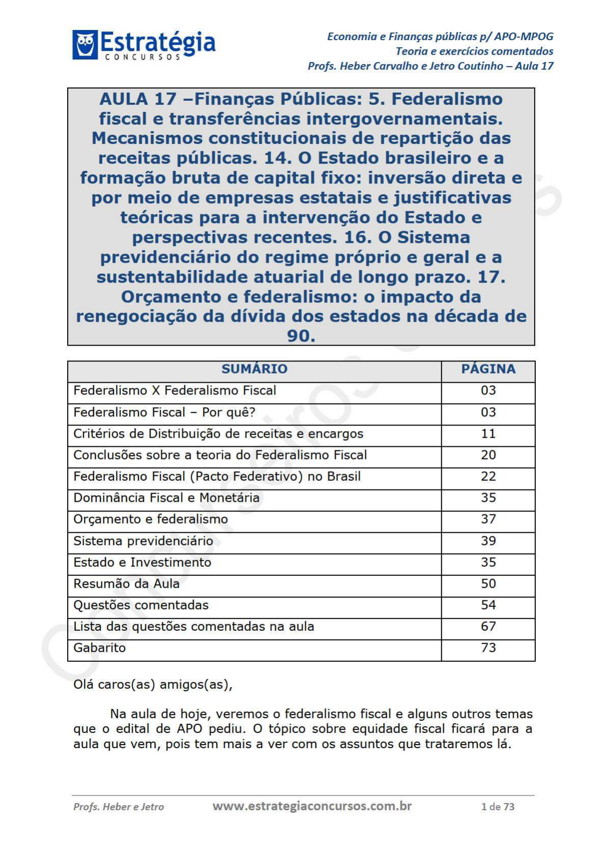 Estratégia Economia e Finanças públicas p/ APO-MPOG Teoria e exercícios comentados Profs. Heber Carvalho e Jetro Coutinho Aula 17 AULA 17 -Finanças Públicas: 5. Federalismo fiscal e transferências intergovernamentais. Mecanismos constitucionais de repartição das receitas públicas. 14. o Estado brasileiro e a formação bruta de capital fixo: inversão direta e por meio de empresas estatais e justificativas teóricas para a intervenção do Estado e perspectivas recentes. 16. Sistema previdenciário do regime próprio e geral e a sustentabilidade atuarial de longo prazo. 17. Orçamento e federalismo: impacto da renegociação da dívida dos estados na década de 90. SUMÁRIO PÁGINA Federalismo X Federalismo Fiscal 03 Federalismo Fiscal - Por quê? 03 Critérios de Distribuição de receitas e encargos 11 Conclusões sobre a teoria do Federalismo Fiscal 20 Federalismo Fiscal (Pacto Federativo) no Brasil 22 Dominância Fiscal e Monetária 35 Orçamento e federalismo 37 Sistema previdenciário 39 Estado e Investimento 35 Resumão da Aula 50 Questões comentadas 54 Lista das questões comentadas na aula 67 Gabarito 73 Olá caros(as) amigos(as), Na aula de hoje, veremos o federalismo fiscal e alguns outros temas que o edital de APO pediu. o tópico sobre equidade fiscal ficará para a aula que vem, pois tem mais a ver com os assuntos que trataremos lá. Profs. Heber e Jetro www.estrategiaconcursos.com.br 1 de 73Estratégia Economia e Finanças públicas p/ APO-MPOG CONCURSOS Teoria e exercícios comentados Infelizmente, os temas de hoje são pouco cobrados e não Profs. Heber Carvalho e Jetro Coutinho - Aula 17 gente. muitas questões disponíveis. Bom, mas vamos em frente que atrás temos vem em passadas. principais aulas problemas que ela enfrenta. Alguns desses tópicos nós já vimos Veremos hoje diversos aspectos da nossa Economia e alguns dos difícil Preocupe-se mais em entender do que em decorar, ok? Inclusive, é bem Ressaltamos que a aula de hoje é mais uma aula de a ESAF cobrar alguma coisa com base diretamente no hoje. o mais provável que esses conhecimentos ajudem a resolver que veremos questões ou até a prova Mas uma cobrança direta é outras bem decorá-la. Por isso, novamente procure entender a aula, não E aí, todos prontos? Aos estudos!! Profs. Heber e Jetro www.estrategiaconcursos.com.br 2 de 73Estratégia Economia e Finanças públicas p/ APO-MPOG Teoria e exercícios comentados Profs. Heber Carvalho e Jetro Coutinho Aula 17 1. FEDERALISMO FISCAL 1.1. Federalismo X Federalismo Fiscal o federalismo (ou Pacto Federativo) é uma técnica administrativa que possibilita o exercício do poder em grandes territórios, como o Brasil, por exemplo. Em países com grande amplitude territorial, e geralmente com populações cultural e socialmente diversificadas, o federalismo é condição quase obrigatória para a boa governabilidade e para a manutenção dos ditames democráticos. federalismo baseia-se no estabelecimento de governos de âmbitos regional e local, em divisões administrativas denominadas "estados", "municípios", "distritos", "províncias", etc. Cada um desses governos possui suas atribuições definidas, de tal forma que não haja conflito de interesses entre os entes federativos. No caso do Brasil, essa repartição de competências é definida, entre outros, nos artigos 22 a 25 da Constituição Federal de 1988. No que tange à parte tributária, a repartição de competências e de receitas (equalização tributária) é definida ao longo do capítulo constitucional que trata do Sistema Tributário Já o federalismo "fiscal" restringe o tipo de federalismo de que estamos tratando. Conforme vimos no primeiro parágrafo, o termo federalismo, sem o adjetivo "fiscal", diz respeito à divisão de poder entre os níveis de governo. Já o federalismo "fiscal" diz respeito a poderes mais específicos: o poder de "gastar" e o poder de "arrecadar". Mais especificamente, o federalismo fiscal tem estreita relação com a arrecadação de impostos e a provisão de bens e serviços públicos por parte dos diversos entes da federação. Outro termo comum para se referir ao federalismo fiscal é "descentralização fiscal", no sentido de que o federalismo fiscal é intimamente ligado à descentralização da política fiscal (política de arrecadar e gastar). 1.2. Federalismo Fiscal - Por quê? Uma importante pressuposição do federalismo fiscal repousa na ideia de que há livre negociação e um certo grau de autonomia entre as unidades da federação, de tal forma que as funções de cada uma sejam cumpridas, bem como haja uma correta e justa distribuição dos recursos exigidos da sociedade (tais recursos advêm dos tributos). 1 Essa repartição de competências e receitas tributárias é estudada a fundo, do ponto de vista normativo, no Direito Tributário e/ou no Direito Constitucional (na parte de Sistema Tributário Nacional). Profs. Heber e Jetro www.estrategiaconcursos.com.br 3 de 73Estratégia Economia e Finanças públicas p/ APO-MPOG Teoria e exercícios comentados Profs. Heber Carvalho e Jetro Aula 17 Assim, mais uma vez, você pode que o federalismo fiscal significa uma divisão de tarefas entre os diferentes níveis de governo. No Brasil, estes níveis de governo são representados por: União, estados e municípios (o Distrito Federal acumula as funções de Estado e Município). Nesta divisão de tarefas, de um modo bastante amplo, podemos destacar as duas principais tarefas de uma unidade federativa: os tributos de sua responsabilidade (definidos pela Constituição Federal) e ofertar os serviços públicos de sua responsabilidade (saúde, educação, segurança, etc). Neste ponto inicial da aula, em que já definimos o que é federalismo fiscal, nós podemos nos perguntar: por que é que existe o federalismo fiscal? Não seria muito melhor apenas um governo central arrecadar os tributos e administrar os gastos públicos. Seria muito mais simpl