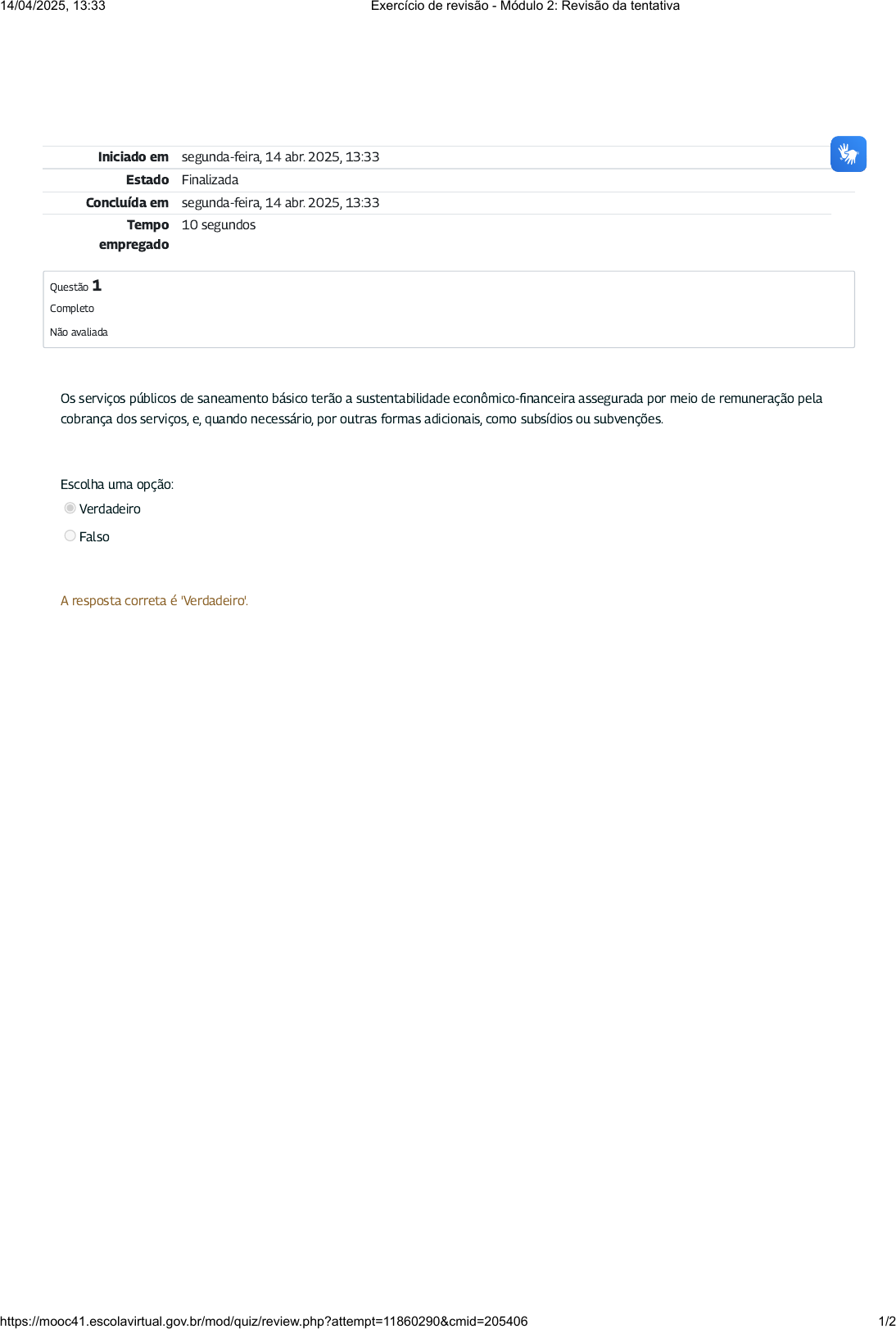 Iniciado em segunda-feira, 14 abr. 2025, 13:33 Estado Finalizada Concluída em segunda-feira, 14 abr. 2025, 13:33 Tempo empregado 10 segundos Questão 1 Completo Não avaliada Os serviços públicos de saneamento básico terão a sustentabilidade econômico-�nanceira assegurada por meio de remuneração pela cobrança dos serviços, e, quando necessário, por outras formas adicionais, como subsídios ou subvenções. Escolha uma opção: Verdadeiro Falso A resposta correta é 'Verdadeiro'. 14/04/2025, 13:33 Exercício de revisão - Módulo 2: Revisão da tentativa https://mooc41.escolavirtual.gov.br/mod/quiz/review.php?attempt=11860290&cmid=205406 1/2 14/04/2025, 13:33 Exercício de revisão - Módulo 2: Revisão da tentativa https://mooc41.escolavirtual.gov.br/mod/quiz/review.php?attempt=11860290&cmid=205406 2/2