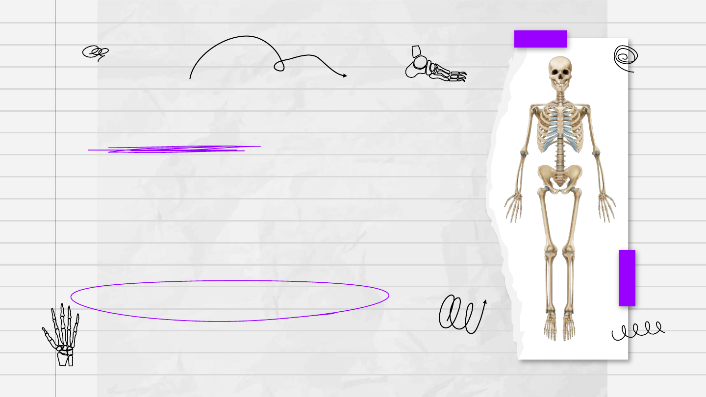 Anatomia Sistema Esquelético Conceito O Sistema Esquelético compreende um conjunto de ossos e cartilagens (denominado esqueleto), juntamente com ligamentos e tendões, que se interligam com o intuito de formar o arcabouço do corpo humano. Há aproximadamente 206 ossos em indivíduos adultos. Crianças possuem um número maior de ossos, pois estão unidos a cartilagens que conferem maior flexibilidade ao corpo no momento do parto. No decorrer do crescimento, esses ossos se unem, formando um só. Funções Proteção de órgãos vitais; Base mecânica para locomoção; Armazenamento de íons e minerais; Produção de células sanguíneas; Suporte para partes moles do corpo; Suporte para músculos e demais tecidos; Promove forma e crescimento do corpo. OSSOS - TECIDO ÓSSEO Carboidratos, proteínas, gordura, colágeno Matriz Orgânica Matriz Inorgânica Cálcio + Fósforo, potássio, sódio, magnésio, bicarbonato A porção orgânica do osso é responsável pela sua resistência e elasticidade. Já a porção inorgânica é responsável pela dureza e rigidez por conta da cristalização do cálcio. Periósteo • É uma membrana fibrosa e celular que envolve toda a extensão dos ossos. • O periósteo é responsável pelo crescimento do osso, pois suas células também estimulam o seu crescimento, desempenhando um importante papel na consolidação das fraturas. Cortical ou Compacta • É a região óssea formada de osso compacto, ou seja, de osso rígido, denso. • Geralmente encontram-se na diáfise, região alongada do osso, conferindo proteção, suporte e resistência. Esponjosa • É a região óssea formada de osso esponjoso. • É formado por uma rede tridimensional de finas tubérculas, ou trabéculas, que se emaranham entre si, deixando espaços que são preenchidos pela medula óssea. • A esponjosa é na epífise e na metáfise. Confere aspecto poroso, dando maior “maciez”, flexibilidade a região onde se encontra. Cartilagem Articular • É um tipo de cartilagem que não se calcifica e que recobre as superfícies articulares das peças ósseas. • Tem como função reduzir o atrito e amortecer choques. • Repousa numa fina camada de osso cortical/compacto. Medula Óssea • A medula óssea ocupa o canal medular da diáfise e os espaços intertrabeculares dos ossos de estrutura esponjosa. • Possui medula amarela, assim chamada por apresentar conteúdo gorduroso, que não possui função hematopoiética, a não ser que sofra estímulos em casos patológicos. • Além da amarela, apresenta medula vermelha, que tem função hematopoiética, situada principalmente no canal medular de ossos longos. Canal medularEspaços intertrabeculares Função Hematopoiética: Produção de células sanguíneas Coleta de Medula Óssea Vascularização • Os ossos são irrigados por diversos vasos sanguíneos. • Esses vasos são responsáveis por levar os nutrientes e substâncias importantes para a saúde dos ossos, • Assim como para levar para a corrente sanguínea o sangue produzido na medula óssea Número de Ossos M. SUPERIORES TÓRAXABDÔMEN PESCOÇO CABEÇA M. INFERIORES Vértebras = 7 Osso hióide = 1 Vértebras lombares = 5 Sacro =1 Cóccix =1 Cintura pélvica = 1 Coxa = 1 Joelho = 1 Perna = 2 Pé = 26 Cintura escapular = 2 Braço = 1 Antebraço = 2 Mão = 27 Costelas =24 Vértebras =12 Esterno =1 Crânio = 08 Face = 14 TIPOS DE OSSOS Possui comprimento maior que a largura, constituídos por um corpo e uma extremidade. Por serem levemente encurvados, garantem uma maior resistência, absorvendo o estresse mecânico do peso corporal. Suas diáfises são formadas por tecido ósseo compacto e grande quantidade de tecido esponjoso na epífise. São ossos finos e compostos por duas lâminas paralelas de tecido ósseo compacto, com uma camada de osso esponjoso entre elas. Garantem proteção e geram grande área de inserção de músculos. Se assemelham a um cubo, com comprimento muito similar à largura. É composto por osso esponjoso, exceto na superfície, que se encontra tecido compacto. Longos Planos Alongados Curtos São ossos longos, porém achatados e sem a presença de um canal central. TIPOS DE OSSOS São ocos, com cavidades cheias de ar e revestidas por mucosa, apresentando pequeno peso em relação ao volume. Estão presentes no interior de alguns tendões que realizam considerável fricção, tensão e estresse físico. Podem variar de tamanho e número e de pessoa para pessoa. São ossos com forma complexa, que possuem quantidades variáveis de osso esponjoso e compacto. Pneumáticos Sesamóides Suturais Irregulares Pequenos ossos localizados dentro das articulações, denominadas suturas. Número de Ossos Estrutura dos Ossos Longos Metáfise São as extremidades alargadas de um osso longo. A epífise de um osso o une a um segundo osso, em uma articulação. Cada epífise consiste de uma fina camada de osso compacto que reveste o osso esponjoso, recobertas por cartilagem. Epífise Diáfise É a haste longa do osso, constituída principalmente de tecido ósseo compacto, proporcionando considerável resistência ao osso longo. Parte dilatada da diáfise, mais próxima da epífise. É a região onde o osso cresce. Divisão do Esqueleto O esqueleto pode ser dividido anatomicamente em: Esqueleto Axial = compreende os ossos da cabeça, pescoço e tronco. Esqueleto Apendicular = composta pelos membros superiores, inferiores e ossos que realizam a ligação entre axial e apendicular. Esqueleto Axial OSSOS DO CRÂNIO Os ossos do crânio são divididos em duas porções: neurocrânio e viscerocrânio. Neurocrânio = são os ossos do crânio que fazem contato direto com o sistema nervoso. (08 ossos) Esqueleto Axial OSSOS DO CRÂNIO Viscerocrânio = são formados pelos ossos da face. (14 ossos) Esqueleto Axial VISTA INFERIOR DO CRÂNIO VISTA SUPERIOR DO CRÂNIO Esqueleto Axial CAIXA TORÁXICA A caixa torácica é formada por ossos denominados costelas, que, em sua maior