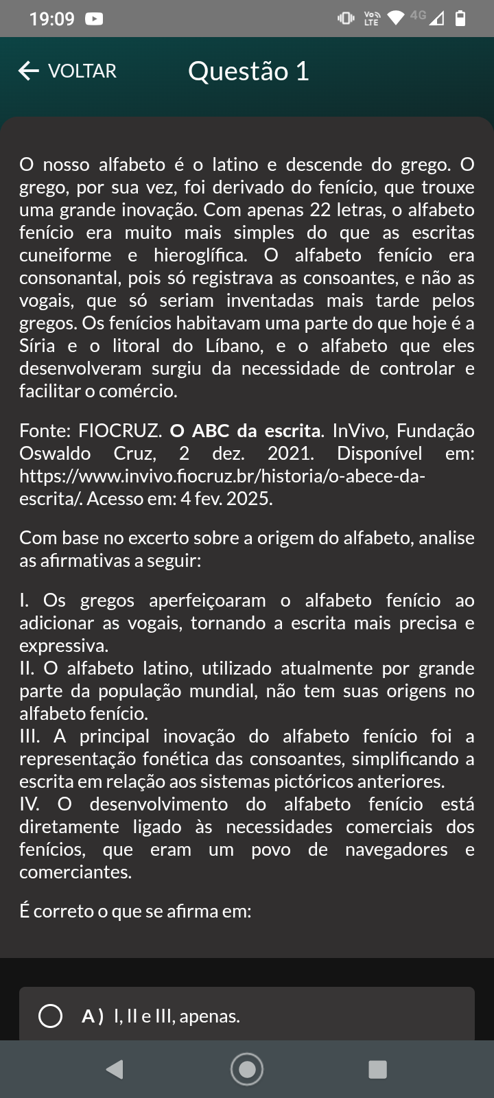 19:09 4G LTE VOLTAR Questão 1 O nosso alfabeto é O latino e descende do grego. O grego, por sua vez, foi derivado do fenício, que trouxe uma grande inovação. Com apenas 22 letras, O alfabeto fenício era muito mais simples do que as escritas cuneiforme e hieroglífica. O alfabeto fenício era consonantal, pois só registrava as consoantes, e não as vogais, que só seriam inventadas mais tarde pelos gregos. Os fenícios habitavam uma parte do que hoje é a Síria e O litoral do Líbano, e O alfabeto que eles desenvolveram surgiu da necessidade de controlar e facilitar O comércio. Fonte: FIOCRUZ. O ABC da escrita. InVivo, Fundação Oswaldo Cruz, 2 dez. 2021. Disponível em: escrita/ Acesso em: 4 fev. 2025. Com base no excerto sobre a origem do alfabeto, analise as afirmativas a seguir: I. Os gregos aperfeiçoaram O alfabeto fenício ao adicionar as vogais, tornando a escrita mais precisa e expressiva. II. O alfabeto latino, utilizado atualmente por grande parte da população mundial, não tem suas origens no alfabeto fenício. III. A principal inovação do alfabeto fenício foi a representação fonética das consoantes, simplificando a escrita em relação aos sistemas pictóricos anteriores. IV. O desenvolvimento do alfabeto fenício está diretamente ligado às necessidades comerciais dos fenícios, que eram um povo de navegadores e comerciantes. É correto O que se afirma em: A) I, e III, apenas.
