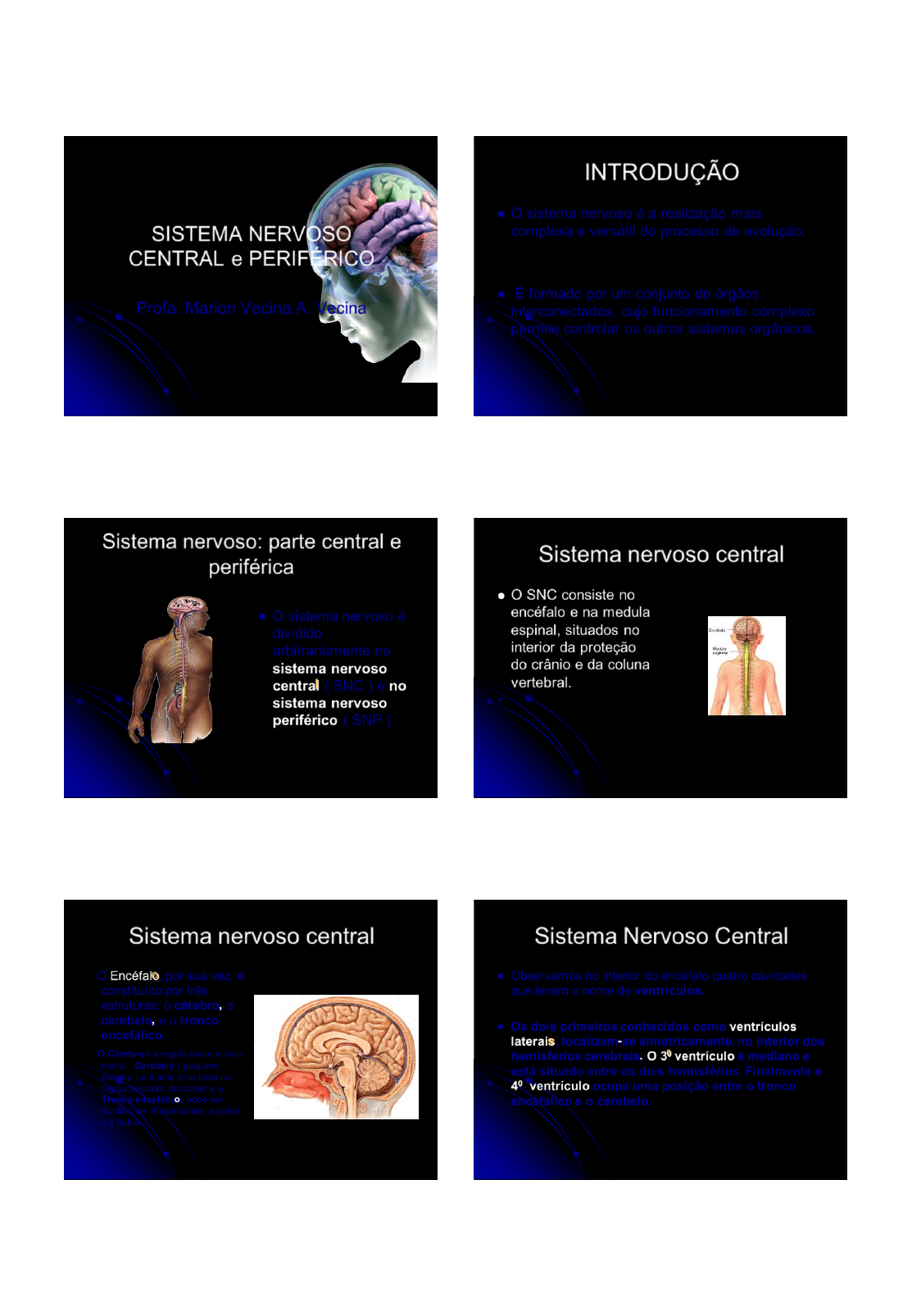10/10/2023 1 SISTEMA NERVOSO CENTRAL e PERIFÉRICO Profa. Marion Vecina A. Vecina INTRODUÇÃO ⚫ O sistema nervoso é a realização mais complexa e versátil do processo de evolução. ⚫ É formado por um conjunto de órgãos interconectados, cujo funcionamento complexo permite controlar os outros sistemas orgânicos. Sistema nervoso: parte central e periférica ⚫ O sistema nervoso é dividido arbitrariamente no sistema nervoso central ( SNC ) e no sistema nervoso periférico ( SNP ) Sistema nervoso central ⚫ O SNC consiste no encéfalo e na medula espinal, situados no interior da proteção do crânio e da coluna vertebral. * Sistema nervoso central O Encéfalo, por sua vez, é constituído por três estruturas: o cérebro, o cerebelo, e o tronco encefálico. O Cérebro é a região maior e mais rostral, Cerebelo ( pequeno cérebro ) é menor e se situa na região posterior do crânio e o Tronco encefálico, pode ser dividido em mesencéfalo, a ponte e o bulbo. Sistema Nervoso Central ⚫ Observamos no interior do encéfalo quatro cavidades que levam o nome de ventrículos. ⚫ Os dois primeiros conhecidos como ventrículos laterais, localizam-se simetricamente, no interior dos hemisférios cerebrais. O 30 ventrículo é mediano e está situado entre os dois hemisférios. Finalmente o 40 ventrículo ocupa uma posição entre o tronco encefálico e o cerebelo. 10/10/2023 2 Ventrículos Cerebrais Sistema nervoso periférico ⚫ A parte periférica do sistema nervoso ( SNP ) constitui a ligação entre o SNC e as estruturas na periferia do corpo, ⚫ A parte periférica do sistema nervoso consiste em nervos, que são prolongamentos neuronais e que tem origem na medula espinal ou no encéfalo. Sistema nervoso periférico ⚫ Os Nervos que tem origem na medula espinal são chamados de nervos espinais e nervos que tem origem no encéfalo são chamados nervos cranianos. Estruturas Cerebrais ⚫ Córtex Cerebral. A palavra córtex vem do latim para "casca". Isto porque o córtex é a camada mais externa do cérebro. A espessura do córtex cerebral varia de 2 à 6 mm. O lado esquerdo e direito do córtex cerebral são ligados por um feixe grosso de fibras nervosas chamado de corpo caloso. ⚫ Funções: Pensamento,Movimento voluntário ,Linguagem Julgamento, Percepção. Estruturas Cerebrais ⚫ Cerebelo, A palavra cerebelo vem do latim para "pequeno cérebro." O cerebelo fica localizado posteriormente ao tronco encefálico e em posição inferior à região mais posterior do cérebro. Função: ⚫ Coordenação dos movimentos, manutenção da postura, regulação do tônus muscular, motricidade fina, controle do equilíbrio, atividades rápidas. Divisão Anatômica ⚫ O cerebelo tem uma porção mediana, o vérmis, que é ladeado por duas massas laterais, os hemisférios cerebelares. A superfície do cerebelo é intensamente pregueada apresentando-se sob a forma de lâminas transversais de tecido nervoso, que são separadas por sulcos. Alguns sulcos mais profundos são denominados fissuras do cerebelo. 10/10/2023 3 Divisão Anatômica ⚫ É constituído por um centro de substância branca, o corpo medular do cerebelo, revestida externamente por uma fina camada de substância cinzenta, o córtex cerebelar. ⚫ Cerebelo Divisão Anatômica ⚫ Está situado no interior da cavidade craniana (na fossa cerebelar), inferiormente ao cérebro e posteriormente ao tronco encefálico. Está separado do cérebro por uma prega da dura-máter, a tenda do cerebelo. Estruturas Cerebrais ⚫ O Tronco Encefálico, porção do sistema nervoso central imediatamente rostral (cranial) à medula espinal, divide-se em mesencéfalo, ponte e bulbo. Condução nervosa e controle dos sistemas cardiovascular e respiratório Tronco encefálico ⚫ O MESENCÉFALO existem quatro eminências arredondadas que são os colículos superiores e os colículos inferiores. Os colículos constituem o chamado teto do mesencéfalo http://www.afh.bio.br/nervoso/nervoso3.asp#di visao Tronco encefálico ⚫ A PONTE É a porção média do tronco encefálico. Sua superfície anterior é marcada pela presença de estriações transversais, causadas por numerosos feixes de fibras, que penetram no cerebelo. http://www.afh.bio.br/nervoso/nervoso3.asp#div isao Tronco Encefálico ⚫ O BULBO, É a continuação direta da medula espinal e com ela se limita por uma linha que tangencia o nascimento do primeiro nervo cervical ( C1). Entre a fissura mediana anterior e o sulco lateral anterior, de cada lado, localiza-se uma eminência, denominada pirâmide. 10/10/2023 4 Tronco Encefálico ⚫ As pirâmides são constituídas por fibras motoras que conduzem impulsos nervosos que descem de áreas da superfície cerebral em direção à medula espinal. Essas fibras cruzam o plano mediano na região caudal do bulbo. Por causa desse cruzamento, o hemisfério cerebral esquerdo controla a musculatura do lado direito do corpo, ocorrendo o inverso com o hemisfério cerebral direito. DECUSSAÇÃO DAS PIRÂMIDES PIRÂMIDES OLIVA Cérebro ⚫ O cérebro, a porção mais rostral e mais desenvolvida do SNC, é derivada de duas das vesículas embrionárias encefálicas: o diencéfalo e o telencéfalo. Revestimento: CÓRTEX CEREBRAL - (MASSA CINZENTA- corpos de células neuronais ) Preenchimento: MASSA BRANCA - prolongamentos dos neurônios ( neurônios). - Massa: 1,2 Kg (2% massa corpórea) TELENCÉFALO ⚫ Telencéfalo, constitui os hemisférios cerebrais. ⚫ Localização: Cavidade craniana, ocupando 80% da mesma. ⚫ Funções: Motora, sensitiva e sensorial. Função específica ⚫ Cada lobo apresenta uma função específica: ⚫ O lobo frontal é o lobo que controla a personalidade, funções comportamentais, funções intelectuais, ⚫ O lobo temporal é o centro que controla o paladar, audição, olfato e da interpretação a linguagem falada. ⚫ O lobo parietal coordena e interpreta as informações sensitivas, ⚫ O lobo occipital interpreta os