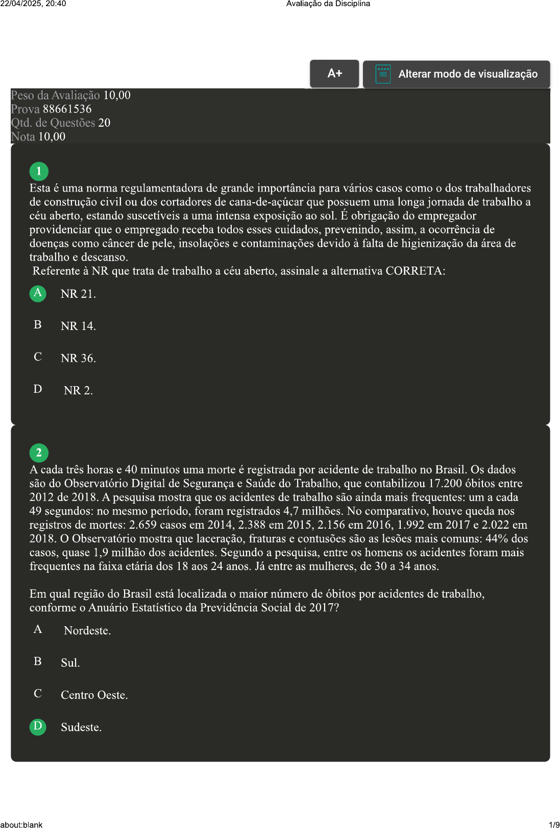 22/04/2025, 20:40 Avaliação da Disciplina A+ Alterar modo de visualização Peso da Avaliação 10,00 Prova 88661536 Qtd. de Questões 20 Nota 10,00 1 Esta é uma norma regulamentadora de grande importância para vários casos como dos trabalhadores de construção civil ou dos cortadores de que possuem uma longa jornada de trabalho a céu aberto, estando suscetíveis a uma intensa exposição ao sol. É obrigação do empregador providenciar que empregado receba todos esses cuidados, prevenindo, assim, a ocorrência de doenças como câncer de pele, insolações e contaminações devido à falta de higienização da área de trabalho e descanso. Referente à NR que trata de trabalho a céu aberto, assinale a alternativa CORRETA: A NR 21. B NR 14. C NR 36. D 2 A cada três horas e 40 minutos uma morte é registrada por acidente de trabalho no Brasil. Os dados são do Observatório Digital de Segurança e Saúde do Trabalho, que contabilizou 17.200 óbitos entre 2012 de 2018. A pesquisa mostra que os acidentes de trabalho são ainda mais frequentes: um a cada 49 segundos: no mesmo período, foram registrados 4,7 milhões. No comparativo, houve queda nos registros de mortes: 2.659 casos em 2014, 2.388 em 2015, 2.156 em 2016, 1.992 em 2017 e 2.022 em 2018. O Observatório mostra que laceração, fraturas e contusões são as lesões mais comuns: 44% dos casos, quase 1,9 milhão dos acidentes. Segundo a pesquisa, entre os homens os acidentes foram mais frequentes na faixa etária dos 18 aos 24 anos. Já entre as mulheres, de 30 a 34 anos. Em qual região do Brasil está localizada maior número de óbitos por acidentes de trabalho, conforme Anuário Estatístico da Previdência Social de 2017? A Nordeste. B Sul. C Centro Oeste. D Sudeste. about:blank 1/922/04/2025, 20:40 Avaliação da Disciplina 3 Para proteger os trabalhadores contra os riscos ambientais presentes no local de trabalho, é preciso identificar os agentes ambientais, tempo de exposição para cada processo e suas funções. Os limites de tolerância são a concentração ou a intensidade máxima ou mínima do tempo de exposição a uma determinada natureza do agente para que não cause danos à saúde e integridade física do trabalhador durante a jornada de trabalho. Qual NR estabelece níveis de tolerância dos agentes de risco a fim de caracterizar ambiente do trabalho como insalubre? A NR 15 B NR 9 C NR 10 D NR 12 4 [...] Sempre que a empresa for contratar um novo colaborador, ou quando ocorrer alguma alteração nas condições de trabalho até mesmo com a ocorrência de um acidente mais grave é necessário realizar novos treinamentos, a fim de capacitação ou atualização dos procedimentos. Referente à NR 34, assinale a alternativa CORRETA: A Trabalho em Altura. B Condições e meio ambiente de trabalho na indústria da construção e reparação C Segurança e saúde no trabalho em estabelecimentos de assistência à saúde. D Segurança e saúde no trabalho em empresas de abate e processamento de carnes e derivados. 5 Trabalhar em um ambiente seguro é um direito de todas as pessoas, cabendo as empresas proporcionar esse ambiente, prezando sempre pela segurança e bem-estar dos seus funcionários, uma vez que um local de trabalho harmonioso é um estímulo para que os empregados desempenhem da melhor maneira as suas funções. Uma das maneiras de proporcionar tudo isso é investindo na segurança do trabalho e implantando na empresa um Serviço Especializado em Engenharia de Segurança e em Medicina do Trabalho, SESMT, pois esse serviço tem como objetivo trabalhar na prevenção e no tratamento de doenças ocupacionais preservando assim a saúde dos trabalhadores. FONTE: Acesso em: 19 out. 2019. Qual NR estabelece critérios para a composição do quadro de profissionais que devem compor SESMT? A NR 3. B about:blank 2/922/04/2025, 20:40 Avaliação da Disciplina C NR 30. D NR 4. 6 Um levantamento publicado na Revista de Ciências da Saúde Nova Esperança, realizado por pesquisadoras da Faculdade de Enfermagem Nova Esperança (FACENE), constatou que trabalhadores da área da saúde estão mais sujeitos a infecções como Hepatite B e tuberculose pulmonar, citomegalovirus (CMV), HIV, rubéola, herpes simples, herpes zóster, gastroenterite infecciosa e infecções respiratórias por vírus. Outro estudo, conduzido por pesquisadoras da Universidade Federal da Paraíba (UFPB), analisou dados da CIPA de um hospital universitário e concluiu que os acidentes mais frequentes envolvem material biológico. Considerando texto a seguir, marque qual a NR está sendo abordada: "Estabelece requisitos para implantação de ações voltadas à segurança e saúde dos trabalhadores da área da saúde". A NR 26. B NR 31. C NR 11. D NR 32. 7 A explosão de uma caldeira na cervejaria Heineken, em (SP), que terminou na morte de quatro trabalhadores em janeiro deste ano, foi causada pela operação do equipamento com nível d água abaixo do mínimo permitido. Essa é a conclusão da comissão interna de investigação criada pela empresa para investigar as causas do acidente. O Ministério do Trabalho ainda não concluiu a apuração oficial que deve ser finalizada na primeira quinzena de dezembro. O laudo da empresa deve auxiliar a conclusão do trabalho dos auditores do órgão. A caldeira explodiu em 28 de janeiro de 2016, durante uma manutenção periódica feita por uma empresa terceirizada especializada na atividade. FONTE: Acesso em: 21 out. 2019. Qual NR Regulamenta a instalação, operação e manutenção de caldeiras para prevenir acidentes do trabalho? A NR 1. B NR 13. C NR 12. D about:blank 3/922/04/2025, 20:40 Avaliação da Disciplina 8 O Fator Acidentário de Prevenção FAP é um multiplicador, atualmente calculado por estabelecimento, que varia de 0,5000 a 2,0000, a ser aplicado sobre as alíquotas de 1%, 2% ou 3% da tarifação coletiva por subclasse econômica, incidentes sobre a folha de salários das empresas