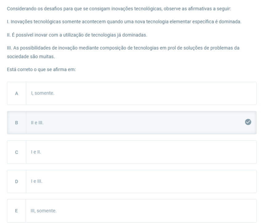 Considerando os desafios para que se consigam inovações tecnológicas, observe as afirmativas a seguir: I. Inovações tecnológicas somente acontecem quando uma nova tecnologia elementar específica é dominada. II. É possível inovar com a utilização de tecnologias já dominadas. III. As possibilidades de inovação mediante composição de tecnologias em prol de soluções de problemas da sociedade são muitas. Está correto o que se afirma em: A I, B II e III. C e II. D III. E III, somente.