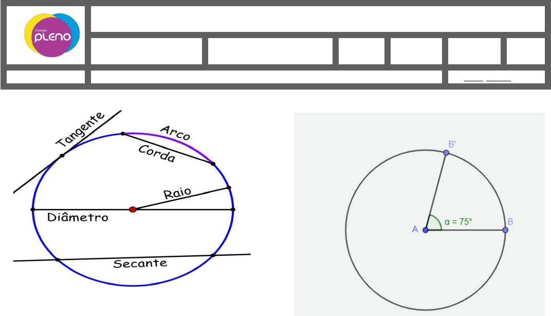 FICHA GEOMETRIA – CIRCUNFERÊNCIAS PROFESSOR (A) DARLAN SÉRIE TURMA A NOME / /2025 1-Um prato circular com comprimento da circunferência medindo 84,78 cm tem o diâmetro igual a: 13,5 cm. 15,5 cm. 26 cm. 27 cm. 36 cm. 2-Na fazendo do Seu Sebastião, o cultivo de milho é feito em uma área delimitada por uma circunferência. Para evitar invasões de animais na plantação, ele decidiu cercá-la com arame farpado, dando 4 voltas completas. Sabendo que o diâmetro da circunferência é de 1 km, a quantidade mínima de arame necessária para cercar essa área é igual a: (Use π = 3) A) 3 km B) 6 km C) 12 km D) 20 km E) 24 km 3-Sobre a circunferência, julgue as afirmativas a seguir: I → A circunferência de centro O e raio r é um conjunto de todos os pontos cuja distância até O é igual a r. II → O comprimento do diâmetro é sempre igual à metade do comprimento do raio. III → A circunferência é uma área plana limitada por um círculo. Marque a alternativa correta: A) Somente a afirmativa I é verdadeira. B) Somente a afirmativa II é verdadeira. C) Somente a afirmativa III é verdadeira. D) Todas as afirmativas são falsas. 4-Qual é o comprimento de um arco cujo ângulo central é de 45º, sabendo que o raio da circunferência mede 2 cm? (CONSIDERE PI =3,14) 5-Analise a imagem a seguir, e calcule a imagem do arco que vai do ponto B até o ponto B’, sabendo que o raio mede 3 u.m. A) 2π B) 1,5π C) 0,75π D) 0,5π E) 0,25π 6-Se, numa circunferência, o comprimento mede 21 metros, e sabendo que existe um ângulo central cuja medida do comprimento de um arco é de 5,25 metros, então a medida desse ângulo é igual a: A) 30º B) 45º C) 60º D) 75º E) 90º 7-Um pêndulo de 20 cm de comprimento oscila entre A e A’ e percorre um arco cujo ângulo central é de 20º. Aproximadamente, o comprimento da trajetória descrita pela sua extremidade entre A e A’ é de: (use π=3) A) 3,6 cm B) 4,8 cm C) 6,7 cm D) 7,2 cm E) 8,0 cm 8-Dentro das cozinhas, é bastante comum que seja utilizada a panela de pressão, que possui em sua tampa um elástico, com objetivo de evitar a saída do vapor e acelerar o processo de cozimento. Suponha que uma panela possui uma tampa totalmente circular, com 6 cm de raio. O comprimento do elástico dessa tampa deve ser igual a: (Use π = 3,1) A) 34,9 cm B) 35,0 cm C) 35,4 cm D) 36,6 cm E) 37,2 cm 9-(Enem 2014 – PPL) Um homem, determinado a melhorar sua saúde, resolveu andar diariamente numa praça circular que há em frente à sua casa. Todos os dias ele dá exatamente 15 voltas em torno da praça, que tem 50 m de raio. Qual é a distância percorrida por esse homem em sua caminhada diária? (Use π = 3,0) A) 0,30 km B) 0,75 km C) 1,50 km D) 2,25 km E) 4,50 km 10-(IFG 2015) Dois círculos, C1 e C2, possuem raios com medidas 3x e x+5, em cm, respectivamente. Sabe-se que a razão entre o comprimento de C1 e o comprimento de C2 é igual a 2. Dessa forma, é correto afirmar que as áreas de C1 e C2 valem em cm², respectivamente: (use π = 3,14) A) 900 π e 225 π. B) 920 π e 240 π. C)905 π e 255 π. D) 910 π e 235 π. 11-(Enem 2019) Em um condomínio, uma área pavimentada, que tem a forma de um círculo com diâmetro medindo 6 m, é cercada por grama. A administração do condomínio deseja ampliar essa área, mantendo seu formato circular e aumentando, em 8 m, o diâmetro dessa região, mantendo o revestimento da parte já existente. O condomínio dispõe, em estoque, de material suficiente para pavimentar mais 100 m² de área. O síndico do condomínio avaliará se esse material disponível será suficiente para pavimentar a região a ser ampliada. A conclusão correta a que o síndico deverá chegar, considerando a nova área a ser pavimentada, é a de que o material disponível em estoque: (Use π = 3) A) será suficiente, pois a área da nova região a ser pavimentada mede 21 m². B) será suficiente, pois a área da nova região a ser pavimentada mede 24 m². C) será suficiente, pois a área da nova região a ser pavimentada mede 48 m². D) não será suficiente, pois a área da nova região a ser pavimentada mede 108 m². E) não será suficiente, pois a área da nova região a ser pavimentada mede 120 m². 12-Em uma fábrica de embalagens, a tampa de determinado produto possui área igual a 78,5 cm². Sabendo que ele possui formato circular e utilizando 3,14 como aproximação para π, o raio dessa tampa é igual a: A) 5 cm B) 6 cm C) 8 cm D) 9 cm E) 10 cm 13-Sobre a circunferência, julgue as afirmativas a seguir. I → O diâmetro é um segmento de reta que liga uma extremidade a outra da circunferência, passando pelo centro. II → A corda é um segmento de reta que liga um ponto da circunferência ao seu centro. III → A medida do raio da circunferência é sempre igual à metade da medida do seu diâmetro. Marque a alternativa correta: A) Somente a afirmativa I é falsa. B) Somente a afirmativa II é falsa. C) Somente a afirmativa III é falsa. D) Toda as afirmativas são verdadeiras. 14-Um parque possui formato circular e será cercado para a realização de um evento. Sabendo que para cercar essa região será gasto um total de R$ 9,00 por metro e que o raio desse parque é de 14 metros, o valor gasto para cercá-lo será igual a: (Use π = 3) A) R$ 756,00 B) R$ 695,00 C) R$ 640,00 D) R$ 525,00 E) R$ 490,00 15-Uma praça tem uma fonte em forma de setor circular com um ângulo central de 90º e um raio de 10 metros. A equipe de manutenção precisa calcular a área da fonte para planejar a limpeza. Qual é a área do setor circular? (Use π≈3,14) A) 15,7 m² B) 31,4 m² C) 78,5 m² D) 157 m² E) 78,85 m² 16-O proprietário de um parque aquático deseja construir uma piscina em suas dependências. A figura representa a vista superior dessa piscina, que é formada por três setores circulares idênticos, com ângulo central igual a 60°. O raio R deve ser um número natural. O parque aquático já conta com uma piscina em for