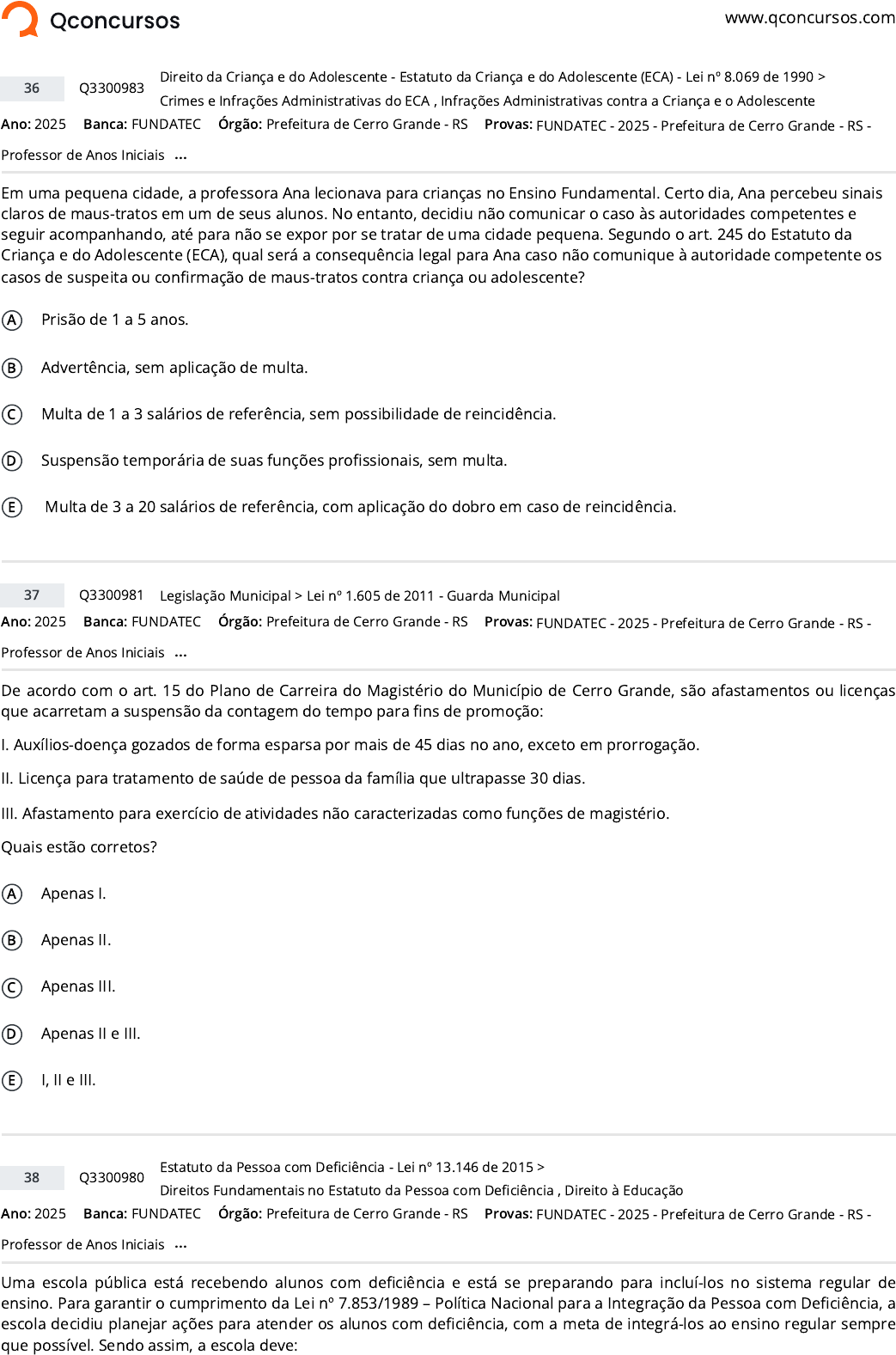 www.qconcursos.com Ano: 2025 Banca: FUNDATEC Órgão: Prefeitura de Cerro Grande - RS Em uma pequena cidade, a professora Ana lecionava para crianças no Ensino Fundamental. Certo dia, Ana percebeu sinais claros de maus-tratos em um de seus alunos. No entanto, decidiu não comunicar o caso às autoridades competentes e seguir acompanhando, até para não se expor por se tratar de uma cidade pequena. Segundo o art. 245 do Estatuto da Criança e do Adolescente (ECA), qual será a consequência legal para Ana caso não comunique à autoridade competente os casos de suspeita ou confirmação de maus-tratos contra criança ou adolescente? A Prisão de 1 a 5 anos. B Advertência, sem aplicação de multa. C Multa de 1 a 3 salários de referência, sem possibilidade de reincidência. D Suspensão temporária de suas funções profissionais, sem multa. E Multa de 3 a 20 salários de referência, com aplicação do dobro em caso de reincidência. Ano: 2025 Banca: FUNDATEC Órgão: Prefeitura de Cerro Grande - RS De acordo com o art. 15 do Plano de Carreira do Magistério do Município de Cerro Grande, são afastamentos ou licenças que acarretam a suspensão da contagem do tempo para fins de promoção: I. Auxílios-doença gozados de forma esparsa por mais de 45 dias no ano, exceto em prorrogação. II. Licença para tratamento de saúde de pessoa da família que ultrapasse 30 dias. III. Afastamento para exercício de atividades não caracterizadas como funções de magistério. Quais estão corretos? A Apenas I. B Apenas II. C Apenas III. D Apenas II e III. E I, II e III. Ano: 2025 Banca: FUNDATEC Órgão: Prefeitura de Cerro Grande - RS Uma escola pública está recebendo alunos com deficiência e está se preparando para incluí-los no sistema regular de ensino. Para garantir o cumprimento da Lei nº 7.853/1989 – Política Nacional para a Integração da Pessoa com Deficiência, a escola decidiu planejar ações para atender os alunos com deficiência, com a meta de integrá-los ao ensino regular sempre que possível. Sendo assim, a escola deve: 36 Q3300983 >Direito da Criança e do Adolescente - Estatuto da Criança e do Adolescente (ECA) - Lei nº 8.069 de 1990 Crimes e Infrações Administrativas do ECA , Infrações Administrativas contra a Criança e o Adolescente Provas: FUNDATEC - 2025 - Prefeitura de Cerro Grande - RS - Professor de Anos Iniciais ... 37 Q3300981 >Legislação Municipal Lei nº 1.605 de 2011 - Guarda Municipal Provas: FUNDATEC - 2025 - Prefeitura de Cerro Grande - RS - Professor de Anos Iniciais ... 38 Q3300980 >Estatuto da Pessoa com Deficiência - Lei nº 13.146 de 2015 Direitos Fundamentais no Estatuto da Pessoa com Deficiência , Direito à Educação Provas: FUNDATEC - 2025 - Prefeitura de Cerro Grande - RS - Professor de Anos Iniciais ... https://www.qconcursos.com/ https://www.qconcursos.com/questoes-de-concursos/bancas/fundatec https://www.qconcursos.com/questoes-de-concursos/institutos/prefeitura-de-cerro-grande-rs https://www.qconcursos.com/questoes-de-concursos/bancas/fundatec https://www.qconcursos.com/questoes-de-concursos/institutos/prefeitura-de-cerro-grande-rs https://www.qconcursos.com/questoes-de-concursos/bancas/fundatec https://www.qconcursos.com/questoes-de-concursos/institutos/prefeitura-de-cerro-grande-rs https://www.qconcursos.com/questoes-de-concursos/questoes/e05ef84a-1a https://www.qconcursos.com/questoes-de-concursos/disciplinas/direito-direito-da-crianca-e-do-adolescente-estatuto-da-crianca-e-do-adolescente-eca-lei-n-8-069-de-1990 https://www.qconcursos.com/questoes-de-concursos/disciplinas/direito-direito-da-crianca-e-do-adolescente-estatuto-da-crianca-e-do-adolescente-eca-lei-n-8-069-de-1990/crimes-e-infracoes-administrativas-do-eca https://www.qconcursos.com/questoes-de-concursos/disciplinas/direito-direito-da-crianca-e-do-adolescente-estatuto-da-crianca-e-do-adolescente-eca-lei-n-8-069-de-1990/infracoes-administrativas-contra-a-crianca-e-o-adolescente https://www.qconcursos.com/questoes-de-concursos/provas/fundatec-2025-prefeitura-de-cerro-grande-rs-professor-de-anos-iniciais https://www.qconcursos.com/questoes-de-concursos/provas/fundatec-2025-prefeitura-de-cerro-grande-rs-professor-de-anos-iniciais https://www.qconcursos.com/questoes-de-concursos/questoes/e05a08e6-1a https://www.qconcursos.com/questoes-de-concursos/disciplinas/direito-legislacao-municipal https://www.qconcursos.com/questoes-de-concursos/disciplinas/direito-legislacao-municipal/lei-n-1-605-de-2011-guarda-municipal https://www.qconcursos.com/questoes-de-concursos/provas/fundatec-2025-prefeitura-de-cerro-grande-rs-professor-de-anos-iniciais https://www.qconcursos.com/questoes-de-concursos/provas/fundatec-2025-prefeitura-de-cerro-grande-rs-professor-de-anos-iniciais https://www.qconcursos.com/questoes-de-concursos/questoes/e057804d-1a https://www.qconcursos.com/questoes-de-concursos/disciplinas/direito-estatuto-da-pessoa-com-deficiencia-lei-n-13-146-de-2015 https://www.qconcursos.com/questoes-de-concursos/disciplinas/direito-estatuto-da-pessoa-com-deficiencia-lei-n-13-146-de-2015/direitos-fundamentais-no-estatuto-da-pessoa-com-deficiencia https://www.qconcursos.com/questoes-de-concursos/disciplinas/direito-estatuto-da-pessoa-com-deficiencia-lei-n-13-146-de-2015/direito-a-educacao https://www.qconcursos.com/questoes-de-concursos/provas/fundatec-2025-prefeitura-de-cerro-grande-rs-professor-de-anos-iniciais https://www.qconcursos.com/questoes-de-concursos/provas/fundatec-2025-prefeitura-de-cerro-grande-rs-professor-de-anos-iniciais I. Priorizar os programas de Educação Especial em salas exclusivas e reduzir a integração dos alunos com deficiência com os demais estudantes no ambiente regular. II. Garantir a matrícula compulsória dos alunos com deficiência em cursos regulares de estabelecimentos públicos e privados, desde que seja possível sua integração ao sistema regular de ensino. III. Permitir que os alunos com deficiência escolham se desejam estudar em esco