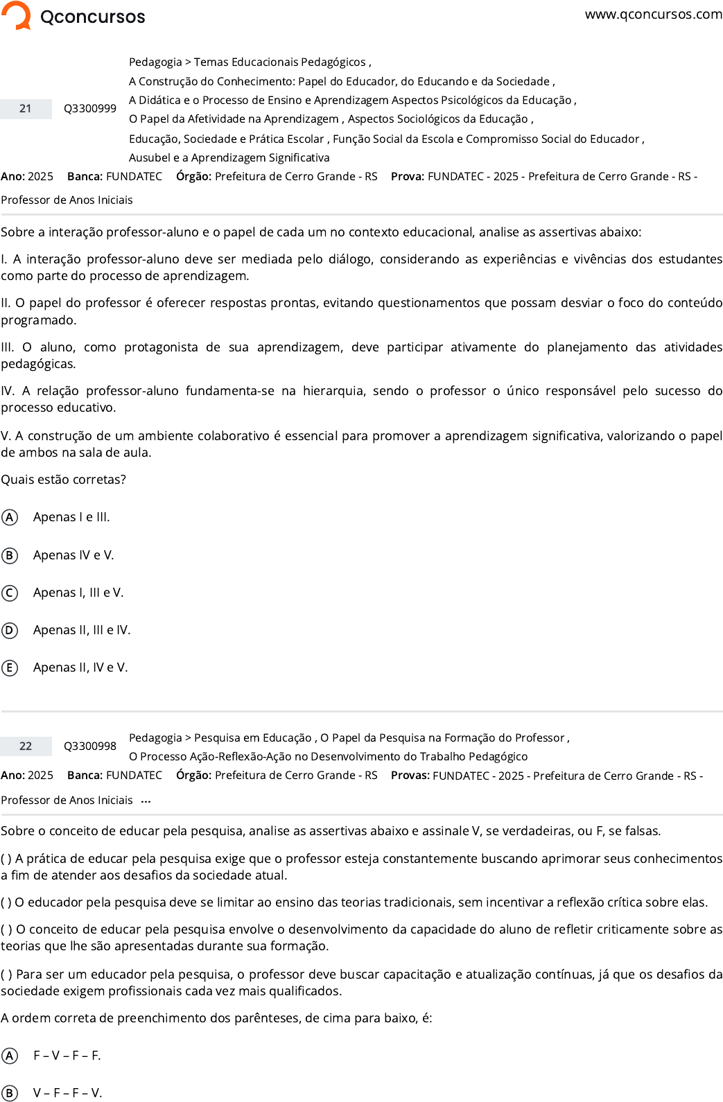 www.qconcursos.com Ano: 2025 Banca: FUNDATEC Órgão: Prefeitura de Cerro Grande - RS Sobre a interação professor-aluno e o papel de cada um no contexto educacional, analise as assertivas abaixo: I. A interação professor-aluno deve ser mediada pelo diálogo, considerando as experiências e vivências dos estudantes como parte do processo de aprendizagem. II. O papel do professor é oferecer respostas prontas, evitando questionamentos que possam desviar o foco do conteúdo programado. III. O aluno, como protagonista de sua aprendizagem, deve participar ativamente do planejamento das atividades pedagógicas. IV. A relação professor-aluno fundamenta-se na hierarquia, sendo o professor o único responsável pelo sucesso do processo educativo. V. A construção de um ambiente colaborativo é essencial para promover a aprendizagem significativa, valorizando o papel de ambos na sala de aula. Quais estão corretas? A Apenas I e III. B Apenas IV e V. C Apenas I, III e V. D Apenas II, III e IV. E Apenas II, IV e V. Ano: 2025 Banca: FUNDATEC Órgão: Prefeitura de Cerro Grande - RS Sobre o conceito de educar pela pesquisa, analise as assertivas abaixo e assinale V, se verdadeiras, ou F, se falsas. ( ) A prática de educar pela pesquisa exige que o professor esteja constantemente buscando aprimorar seus conhecimentos a fim de atender aos desafios da sociedade atual. ( ) O educador pela pesquisa deve se limitar ao ensino das teorias tradicionais, sem incentivar a reflexão crítica sobre elas. ( ) O conceito de educar pela pesquisa envolve o desenvolvimento da capacidade do aluno de refletir criticamente sobre as teorias que lhe são apresentadas durante sua formação. ( ) Para ser um educador pela pesquisa, o professor deve buscar capacitação e atualização contínuas, já que os desafios da sociedade exigem profissionais cada vez mais qualificados. A ordem correta de preenchimento dos parênteses, de cima para baixo, é: A F – V – F – F. B V – F – F – V. 21 Q3300999 >Pedagogia Temas Educacionais Pedagógicos , A Construção do Conhecimento: Papel do Educador, do Educando e da Sociedade , A Didática e o Processo de Ensino e Aprendizagem Aspectos Psicológicos da Educação , O Papel da Afetividade na Aprendizagem , Aspectos Sociológicos da Educação , Educação, Sociedade e Prática Escolar , Função Social da Escola e Compromisso Social do Educador , Ausubel e a Aprendizagem Significativa Prova: FUNDATEC - 2025 - Prefeitura de Cerro Grande - RS - Professor de Anos Iniciais 22 Q3300998 >Pedagogia Pesquisa em Educação , O Papel da Pesquisa na Formação do Professor , O Processo Ação-Reflexão-Ação no Desenvolvimento do Trabalho Pedagógico Provas: FUNDATEC - 2025 - Prefeitura de Cerro Grande - RS - Professor de Anos Iniciais ... https://www.qconcursos.com/ https://www.qconcursos.com/questoes-de-concursos/bancas/fundatec https://www.qconcursos.com/questoes-de-concursos/institutos/prefeitura-de-cerro-grande-rs https://www.qconcursos.com/questoes-de-concursos/bancas/fundatec https://www.qconcursos.com/questoes-de-concursos/institutos/prefeitura-de-cerro-grande-rs https://www.qconcursos.com/questoes-de-concursos/questoes/e0864ad6-1a https://www.qconcursos.com/questoes-de-concursos/disciplinas/pedagogia-pedagogia https://www.qconcursos.com/questoes-de-concursos/disciplinas/pedagogia-pedagogia/temas-educacionais-pedagogicos https://www.qconcursos.com/questoes-de-concursos/disciplinas/pedagogia-pedagogia/a-construcao-do-conhecimento-papel-do-educador-do-educando-e-da-sociedade https://www.qconcursos.com/questoes-de-concursos/disciplinas/pedagogia-pedagogia/a-didatica-e-o-processo-de-ensino-e-aprendizagem https://www.qconcursos.com/questoes-de-concursos/disciplinas/pedagogia-pedagogia/aspectos-psicologicos-da-educacao https://www.qconcursos.com/questoes-de-concursos/disciplinas/pedagogia-pedagogia/o-papel-da-afetividade-na-aprendizagem https://www.qconcursos.com/questoes-de-concursos/disciplinas/pedagogia-pedagogia/aspectos-sociologicos-da-educacao https://www.qconcursos.com/questoes-de-concursos/disciplinas/pedagogia-pedagogia/educacao-sociedade-e-pratica-escolar https://www.qconcursos.com/questoes-de-concursos/disciplinas/pedagogia-pedagogia/funcao-social-da-escola-e-compromisso-social-do-educador https://www.qconcursos.com/questoes-de-concursos/disciplinas/pedagogia-pedagogia/ausubel-e-a-aprendizagem-significativa https://www.qconcursos.com/questoes-de-concursos/provas/fundatec-2025-prefeitura-de-cerro-grande-rs-professor-de-anos-iniciais https://www.qconcursos.com/questoes-de-concursos/provas/fundatec-2025-prefeitura-de-cerro-grande-rs-professor-de-anos-iniciais https://www.qconcursos.com/questoes-de-concursos/questoes/e083bb0c-1a https://www.qconcursos.com/questoes-de-concursos/disciplinas/pedagogia-pedagogia https://www.qconcursos.com/questoes-de-concursos/disciplinas/pedagogia-pedagogia/pesquisa-em-educacao https://www.qconcursos.com/questoes-de-concursos/disciplinas/pedagogia-pedagogia/o-papel-da-pesquisa-na-formacao-do-professor https://www.qconcursos.com/questoes-de-concursos/disciplinas/pedagogia-pedagogia/o-processo-acao-reflexao-acao-no-desenvolvimento-do-trabalho-pedagogico https://www.qconcursos.com/questoes-de-concursos/provas/fundatec-2025-prefeitura-de-cerro-grande-rs-professor-de-anos-iniciais https://www.qconcursos.com/questoes-de-concursos/provas/fundatec-2025-prefeitura-de-cerro-grande-rs-professor-de-anos-iniciais C V – F – V – V. D F – F – V – V. E V – V – V – F. Ano: 2025 Banca: FUNDATEC Órgão: Prefeitura de Cerro Grande - RS Com base na concepção sociocrítica de gestão escolar descrita por Libâneo (2007), assinale a alternativa INCORRETA. A A gestão escolar sociocrítica considera o caráter intencional das ações e as interações sociais, promovendo formas democráticas de tomada de decisões. B O princípio da gestão democrática inclui a participação ativa de professores, pais e comunidade escolar para garantir qua