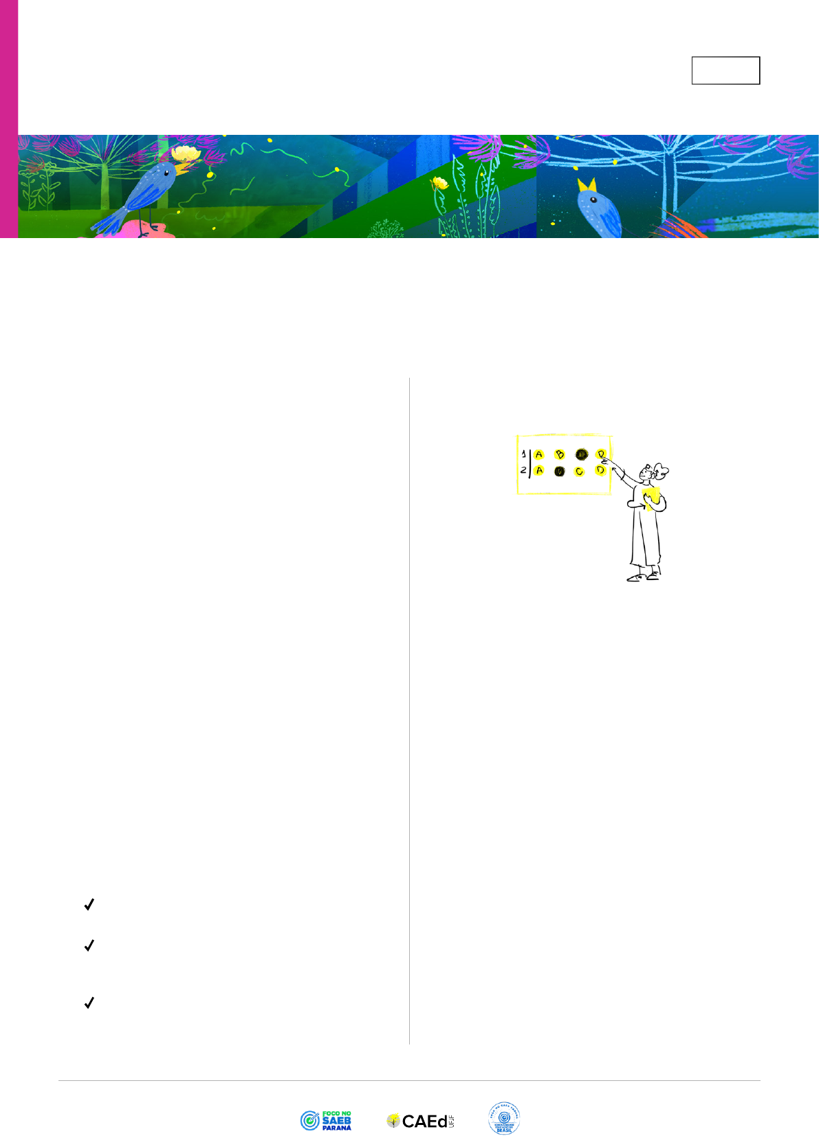 Á Organização para a aplicação Professor Aplicador, ao receber os instrumentos de aplicação lembre-se de: 1. Conferir se os Cadernos de Teste recebidos correspon- dem ao ano de escolaridade da turma avaliada. 2. Verificar se o quantitativo de Cadernos de Teste recebi- dos é suficiente para atender os estudantes presentes para a avaliação na sua turma. Caso seja identificada a falta de cadernos, entre em contato com o Diretor Escolar. 3. Informar aos estudantes que: P eles devem desligar os celulares e outros aparelhos eletrônicos e mantê-los desligados até o final da aplicação; P eles devem deixar sobre a carteira apenas lápis, borracha e caneta esferográfica azul ou preta; P eles não poderão ausentar-se definitivamente da sala de aula durante a aplicação (exceto em casos extremos); P nenhuma pergunta sobre o conteúdo do teste pode- rá ser respondida por você; P eles terão 2 horas para responder ao teste e trans- crever as respostas para o Cartão de Respostas; P durante a distribuição dos testes, eles devem aguar- dar para que todos iniciem a aplicação juntos. 4. Distribuir os Cadernos de Teste para os estudantes. 5. Orientar os estudantes a: □ escrever o nome completo e a data de nascimento na capa do Caderno de Teste; □ selecionar apenas uma alternativa para cada questão, pois há apenas uma resposta correta. Caso tenha mais de uma resposta marcada, a questão será anulada; □ utilizar somente caneta esferográfica com tinta na cor azul ou preta para as marcações no Cartão de Respostas, disponível na capa do teste. 6. Escrever no quadro o exemplo de marcação correta no Cartão de Respostas, conforme modelo a seguir: 7. Iniciar a aplicação do teste. A partir desse momento, o tempo de duração da aplicação começará a ser contado. 8. Atentar-se para o andamento da atividade durante todo o período. 9. Avisar aos estudantes quando estiverem faltando 30 (trinta) minutos para o término da avaliação e, novamen- te, a 10 (dez) minutos do final. 10. Terminado o tempo de aplicação, recolher todos os Ca- dernos de Teste. Á Após a aplicação do teste 1. Realizar o lançamento das respostas dos estudantes na plataforma ou utilizar o aplicativo de leitura do Cartão de Respostas (CAEd Avaliação), seguindo as orientações contidas no Tutorial de aplicação. 2. Devolver todos os materiais ao Diretor Escolar. Agradecemos a sua participação! RECOMPOSIÇÃO - 1ª AVALIAÇÃO | 9° ANO DO EF E 3ª/4ª SÉRIE DO EM ORIENTAÇÕES PARA APLICAÇÃO PARANÁ 2025