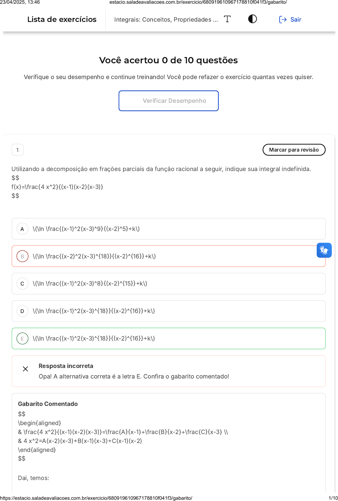 Você acertou 0 de 10 questões Verifique o seu desempenho e continue treinando! Você pode refazer o exercício quantas vezes quiser. Verificar Desempenho A B C D E 1 Marcar para revisão Utilizando a decomposiçāo em fraçōes parciais da funçāo racional a seguir, indique sua integral indefinida. $$ f(x)=\frac{4 x^2}{(x-1)(x-2)(x-3)} $$ \(\ln \frac{(x-1)^2(x-3)^9}{(x-2)^5}+k\) \(\ln \frac{(x-2)^2(x-3)^{18}}{(x-2)^{16}}+k\) \(\ln \frac{(x-1)^2(x-3)^8}{(x-2)^{15}}+k\) \(\ln \frac{(x-1)^2(x-3)^{18}}{(x-2)^{16}}+k\) \(\ln \frac{(x-1)^2(x-3)^{18}}{(x-2)^{16}}+k\) Resposta incorreta Opa! A alternativa correta é a letra E. Confira o gabarito comentado! Gabarito Comentado $$ \begin{aligned} & \frac{4 x^2}{(x-1)(x-2)(x-3)}=\frac{A}{x-1}+\frac{B}{x-2}+\frac{C}{x-3} \\ & 4 x^2=A(x-2)(x-3)+B(x-1)(x-3)+C(x-1)(x-2) \end{aligned} $$ Dai, temos: Lista de exercícios Integrais: Conceitos, Propriedades … Sair 23/04/2025, 13:46 estacio.saladeavaliacoes.com.br/exercicio/680919610967178810f041f3/gabarito/ https://estacio.saladeavaliacoes.com.br/exercicio/680919610967178810f041f3/gabarito/ 1/10 A B C D E $$ \begin{aligned} & x=1 \rightarrow 4=2 A \rightarrow A=2 \\ & x=2 \rightarrow 16=-B \rightarrow B=-16 \\ & x=3 \rightarrow 36=2 C \rightarrow C=18 \end{aligned} $$ Entāo, $$ \begin{aligned} & I=\int f(x) d x \\ & I=\int\left[2 \frac{1}{x-1}-16 \cdot \frac{1}{x-2}+18 \frac{1}{x-3}\right] d x \\ & I=\ln 2(x-1)-16 \ln (x-2)+18 \ln (x-3)+k \\ & I=\ln \frac{(x-1)^2(x-3)^{1 a}}{(x-2)^{16}}+k \end{aligned} $$ 2 Marcar para revisão O método das fraçöes parciais é um dos métodos mais utilizados na resoluçảo de integrais. Usando este método, calcule a integral ∫ dx.8 4−x2 In(2 + x) − In(2 − x) + C. 2(In(2 + x) − In(2 − x)) + C. 3(In(2 + x) − In(2 − x)) + C. 4(In(2 + x) − In(2 − x)) + C. 5(In(2 + x) − In(2 − x)) + C. Resposta incorreta Opa! A alternativa correta é a letra B. Confira o gabarito comentado! Gabarito Comentado 23/04/2025, 13:46 estacio.saladeavaliacoes.com.br/exercicio/680919610967178810f041f3/gabarito/ https://estacio.saladeavaliacoes.com.br/exercicio/680919610967178810f041f3/gabarito/ 2/10 A B C D E Resolvendo a integral: ∫ dx = 8 ∫ dx = + 1 = A(2 − x) + B(2 + x) 1 = 2A − Ax + 2B + Bx ⎧⎪ ⎨ ⎪⎩ 1 = 2A + 2B 0 = −A + B A = B = 8 4 − x2 1 4 − x2 1 4 − x2 A 2 + x B 2 − x 1 4 8 ∫ ( + ) dx = 2(ln(2 + x) − ln(2 − x)) + C$$$$ ∫ dx = 2(ln(2 + x) − ln(2 − x)) + C1 4 1 2+x 1 2−x 8 4−x2 3 Marcar para revisão O cálculo de integrais é uma ferramenta importante para calcular áreas, volumes e somas acumuladas. Calcule a integral definida de f(x) = x + 3x - 2 de 0 a 2.2 2,67 4,67 6,67 8,67 10,67 Resposta incorreta Opa! A alternativa correta é a letra B. Confira o gabarito comentado! Gabarito Comentado Para resolver a integral definida, é necessário calcular a antidecivaga da funçäo e, em seguida, avaliá-la nos limites de integração. A antiderivada de é: Avaliando-a nos limites de integração de 0 a 2 , temos: (f(x) = x2 + 3x − 2) F(x) = (1/3)x3 + (3/2)x2 − 2x F(2) − F(0) = (1/3)8 + (3/2)4 − 4 − (1/3)0 − (3/2)0 + 0 = 4 23/04/2025, 13:46 estacio.saladeavaliacoes.com.br/exercicio/680919610967178810f041f3/gabarito/ https://estacio.saladeavaliacoes.com.br/exercicio/680919610967178810f041f3/gabarito/ 3/10 A B C D E 4 Marcar para revisão Calcule \(\int_0^1 \frac{1}{4 x^2-4 x+5} d x=1\). arct 1/√5 1/(2√5)arct1/√5 arct1/(2√5) 1/(2√5)arct1/√5 1/(2√5)arct1/√5 Resposta incorreta Opa! A alternativa correta é a letra E. Confira o gabarito comentado! Gabarito Comentado $$ \begin{aligned} & 4 x^2-4 x+5=(2 x-1)^2+4 \\ & 4 x^2-4 x+5=(2 x-1)^2+4 \end{aligned} $$ Fazendo \(u=2 x-1\) obtemos: $$ \left\{\begin{array}{l} 4 x^2-4 x+5=u^2+4 \\ d u=d x \\ x=0 \rightarrow u=-1 \\ x=1 \rightarrow u=1 \end{array}\right. $$ Logo: $$ \begin{aligned} & I=\int_0^1 \frac{1}{4 x^2-4 x+5} d x \\ & I=\frac{1}{2} \int_0^1 \frac{1}{u^2+(\sqrt{5})^2} d u \\ & I=\frac{1}{2} \int_0^1 \frac{1}{u^2+(\sqrt{5})^2} d u \\ & I=\frac{1}{2}\left[\frac{1}{\sqrt{5}} \operatorname{arct} \frac{u}{\sqrt{5}}\right]_0^1 \\ & I=\frac{1}{2 \sqrt{5}} \operatorname{arct} \frac{15}{\sqrt{5}} 23/04/2025, 13:46 estacio.saladeavaliacoes.com.br/exercicio/680919610967178810f041f3/gabarito/ https://estacio.saladeavaliacoes.com.br/exercicio/680919610967178810f041f3/gabarito/ 4/10 A B C D E A B C \end{aligned} $$ 5 Marcar para revisão Determine o valor da integral sen t cost dt3 , k real+ + kcos4t 2 cos2t 4 , k real− + ksen4t 4 sen2t 2 , k real− + kcos4t 4 cos2t 2 , k real + + ksen4t 4 sen2t 2 , k real− + k2cos5t 3 cos2t 3 Resposta incorreta Opa! A alternativa correta é a letra C. Confira o gabarito comentado! Gabarito Comentado A integral dada é resolvida por meio da técnica de substituição. Nesse caso, a função sen t cos t dt é integrada por partes, onde u = sen t e dv = sen t cos t dt. Após a integração, a expressão resultante é , onde k é uma constante real. Portanto, a alternativa correta é a letra C. 3 2 − + kcos4t 4 cos2t 2 6 Marcar para revisão Determine o valor da integral \(\int\left(2 \sec ^2 y+\frac{3}{1+y^2}+2 y\right) d y\) 2tgy + 3arctg(y) + y + k, kreal 2seny + 3arcsen(y) + 2y + k, kreal 2tgy − arctg(y) − 2y + k, kreal 23/04/2025, 13:46 estacio.saladeavaliacoes.com.br/exercicio/680919610967178810f041f3/gabarito/ https://estacio.saladeavaliacoes.com.br/exercicio/680919610967178810f041f3/gabarito/ 5/10 D E A B C 2cosy + 3arsen(y) + y + k, kreal 2seny + 3arctg(y) + y + k, kreal Resposta incorreta Opa! A alternativa correta é a letra A. Confira o gabarito comentado! Gabarito Comentado Observe que: $$ \begin{aligned} & (\operatorname{tg} y)^{\prime}=\sec ^2 y \\ & (\operatorname{arctg} y)^{\prime}=\frac{1}{y^2-1} \mathrm{e} \\ & \left(y^n\right)^{\prime}=n y^{n-1} \end{aligned} $$ Logo, é imediato que $$ \begin{aligned} & \int 2 \sec ^2 y d y=2 \operatorname{tg} y+k_1 \\ & \int \frac{3}{1+y^2} d y=3 \operatorname{arctg}