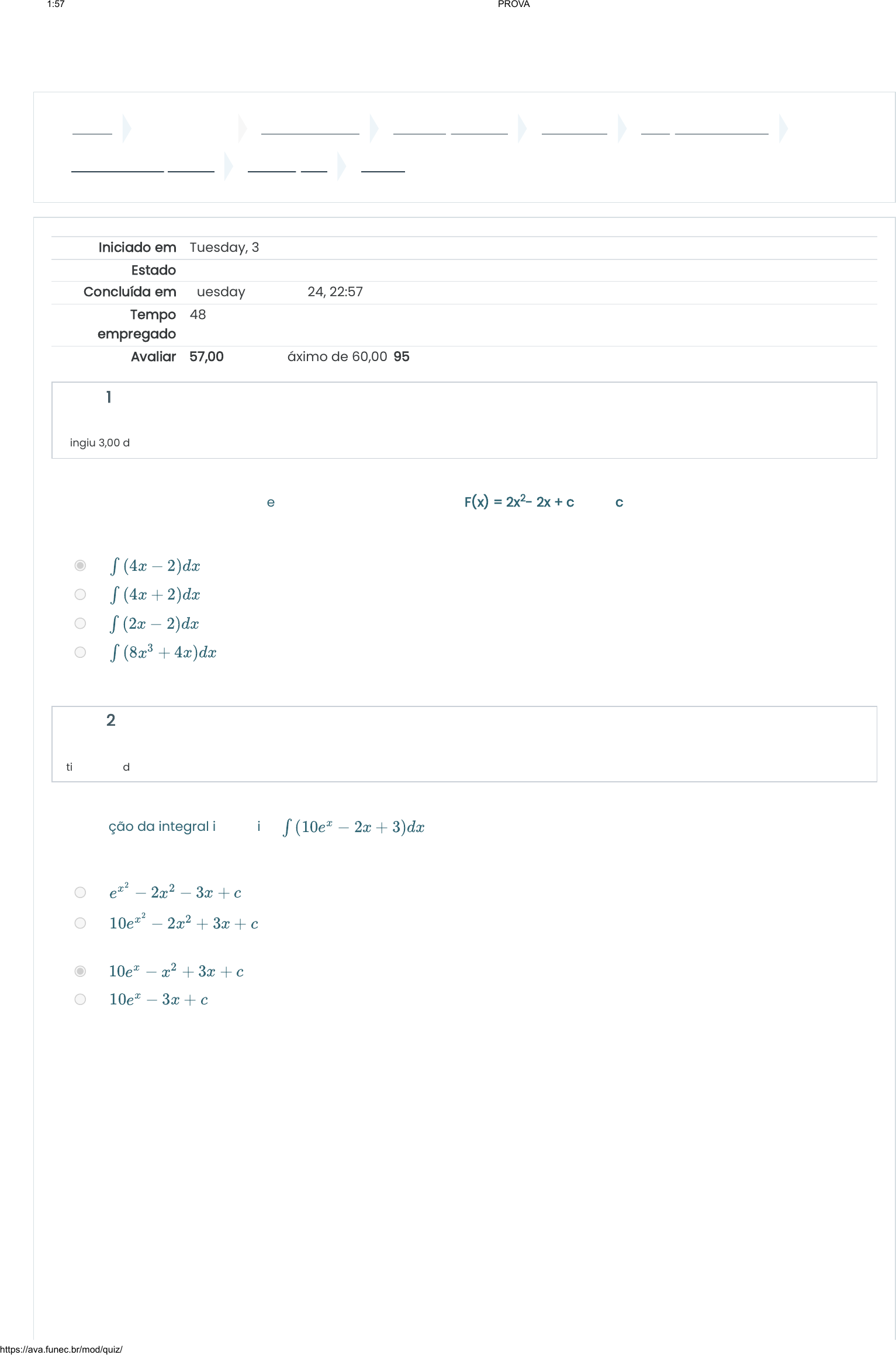 Painel Meus cursos CURSOS FUNEC Graduação - EAD Aluno EAD JUNÇÕES DE TURMA Matemática Aplicada AVALIAÇÕES PROVA Iniciado em Tuesday, 3 Dec 2024, 22:09 Estado Finalizada Concluída em Tuesday, 3 Dec 2024, 22:57 Tempo empregado 48 minutos 2 segundos Avaliar 57,00 de um máximo de 60,00(95%) Questão 1 Completo Atingiu 3,00 de 3,00 Questão 2 Completo Atingiu 3,00 de 3,00 Qual das integrais abaixo fornece como resultado a função F(x) = 2x - 2x + c onde c é uma constante: Escolha uma opção: a. b. c. d. 2 ∫ (4x − 2)dx ∫ (4x + 2)dx ∫ (2x − 2)dx ∫ (8 + 4x)dxx3 A solução da integral indefinida é: Escolha uma opção: a. b. c. d. ∫ (10 − 2x + 3)dxex − 2 − 3x + cex 2 x2 10 − 2 + 3x + cex 2 x2 10 − + 3x + cex x2 10 − 3x + cex 03/12/24, 21:57 PROVA https://ava.funec.br/mod/quiz/review.php?attempt=697483&cmid=4748 1/6 https://ava.funec.br/my/ https://ava.funec.br/course/index.php?categoryid=10 https://ava.funec.br/course/index.php?categoryid=17 https://ava.funec.br/course/index.php?categoryid=19 https://ava.funec.br/course/index.php?categoryid=77 https://ava.funec.br/course/view.php?id=441 https://ava.funec.br/course/view.php?id=441#section-5 https://ava.funec.br/mod/quiz/view.php?id=4748 Questão 3 Completo Atingiu 3,00 de 3,00 Questão 4 Completo Atingiu 3,00 de 3,00 Questão 5 Completo Atingiu 3,00 de 3,00 Questão 6 Completo Atingiu 3,00 de 3,00 Dada a função do segundo grau definida por f(x) = x + 5x + 6. Podemos afirmar que o produto das raízes da equação é: Escolha uma opção: a. - 6 b. 6 c. 5 d. - 5 2 Uma derivada mede a inclinação de uma reta tangente em um ponto sobre uma curva. A derivada da função terá inclinação nula (zero) no ponto: Escolha uma opção: a. x = - 4 b. x = - 2 c. x = 4 d. x = 2 F(x) = 2 −8xx2 4 A soma de dois números inteiros e positivo é igual a 80. Logo o produto máximo entre esses dois números será igual a: Escolha uma opção: a. 1600 b. 6400 c. 900 d. 2500 Dada a função do terceiro grau . É correto afirmar que sua derivada é: Escolha uma opção: a. uma função do segundo grau dada por b. uma função do segundo grau dada por c. uma função do primeiro grau dada por d. uma função do primeiro grau dada por F(x) = 2 + 5x − 3x3 (x) = 6 + 5F ′ x2 (x) = 4x + 5F ′ (x) = 4x − 3F ′ (x) = 6 + 5F ′ x2 03/12/24, 21:57 PROVA https://ava.funec.br/mod/quiz/review.php?attempt=697483&cmid=4748 2/6 Questão 7 Completo Atingiu 3,00 de 3,00 Questão 8 Completo Atingiu 3,00 de 3,00 Questão 9 Completo Atingiu 3,00 de 3,00 O coeficiente angular da função representada no gráfico é: Escolha uma opção: a. - 4 b. - 2 c. 2 d. 4 Na expressão é correto a firmar que y é igual a: Escolha uma opção: a. b. c. d. limx→∞ 4x−8 10x−20 ∞ ∞ 2 5 −∞ −∞ 0 0 A derivada da função é: Escolha uma opção: a. b. c. d. (x) =F ′ x+1 x−2 (x) = 1F ′ (x) =F ′ (x+1)2 (x−2)2 (x) =F ′ (x+1)2 (x−2)2 (x) =F ′ −3 (x−2)2 03/12/24, 21:57 PROVA https://ava.funec.br/mod/quiz/review.php?attempt=697483&cmid=4748 3/6 Questão 10 Completo Atingiu 3,00 de 3,00 Questão 11 Completo Atingiu 3,00 de 3,00 Questão 12 Completo Atingiu 0,00 de 3,00 Questão 13 Completo Atingiu 3,00 de 3,00 O perímetro de um lote retangular é de 800 metros. Logo as dimensões desse lote para que tenha área máxima é: Escolha uma opção: a. x = 200 m e y = 200 m b. x = 100 m e y = 300 m c. x = 300 m e y = 100 m d. x = 150 m e y = 250 m A derivada da função F(x) = (x + 5x) é: Escolha uma opção: a. F'(x) = (12x + 20)(x + 5x) b. F'(x) = 4(3x + 5) c. F'(x) = 4(x + 5x) d. F'(x) = 4(3x + 5) 3 4 2 3 3 2 3 3 3 2 Dadas as funções definidas por e , é correto afirmar: Escolha uma opção: a. Os gráficos de f(x) e g(x) não se interceptam. b. f(x) é decrescente e g(x) é decrescente. c. f [g(0)] = f(0) d. g(– 2) . f(– 1) = f(3) f(x) = ( 4 5 )x g(x) = ( 5 4 )x Dada a função racional , podemos a firmar que o limite dessa função quando é: Escolha uma opção: a. b. c. d. y = −2x−15x2 2 −18x2 x → −3 2 3 3 2 − 2 3 0 03/12/24, 21:57 PROVA https://ava.funec.br/mod/quiz/review.php?attempt=697483&cmid=4748 4/6 Questão 14 Completo Atingiu 3,00 de 3,00 Questão 15 Completo Atingiu 3,00 de 3,00 Questão 16 Completo Atingiu 3,00 de 3,00 Questão 17 Completo Atingiu 3,00 de 3,00 Para a construção de um muro de 1 metro de altura ao redor de um terreno retangular, foram disponibilizados 10000 tijolos. Sabendo que 25 tijolos cobrem um metro quadrado de construção. Determine a área máxima que poderá ser cercada com o muro. Escolha uma opção: a. A =1600 m² b. A = 10000 m² c. A = 2500 m² d. A = 5000 m² Se a variável x na expressão tende ao mais infinito. É correto afirmar que: Escolha uma opção: a. Tende a zero. b. y tende a menos infinito. c. y tende a mais infinito. d. Tende a 5 y = limx→∞ 10 −8x2 −2 +20x3 A derivada da função F(x) = sen (x )é : Escolha uma opção: a. F'(x) = - cos(x ) b. F'(x) = 2x cos(x ) c. F'(x) = - 2x cos(x ) d. F'(x) = cos(x ) 2 2 2 2 2 A solução da integral indefinida é: Escolha uma opção: a. b. c. d. ∫ (cosy. tangy)dy cosy. cotangy + c cosy + c −cosy + c −cosy 03/12/24, 21:57 PROVA https://ava.funec.br/mod/quiz/review.php?attempt=697483&cmid=4748 5/6 Questão 18 Completo Atingiu 3,00 de 3,00 Questão 19 Completo Atingiu 3,00 de 3,00 Questão 20 Completo Atingiu 3,00 de 3,00 O lucro obtido no processo de fabricação de um produto, pode ser calculado subtraindo o custo total de produção, do preço total de vendas desse produto. Uma indústria farmacêutica vende uma dose de um certo fármaco por 200 reais. Sabendo que a capacidade de produção mensal dessa indústria varia de 0 a 30000 unidades e que o custo de produção nesse período vale C(x) = 5.10 + 8.10x + 3.10 x onde x é a quantidade de doses produzidas. O lucro máximo será obtido se forem produzidas: Escolha uma opção: a. 10000 doses b. 15000 doses c. 30000 doses d. 20000 doses 5 -3 2 