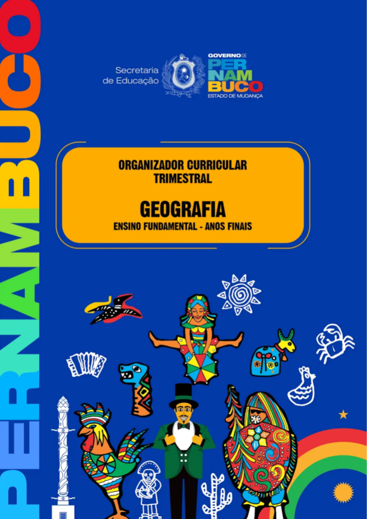 SUMÁRIO 1. INTRODUÇÃO......................................................................................................................8 1.1 CONSTRUÇÃO DO CURRÍCULO DE PERNAMBUCO...............................................8 1.2 CONCEPÇÕES SOBRE O CURRÍCULO................................................................... 11 1.3 PRINCÍPIOS NORTEADORES...................................................................................13 1.4 EDUCAÇÃO ESPECIAL NA PERSPECTIVA DA INCLUSÃO....................................15 1.5 COMPETÊNCIAS E HABILIDADES........................................................................... 16 1.6 COMPETÊNCIAS GERAIS.........................................................................................18 1.7 CONCEPÇÕES SOBRE O PROCESSO DE ENSINO E APRENDIZAGEM..............19 1.8 FORMAÇÃO DE PROFESSORES.............................................................................22 1.9 AVALIAÇÃO DA, PARA E COMO APRENDIZAGEM................................................. 25 1.10 TEMAS TRANSVERSAIS E INTEGRADORES DO CURRÍCULO...........................27 1.11. O DOCUMENTO E SUA ORGANIZAÇÃO...............................................................35 REFERÊNCIAS...................................................................................................................... 37 2. ENSINO FUNDAMENTAL..................................................................................................42 2.1 O ENSINO FUNDAMENTAL E SUAS FASES............................................................ 42 2.2 A TRANSIÇÃO DA EDUCAÇÃO INFANTIL PARA O ENSINO FUNDAMENTAL – ANOS INICIAIS.................................................................................................................43 2.3 A TRANSIÇÃO DO ENSINO FUNDAMENTAL ANOS INICIAIS PARA OS ANOS FINAIS...............................................................................................................................45 REFERÊNCIAS...................................................................................................................... 49 3. ENSINO FUNDAMENTAL - ANOS FINAIS - GEOGRAFIA...............................................50 3.1. ÁREA: CIÊNCIAS HUMANAS................................................................................... 50 3.2 COMPETÊNCIAS ESPECÍFICAS DA ÁREA DE CIÊNCIAS HUMANAS PARA O ENSINO FUNDAMENTAL.................................................................................................52 REFERÊNCIA.........................................................................................................................54 4. GEOGRAFIA...................................................................................................................... 55 4.1 GEOGRAFIA NO ENSINO FUNDAMENTAL – ANOS FINAIS................................... 57 4.2 COMPETÊNCIAS ESPECÍFICAS DE GEOGRAFIA PARA O ENSINO FUNDAMENTAL............................................................................................................... 59 ORGANIZADOR CURRICULAR POR TRIMESTRE............................................................. 62 6º ANO.............................................................................................................................. 62 7º ANO.............................................................................................................................. 67 8º ANO.............................................................................................................................. 72 9º ANO.............................................................................................................................. 80 REFERÊNCIAS...................................................................................................................... 88 FICHA TÉCNICA.................................................................................................................... 90 APRESENTAÇÃO Olá, Professor(a)! O presente documento tem por objetivo dinamizar o acesso ao conteúdo do Currículo de Pernambuco – Ensino Fundamental (CPE-EF), no sentido de facilitar seu acesso diante das demandas cotidianas e inerentes à prática pedagógica da/ na Educação Básica. Sendo assim, sua elaboração leva em conta a função norteadora desempenhada pelo CPE-EF em sua relação com seu manuseio facilitado em termos de agilidade e de correlação com as realidades constituintes de cada contexto escolar e dos saberes a serem ensinados e aprendidos nas aulas de cada Componente Curricular devidamente situados em suas respectivas Áreas do Conhecimento Escolar. A necessidade de compartimentalizar CPE-EF por componente curricular surge para facilitar a rotina pedagógica do professor no acesso ao CPE-EF de seu componente curricular em sua área específica do conhecimento. No entanto, essa divisão mantém as diretrizes e pressupostos norteadores da construção do CPE-EF em correlação às especificidades do Ensino Fundamental, bem como a caracterização e a delimitação específica e particularizada de cada Área do Conhecimento Escolar em razão dos Componentes Curriculares que as constituem, sem que se perca o caráter de unicidade inerente ao documento original. Dessa forma, ficam mantidos todos os princípios norteadores do CPE-EF: equidade e excelência, formação integral, educação em direitos humanos e inclusão, garantindo um processo de ensino e aprendizagem democrático, voltado para a construção de uma educação de qualidade, comprometida com a justiça e a inclusão, mantendo o diálogo como importante ato na busca do conhecimento de todos que constroem o processo educativo no seu cotidiano (FREIRE, 1987). O respeito e uso desses princípios norteadores em sala de aula colaboram para a construção de uma educação que incentiva o protagonismo estudantil como mecanismo para a formação de cidadãos conscientes de seus direitos e dever