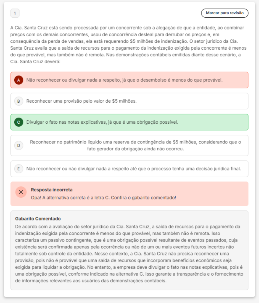 1 Marcar para revisão A Cia. Santa Cruz está sendo processada por um concorrente sob a alegação de que a entidade, ao combinar preços com os demais concorrentes, usou de concorrência desleal para derrubar os preços e, em consequência da perda de vendas, ela está requerendo $5 milhões de indenização. setor jurídico da Cia. Santa Cruz avalia que a saída de recursos para pagamento da indenização exigida pela concorrente é menos do que provável, mas também não é Nas demonstrações contábeis emitidas diante desse cenário, a Santa Cruz deverá: A Não reconhecer ou divulgar nada a respeito, já que desembolso é menos do que provável. B Reconhecer uma provisão pelo valor de $5 Divulgar o fato nas notas explicativas, já que é uma obrigação possível. Reconhecer no patrimônio líquido uma reserva de contingência de $5 milhões, considerando que D fato gerador da obrigação ainda não ocorreu. E Não reconhecer ou não divulgar nada a respeito até que processo tenha uma decisão jurídica final. Resposta incorreta A alternativa correta é a letra C. Confira o gabarito comentado! Gabarito Comentado De acordo com a avaliação do setor jurídico da Cia. Santa Cruz, a saída de recursos para pagamento da indenização exigida pela concorrente é menos do que provável, mas também não é remota. Isso caracteriza um passivo contingente, que é uma obrigação possível resultante de eventos passados, cuja existência será confirmada apenas pela ocorrência ou não de um ou mais eventos futuros incertos não totalmente sob controle da entidade. Nesse contexto, a Cia. Santa Cruz não precisa reconhecer uma provisão, pois não é provável que uma saída de recursos que incorporam benefícios econômicos seja exigida para liquidar a obrigação. No entanto, a empresa deve divulgar fato nas notas explicativas, pois é uma obrigação possível, conforme indicado na alternativa C. Isso garante a transparência e fornecimento de informações relevantes aos usuários das demonstrações2 Marcar para revisão No dia 22/03/20X2, a empresa Investidora S.A. adquiriu 65% do Patrimônio Líquido da empresa Investida S.A., pelo montante total de R$ Na data dessa negociação, Patrimônio Líquido da firma Investida S.A. era assim composto: Capital Subscrito: R$ 4.500.000,00 Capital a Integralizar: R$ 800.000,00 Reserva de Capital: R$ 80.000,00 Reserva Legal: R$ 150.000,00 Ações em Tesouraria: R$ 70.000,00 Reserva de Dividendos não R$ 140.000,00 No final do exercício de 20X2, a firma Investida S.A. apresentou como Patrimônio Líquido montante de R$ Considerando exclusivamente as informações dadas, informe valor a ser debitado no investimento da firma Investidora S.A. para reconhecer a equivalência patrimonial no final do exercício de 20X2. A R$320.000,00. B R$620.000,00 C R$2.600.000,00 D R$140.000,00 E R$208.000,00 Resposta incorreta Opa! A alternativa correta é a letra E. Confira gabarito comentado! Gabarito Comentado Patrimônio Líquido da Investida S.A., em 22/03/20X2 era de R$4.000.000,00. Ao final do período, esse mesmo Patrimônio Líquido montou em R$4.320.000,00. Logo, sugere-se que lucro do período foi de R$320.000,00. Considerando que a firma Investidora S.A. possui 65% do Patrimônio Líquido da Investida S.A., ajuste a débito na conta de investimento da Investidora S.A. será de 0,65 X R$320.000,00 = R$208.000,00.3 Marcar para revisão objetivo da IAS 28 - Investments in Associates and Joint Ventures é estabelecer a contabilização de investimentos em coligadas e em controladas. De acordo com a norma, é considerada uma coligada: A É a entidade sobre a qual o investidor tem influência significativa. É a entidade na qual a controladora, diretamente ou por meio de outras controladas, é titular de B direitos de sócio que lhe assegurem, de modo permanente, preponderância nas deliberações sociais e poder de a maioria dos É compartilhamento, contratualmente convencionado, do controle de negócio, que existe somente C quando decisões sobre as atividades relevantes exigem consentimento unânime das partes que compartilham controle. É um acordo conjunto por meio do qual as partes, que detêm controle em conjunto do acordo D contratual, têm direitos sobre os ativos líquidos desse acordo. É o método de contabilização por meio do qual investimento é inicialmente reconhecido pelo custo E e, a partir é ajustado para refletir a participação do investidor no patrimônio líquido da investida. Resposta correta Parabéns, você selecionou a alternativa correta. Confira gabarito comentado! Gabarito Comentado Segundo a norma IAS 28, uma coligada é definida como a entidade sobre a qual o investidor tem influência significativa. Esta influência significativa é caracterizada pelo poder de participar nas decisões sobre políticas financeiras e operacionais da entidade investida, sem, no entanto, ter controle individual ou conjunto sobre essas políticas. Portanto, a alternativa A está correta, pois reflete precisamente essa definição.4 Marcar para revisão As empresas podem ser classificadas de acordo com porte. termo "empresas de pequeno e médio porte" adotado pelo IFRS for SMES não inclui: A As companhias abertas, reguladas pela Comissão de Valores Mobiliários (CVM). B As sociedades por ações, sem negociação de suas ações ou outros instrumentos patrimoniais. C As sociedades que elaboram demonstrações contábeis para fins gerais para usuários externos. D As sociedades que não têm obrigação pública de prestação de contas. E As sociedades limitadas não enquadradas como sociedades de grande porte. Resposta correta Parabéns, você selecionou a alternativa correta. Confira gabarito comentado! Gabarito Comentado Segundo a norma IFRS for SMES, que trata sobre as empresas de pequeno e médio porte, estas são caracterizadas por não terem obrigação pública de prestação de contas e por elaborarem demonstrações contábeis pa