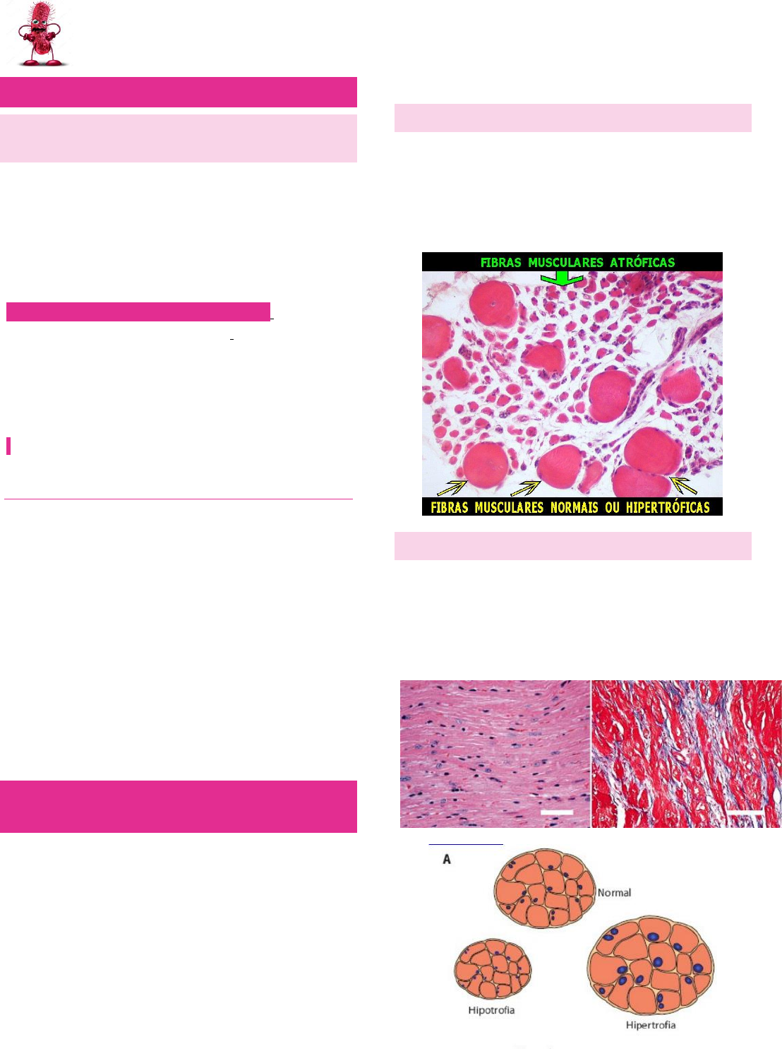 FISIOPATOLOGIA E ANATOMIA PATOLÓGICA LUANA VAZ INTRODUÇÃO À FISIOPATOLOGIA QUATRO ASPECTOS DE UM PROCESSO DE DOENÇA SÃO: Sua causa (ETIOLOGIA), os mecanismos do seu desenvolvimento (PATOGENIA), as alterações bioquímicas e estruturais induzidas nas células e órgãos do corpo (ALTERAÇÕES MOLECULARES E MORFOLÓGICAS) e as consequências funcionais dessas mudanças (MANIFESTAÇÕES CLÍNICAS). FATORES OU AGENTES ETIOLÓGICOS : biológicos (por exemplo, bactérias e vírus), físicos (por exemplo, traumatismo, queimaduras, radiação), químicos (por exemplo, pesticidas e nicotina), a herança genética (por exemplo, síndromes cromossômicas) excessos ou déficits nutricionais (por exemplo, obesidade e avitaminose. FATORES QUE PREDISPÕEM A UMA DOENÇA SÃO CHAMADOS DE FATORES DE RISCO. EVOLUÇÃO DAS DOENÇAS: Exposição ou lesão; Latência ou período de incubação; Período prodrômico; Fase aguda; Remissão – (Falha no processo terapêutico, trazendo por vezes situações de maior agravamento quando comparadas à fase aguda inicial); Convalescença; Recuperação. DISTÚRBIOS DO CRESCIMENTO, PROLIFERAÇÃO E DIFERENCIAÇÃO CELULAR O crescimento ou multiplicação celular é o mecanismo responsável pela formação das células que compõem os indivíduos. A diferenciação refere-se à especialização morfológica e funcional das células que permite o desenvolvimento do organismo como um todo. Asadaptações celulares são respostas estruturais e funcionais reversíveis a estresses fisiológicos mais excessivos e a alguns estímulos patológicos, permitindo que a célula sobreviva e continue a funcionar. ATROFIA Diante de uma diminuição na demanda de trabalho ou de condições ambientais adversas, a maioria das células é capaz de reverter a um tamanho menor e a um nível mais baixo e mais eficiente de funcionamento compatível com a sobrevida. HIPERTROFIA é um crescimento das células que resulta em aumento do tamanho do órgão. O órgão hipertrofiado não possui novas células, apenas células maiores. Tal crescimento é devido à síntese em maior quantidade de componentes estruturais das células (fisiológica ou patológica). FISIOPATOLOGIA E ANATOMIA PATOLÓGICA LUANA VAZ HIPERPLASIA é o aumento no número de células de um órgão ou tecido. Existem dois tipos de hiperplasia fisiológica: 1) hiperplasia hormonal, que aumenta a capacidade funcional de um tecido, quando necessário; (Tec. mamário puberdade), 2) hiperplasia compensatória, que eleva a massa de tecido após lesão ou ressecção parcial (hepatectomia parcial). HIPOPLASIA é a diminuição da população celular de um tecido, órgão ou parte do corpo; Fisiológica ou Patológica. As hipoplasias fisiológicas mais comuns são involução do timo a partir da puberdade e das gônadas no climatério. METAPLASIA Representa uma alteração reversível na qual um tipo de célula adulta (epitelial ou mesenquimal) é substituído por outro modelo celular de mesma linhagem. Ela representa uma substituição adaptativa de células sensíveis ao estresse por tipos celulares mais capazes de suportar o ambiente hostil. FISIOPATOLOGIA E ANATOMIA PATOLÓGICA LUANA VAZ DISPLASIA denomina condições patológicas muito diferentes; sendo assim, trata-se de um termo complexo. Ela pode ser definida como uma condição adquirida caracterizada por alterações celulares do crescimento e da diferenciação acompanhadas de redução ou perda da diferenciação das células afetadas. Muitas vezes, as displasias estão associadas a tecidos metaplásicos ou se originam neles. O epitélio displásico é caracterizado por perda da uniformidade das células epiteliais, assim como da orientação arquitetural. Elas são classificadas em leves, moderadas e graves. A depender do sítio anatômico, denomina- se de neoplasias intraepiteliais de grau I, II ou III. (lesões precursoras de câncer). LESÃO E MORTE CELULAR LESÃO CELULAR A lesão celular ocorre quando as células são estressadas tão excessivamente que não são mais capazes de se adaptar ou quando são expostas a agentes lesivos à sua natureza ou são prejudicadas por anomalias intrínsecas. ESSAS LESÕES PODEM SER CAUSADAS POR AGENTES EXÓGENOS (AGENTES FÍSICOS, QUÍMICOS, BIOLÓGICOS) E ENDÓGENOS, OU AINDA POR CAUSA DESCONHECIDAS QUE RECEBEM A DENOMINAÇÃO DE CAUSA CRIPTOGENÉTICA, IDIOPÁTICA OU ESSENCIAL. MECANISMOS PRINCIPAIS formação de radicais livres hipóxia e depleção de ATP perturbação intracelular da homeostasia de cálcio. Um exemplo disso é o infarto cardíaco. Devido a uma possível hipertrofia, alguns miócitos sofrem a lesão irreversível e morrem, secundário à sobrecarga de trabalho. Outro exemplo importante e fisiológico é a embriogênese, em que naturalmente a morte celular ocorre com o desenvolvimento. FISIOPATOLOGIA E ANATOMIA PATOLÓGICA LUANA VAZ DEGENERAÇÕES São lesões reversíveis e secundárias a alterações bioquímicas que resultam em acúmulo de substâncias no interior de células. Morfologicamente, uma degeneração aparece como um acúmulo de substâncias em células. Quando a substância acumulada é um pigmento, a lesão é estudada à parte, entre as pigmentações. DEGENERAÇÕES POR ACÚMULO DE ÁGUA E ELETRÓLITO, por exemplo, a degeneração hidrópica; DEGENERAÇÕES POR ACÚMULO DE PROTEÍNAS, como a degeneração hialina; DEGENERAÇÕES POR ACÚMULO DE LIPÍDEOS, as mais importantes são a esteatose e as lipidoses; DEGENERAÇÕES POR ACÚMULO DE CARBOIDRATOS. MORTE CELULAR A morte celular é um processo e, como tal, uma sucessão de eventos, sendo às vezes muito difícil estabelecer qual é o fator que determina a irreversibilidade da lesão, ou seja, o ponto de não retorno. Se a morte celular ocorre no organismo vivo e é seguida de autólise, o processo recebe o nome de NECROSE. AUTÓLISE – degradação enzimática dos componentes celulares por enzimas da própria célula liberadas de lisoss