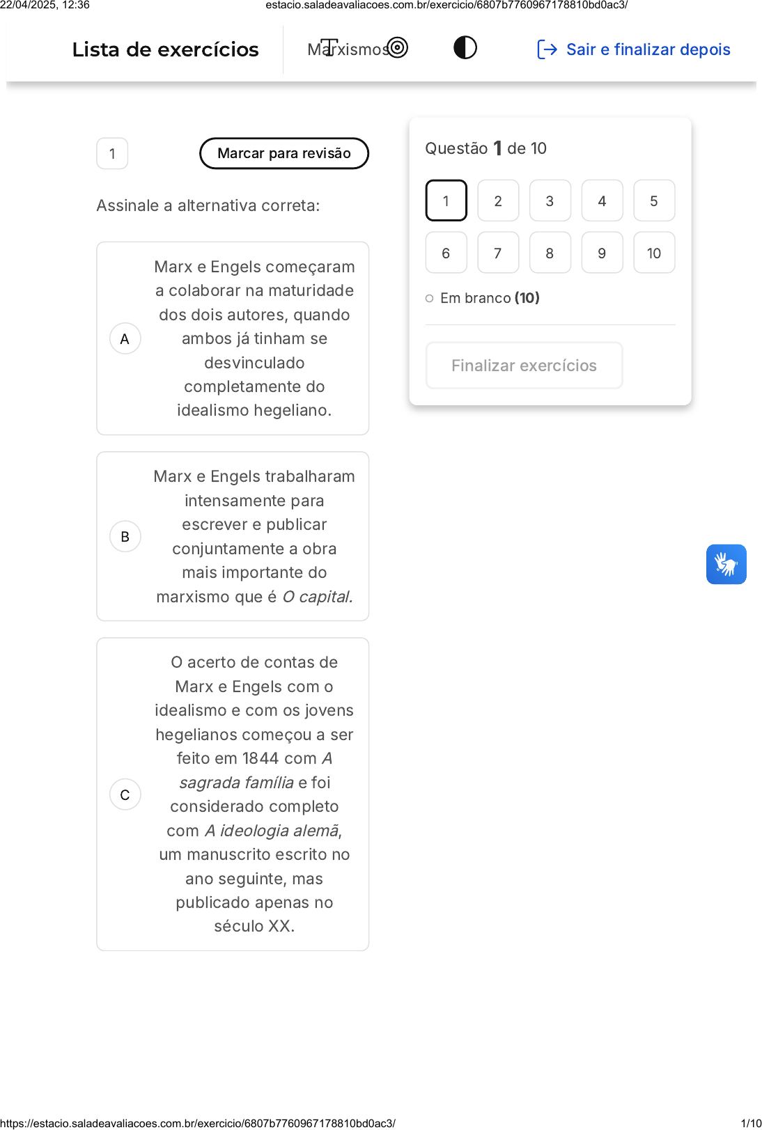 A B C 1 Marcar para revisão Assinale a alternativa correta: Marx e Engels começaram a colaborar na maturidade dos dois autores, quando ambos já tinham se desvinculado completamente do idealismo hegeliano. Marx e Engels trabalharam intensamente para escrever e publicar conjuntamente a obra mais importante do marxismo que é O capital. O acerto de contas de Marx e Engels com o idealismo e com os jovens hegelianos começou a ser feito em 1844 com A sagrada família e foi considerado completo com A ideologia alemã, um manuscrito escrito no ano seguinte, mas publicado apenas no século XX. Questão 1 de 10 Em branco (10) 1 2 3 4 5 6 7 8 9 10 Finalizar exercícios Lista de exercícios Marxismos Sair e finalizar depois 22/04/2025, 12:36 estacio.saladeavaliacoes.com.br/exercicio/6807b7760967178810bd0ac3/ https://estacio.saladeavaliacoes.com.br/exercicio/6807b7760967178810bd0ac3/ 1/10 D E O manuscrito abandonado 'à crítica corrosiva dos ratos' chama-se Manuscritos econômico- filosóficos. Todas as alternativas estão incorretas. 2 Marcar para revisão O marxismo, desde suas origens com Karl Marx, passou por diversas transformações e adaptações. Na Alemanha, o _________ desempenhou um papel central na disseminação das ideias marxistas, apesar de críticas ao que foi denominado "marxismo vulgar". Na Rússia, as teorias de Marx encontraram um terreno fértil, mas exigiram adaptações significativas para se ajustarem às realidades locais. Essas adaptações foram fundamentais para a ocorrência da _________ em 1917. Além disso, a teoria marxista foi influente na Itália, onde Antonio Gramsci contribuiu com suas ideias sobre _________ e a guerra de posição, enriquecendo o marxismo com novas perspectivas. Assinale a alternativa que contém a sequência correta para preencher as lacunas acima. 22/04/2025, 12:36 estacio.saladeavaliacoes.com.br/exercicio/6807b7760967178810bd0ac3/ https://estacio.saladeavaliacoes.com.br/exercicio/6807b7760967178810bd0ac3/ 2/10 A B C D E Partido Comunista - Revolução Chinesa - cultura de massa. Partido Social Democrata - Revolução Russa - hegemonia. Partido Trabalhista - Guerra Civil Espanhola - teoria do valor. Partido Socialista - Revolução Francesa - dialética. Partido Liberal - Revolução Americana - estrutura social. 3 Marcar para revisão Durante uma conferência sobre marxismo, um painel de discussão examina o desenvolvimento do marxismo na Rússia pré- revolucionária. Os debatedores focam na maneira como Lenin adaptou as teorias marxistas às condições específicas da Rússia, preparando o terreno para a Revolução Russa de 1917. Qual foi uma das principais contribuições de Lenin para a adaptação do marxismo na Rússia? 22/04/2025, 12:36 estacio.saladeavaliacoes.com.br/exercicio/6807b7760967178810bd0ac3/ https://estacio.saladeavaliacoes.com.br/exercicio/6807b7760967178810bd0ac3/ 3/10 A B C D E Teoria do valor-trabalho. Democracia direta. Vanguarda revolucionária. Abolição da propriedade privada. Federalismo. 4 Marcar para revisão Um seminário em uma faculdade de filosofia explora o marxismo na teoria crítica, com especial atenção à Escola de Frankfurt. Os alunos discutem como a escola integrou o marxismo com a filosofia, a sociologia e a psicanálise, analisando o capitalismo, a modernidade e a indústria cultural. Considerando o texto, analise as afirmativas abaixo. I. A Escola de Frankfurt rejeitou completamente o marxismo em suas análises teóricas. II. A integração do marxismo com a psicanálise foi um aspecto central da Escola de Frankfurt. III. A Escola de Frankfurt concentrou-se exclusivamente em análises econômicas. Avalie as alternativas. 22/04/2025, 12:36 estacio.saladeavaliacoes.com.br/exercicio/6807b7760967178810bd0ac3/ https://estacio.saladeavaliacoes.com.br/exercicio/6807b7760967178810bd0ac3/ 4/10 A B C D E A B Apenas a afirmativa I está correta. Apenas a afirmativa II está correta. Apenas a afirmativa III está correta. Apenas as afirmativas II e III estão corretas. Apenas as alternativas I e III afirmativas estão corretas. 5 Marcar para revisão Um aluno de sociologia explora o conceito de "luta de classes" em Marx, relacionando-o com as disputas pela lenha no século XIX. Ele argumenta que essas disputas iniciais refletem uma ideia marxista cujo elemento central seria fundamental para as transformações sociais. Segundo Marx, qual elemento seria central para as transformações sociais? A cooperação entre diferentes classes sociais. O conflito econômico. 22/04/2025, 12:36 estacio.saladeavaliacoes.com.br/exercicio/6807b7760967178810bd0ac3/ https://estacio.saladeavaliacoes.com.br/exercicio/6807b7760967178810bd0ac3/ 5/10 C D E A B C D E A intervenção estatal. A evolução cultural. As disputas religiosas. 6 Marcar para revisão Uma escola implementa um programa que ensina os alunos sobre a história das lutas trabalhistas e a importância da solidariedade de classe, incentivando-os a pensar criticamente sobre estruturas sociais. Esta abordagem educacional é um exemplo de qual conceito marxista? Ideologia. Superestrutura. Materialismo Histórico. Mais-valia. Fetichismo da Mercadoria. 22/04/2025, 12:36 estacio.saladeavaliacoes.com.br/exercicio/6807b7760967178810bd0ac3/ https://estacio.saladeavaliacoes.com.br/exercicio/6807b7760967178810bd0ac3/ 6/10 A B C D E 7 Marcar para revisão Um historiador analisa o impacto das obras de Marx e Engels no pensamento político. Ele destaca uma delas como um marco, enfatizando sua importância na disseminação das ideias marxistas e na formulação de uma crítica ao capitalismo. Qual obra de Marx e Engels é considerada um marco fundamental no pensamento marxista? "A Ideologia Alemã." "O Capital." "O Manifesto do Partido Comunista." "Crítica da Filosofia do Direito de Hegel." "A Sagrada Família." 8 Marcar para revisão Uma cidade experimenta um aumento significativo nos preços de imóveis, levando a um deslocamento de moradores de baixa renda para área