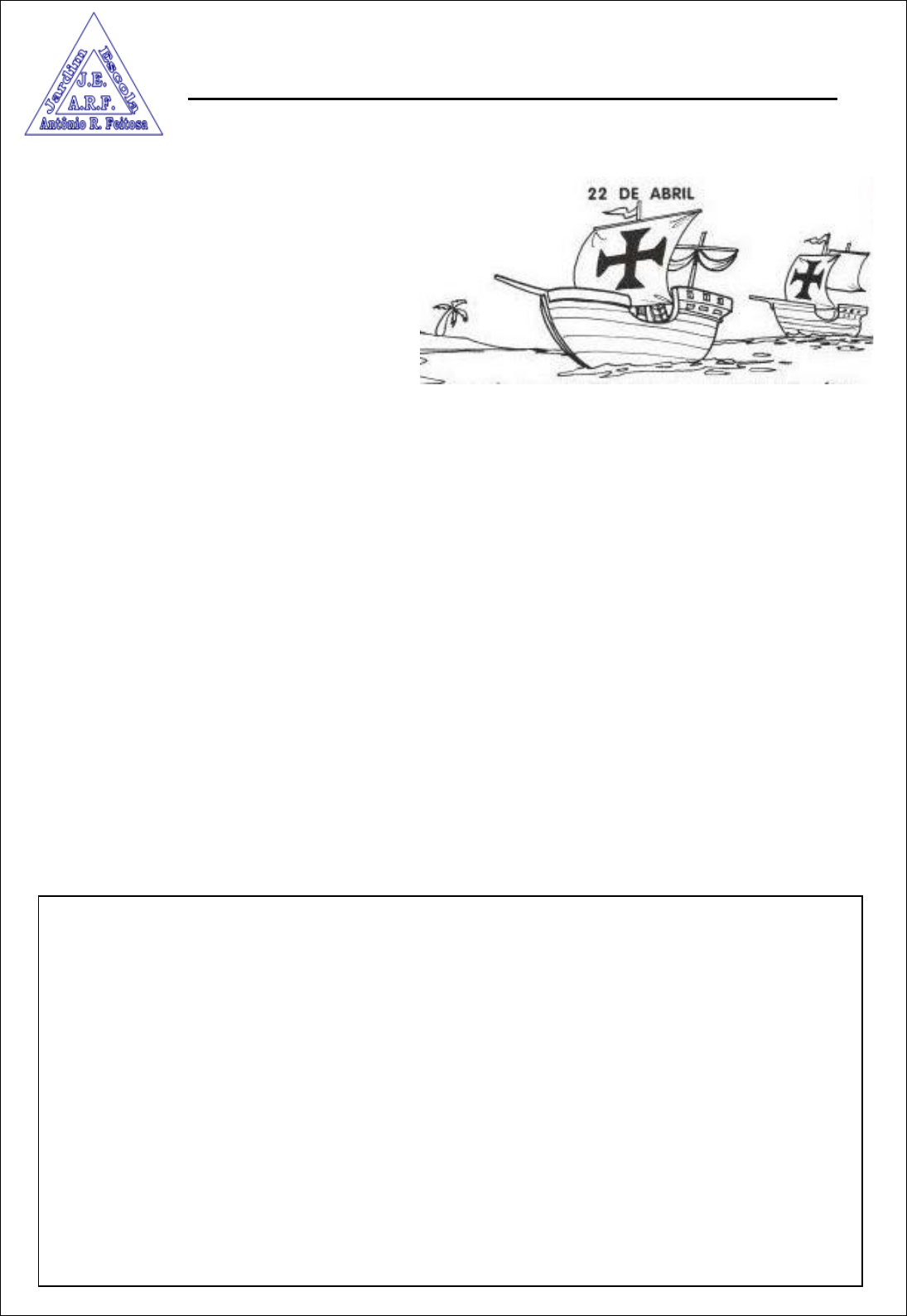 DESCOBRIMENTO DO BRASIL Uma grande esquadra, comandada por Pedro Álvares Cabral, saiu de Portugal para uma longa viagem, numa expedição para as Índias. No dia 22 de abril de 1500, os portugueses avistaram, de longe, as terras do nosso país. Eles avistaram, no litoral baiano, um monte, ao qual deram o nome de Monte Pascoal, porque era época de Páscoa. Ao desembarcarem, os portugueses encontraram uma terra cheia de florestas e povoada por índios. Inicialmente, pensaram que era uma grande ilha no meio do mar e deram a ela nome de Ilha de Vera Cruz. Depois, mudaram o nome para Terra de Santa Cruz. Alguns anos depois, resolveram dar à terra descoberta outro nome: Brasil. O nome Brasil foi dado por causa de uma madeira de cor vermelha, extraída de uma árvore chamada pau-brasil, que existia em grande quantidade nas nossas terras. 1- Complete as frases conforme o texto: ________________________________________________________descobriu o ___________________________________________ durante uma expedição para as Índias. ______________________________________foi o primeiro nome dado ao Brasil. O ___________________________________, árvore que existia em grande quantidade no Brasil deu origem ao nome do nosso País. 2- Faça o desenho da árvore “pau-brasil”, da forma como você imagina. Capriche: