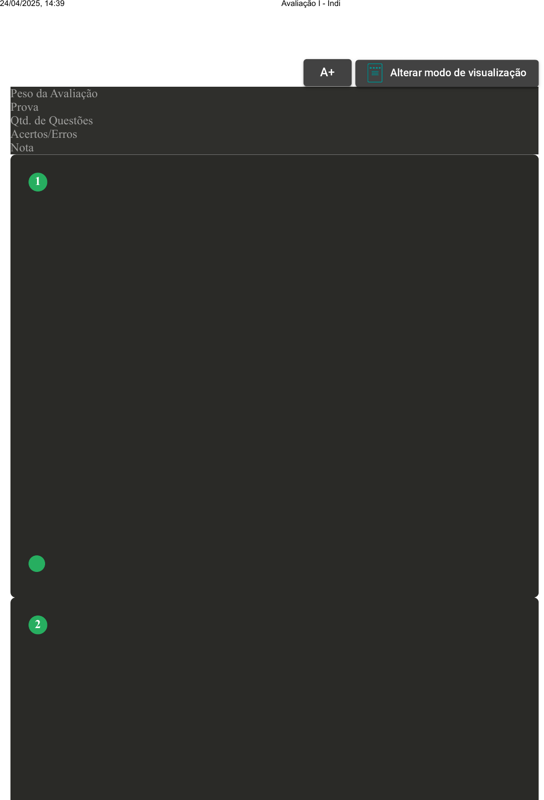 Prova Impressa GABARITO | Avaliação I - Individual (Cod.:1023033) Peso da Avaliação 2,00 Prova 97589813 Qtd. de Questões 10 Acertos/Erros 9/1 Nota 9,00 A avaliação das AVDs e AIVDs é crucial para o terapeuta ocupacional, pois permite identificar as dificuldades e as habilidades preservadas do paciente, orientando a escolha das técnicas terapêuticas mais adequadas e a criação de um plano de tratamento individualizado que visa a recuperação da funcionalidade e a promoção da autonomia. Fonte: adaptado de: TROMBLY, C. A.; RADOMSKI, M. V. Terapia Ocupacional para Disfunções Físicas. 5. ed. São Paulo: Santos Editora, 2005. Considerando o texto e as informações sobre o papel do Terapeuta Ocupacional e o processo de intervenção em disfunções físicas, analise as afirmativas a seguir: I. A avaliação detalhada direciona o tratamento, considerando as limitações e potencialidades do paciente. II. O terapeuta ocupacional apenas ensina os pacientes a realizar atividades manuais, como vestir-se e comer. III. A terapia ocupacional se limita a atividades recreativas e não envolve a avaliação das necessidades do paciente. IV. O conhecimento das fases da terapia e das técnicas utilizadas é essencial para um plano de tratamento eficaz e personalizado. É correto o que se afirma em: A I, II e III, apenas. B III e IV, apenas. C II e III, apenas. D II, III e IV, apenas. E I e IV, apenas. O processo de intervenção em terapia ocupacional para adultos e idosos com disfunções físicas é complexo e envolve várias etapas cruciais para garantir a máxima independência e qualidade de vida dos pacientes. Fonte: adaptado de: TROMBLY, C. A.; RADOMSKI, M. V. Terapia Ocupacional para Disfunções Físicas. 5. ed. São Paulo: Santos Editora, 2005. A respeito do processo de intervenção em terapia ocupacional, assinale a alternativa correta que descreve uma etapa ou aspecto crucial desse processo: A O plano de tratamento em terapia ocupacional deve ser estático, com metas fixas e sem necessidade de ajustes baseados no progresso do paciente. VOLTAR A+ Alterar modo de visualização 1 2 24/04/2025, 14:39 Avaliação I - Individual about:blank 1/6 B A avaliação inicial do paciente inclui a coleta de dados do prontuário, uma entrevista com o paciente e familiares, e a análise das habilidades funcionais relacionadas às AVD e AIVD, para estabelecer metas personalizadas e realistas. C O terapeuta ocupacional deve definir metas de tratamento sem considerar as expectativas e desejos do paciente, focando apenas nas habilidades funcionais observadas. D A intervenção em terapia ocupacional deve começar apenas após o desenvolvimento do plano de tratamento, sem necessidade de avaliação inicial detalhada do paciente. E O terapeuta ocupacional deve desenvolver o plano de tratamento sem levar em consideração as estratégias e técnicas a serem usadas, focando apenas no cronograma das intervenções. AVDs e AIVDs são termos utilizados na área da saúde para descrever diferentes tipos de atividades que as pessoas realizam no dia a dia. Essas atividades são importantes para avaliar a autonomia e a independência de um indivíduo, especialmente em casos de doenças, lesões ou envelhecimento. Fonte: adaptado de: CAVALCANTE, A.; GALVÃO, C. Terapia Ocupacional: fundamentação e prática. 2. ed. Rio de Janeiro: Guanabara Koogan, 2023. Com base nas informações apresentadas, avalie as asserções a seguir e a relação proposta entre elas: I. As Atividades de Vida Diária (AVDs) são cruciais para a manutenção da autonomia e independência dos indivíduos. PORQUE II. A avaliação das AVDs permite identificar as necessidades de cada paciente, orientando a intervenção terapêutica e promovendo a capacidade de realizar atividades de forma independente. A respeito dessas asserções, assinale a opção correta: A A asserção I é uma proposição falsa, e a II é uma proposição verdadeira. B As asserções I e II são verdadeiras, e a II é uma justificativa correta da I. C As asserções I e II são verdadeiras, mas a II não é uma justificativa correta da I. D As asserções I e II são falsas. E A asserção I é uma proposição verdadeira, e a II é uma proposição falsa. O desenvolvimento de planos de intervenção baseados em evidências é essencial para a terapia ocupacional em adultos e idosos com disfunções neurológicas. Essa abordagem integra o conhecimento científico mais atual com a experiência clínica do terapeuta e as preferências do paciente, visando otimizar os resultados do tratamento. Fonte: adaptado de: CAVALCANTE, A.; GALVÃO, C. Terapia Ocupacional: fundamentação e prática. 2. ed. Rio de Janeiro: Guanabara Koogan, 2023. Com base nas informações apresentadas, avalie as asserções a seguir e a relação proposta entre elas: I. A prática baseada em evidências na terapia ocupacional valoriza a individualização do tratamento. PORQUE II. A necessidade de revisar os objetivos terapêuticos e ajustar as abordagens de tratamento decorre da dinâmica do processo terapêutico e da emergência de novas evidências científicas. A respeito dessas asserções, assinale a opção correta: A As asserções I e II são verdadeiras, mas a II não é uma justificativa correta da I. 3 4 24/04/2025, 14:39 Avaliação I - Individual about:blank 2/6 B As asserções I e II são falsas. C A asserção I é uma proposição verdadeira, e a II é uma proposição falsa. D A asserção I é uma proposição falsa, e a II é uma proposição verdadeira. E As asserções I e II são verdadeiras, e a II é uma justificativa correta da I. A doença de Parkinson é uma condição degenerativa do sistema nervoso central que afeta principalmente o controle motor. Devido à diminuição da produção de dopamina, um neurotransmissor essencial para a coordenação dos movimentos, os pacientes apresentam sintomas como tremores, rigidez muscular, lentidão dos movimentos (bradici