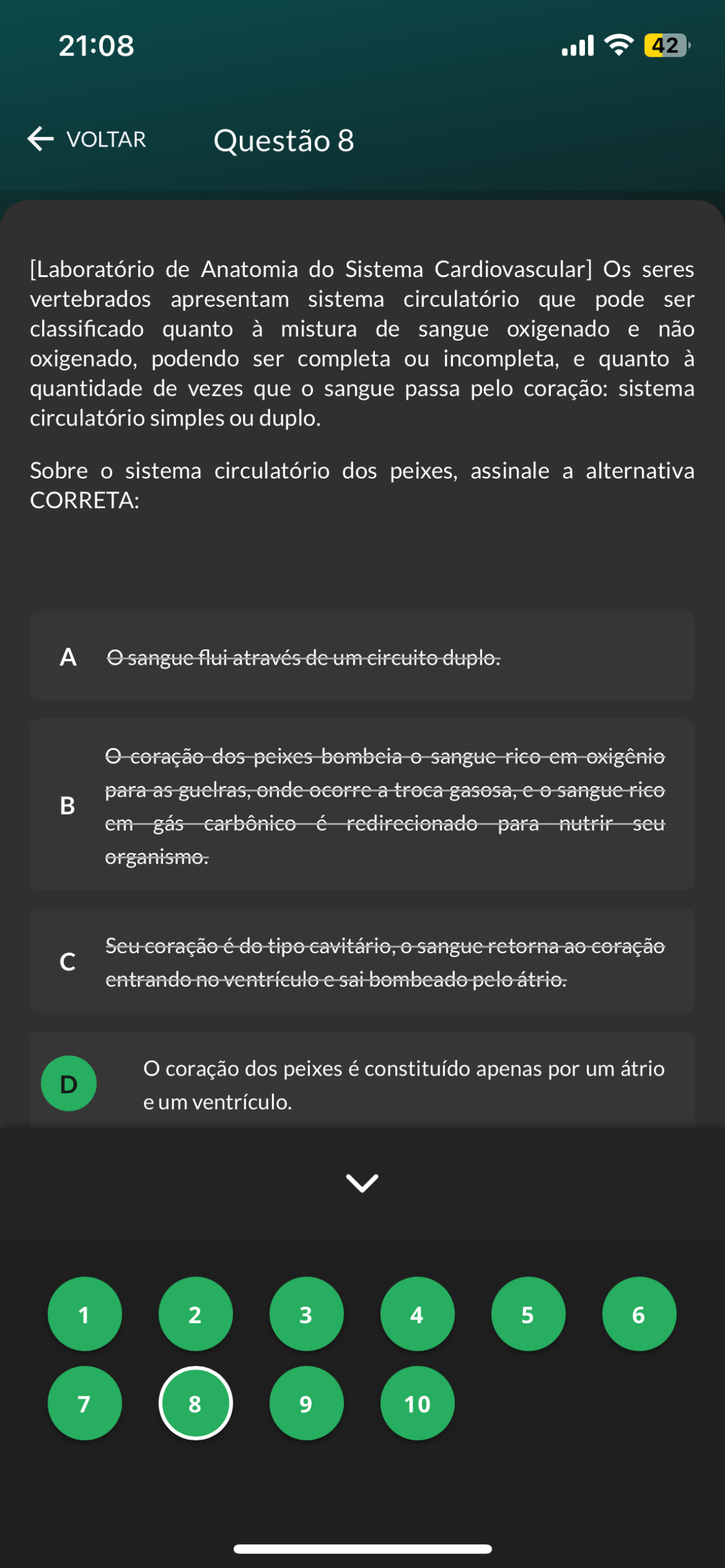 21:08 42 VOLTAR Questão 8 [Laboratório de Anatomia do Sistema Cardiovascular] Os seres vertebrados apresentam sistema circulatório que pode ser classificado quanto à mistura de sangue oxigenado e não oxigenado, podendo ser completa ou incompleta, e quanto à quantidade de vezes que sangue passa pelo coração: sistema circulatório simples ou duplo. Sobre sistema circulatório dos peixes, assinale a alternativa CORRETA: A sangue flui através de um circuito duplo. coração des peixes bombeia sangue rice em oxigênie para as ocorre a troca e sangue B em gás é redirecionado para nutrir seu organismo. é tipo cavitário, e sangue retorna ao entrando no e sai bombeade pelo O coração dos peixes é constituído apenas por um átrio D e um V 1 2 3 4 5 6 7 8 9 10
