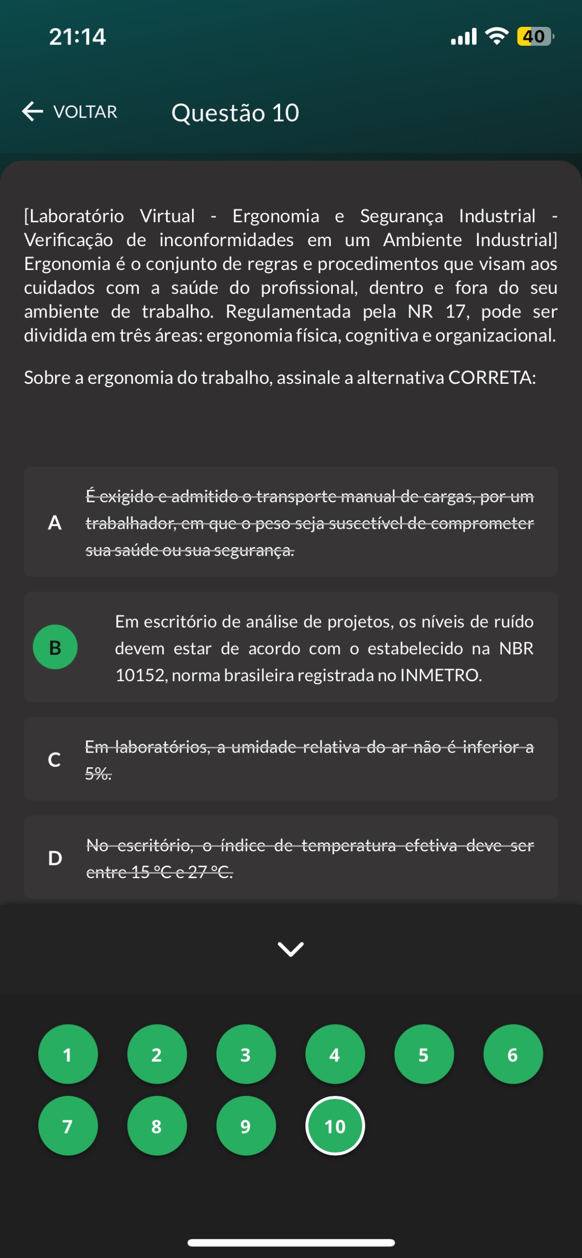 21:14 40 VOLTAR Questão 10 [Laboratório Virtual - Ergonomia e Segurança Industrial - Verificação de inconformidades em um Ambiente Industrial] Ergonomia é conjunto de regras e procedimentos que visam aos cuidados com a saúde do profissional, dentro e fora do seu ambiente de trabalho. Regulamentada pela NR 17, pode ser dividida em três áreas: ergonomia física, cognitiva e organizacional. Sobre a ergonomia do trabalho, assinale a alternativa CORRETA: e admitido transporte manual de cargas, A trabalhador, em-que e pese seja de comprometer saúde ou sua segurança. Em escritório de análise de projetos, os níveis de ruído devem estar de acordo com estabelecido na NBR 10152, norma brasileira registrada no INMETRO. Em a umidade relativa ar não é inferior a 5%. e índice de temperatura efetiva deve ser D entre 15 °C e 1 2 3 4 5 6 7 8 9 10