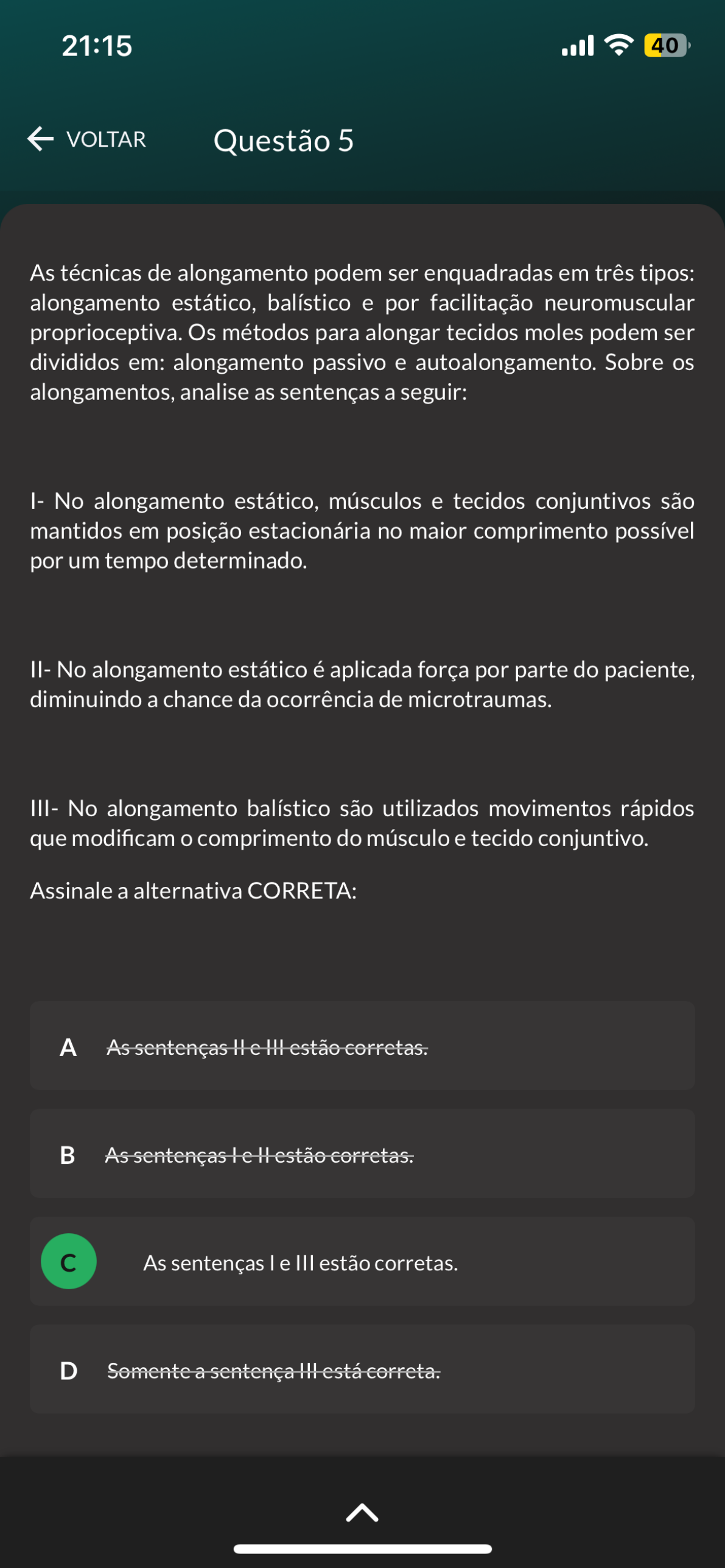 21:15 40 VOLTAR Questão 5 As técnicas de alongamento podem ser enquadradas em três tipos: alongamento estático, balístico e por facilitação neuromuscular proprioceptiva. Os métodos para alongar tecidos moles podem ser divididos em: alongamento passivo e autoalongamento. Sobre os alongamentos, analise as sentenças a seguir: I- No alongamento estático, músculos e tecidos conjuntivos são mantidos em posição estacionária no maior comprimento possível por um tempo determinado. No alongamento estático é aplicada força por parte do paciente, diminuindo a chance da ocorrência de microtraumas. III- No alongamento balístico são utilizados movimentos rápidos que modificam comprimento do músculo e tecido conjuntivo. Assinale a alternativa CORRETA: A As III estão corretas. B As-sentenças H corretas. As sentenças I e III estão corretas. D a III está correta.