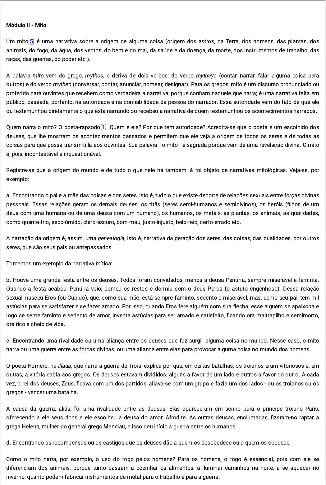 Módulo II - Mito Um mito[5] é uma narrativa sobre a origem de alguma coisa (origem dos astros, da Terra, dos homens, das plantas, dos animais, do fogo, da água, dos ventos, do bem e do mal, da saúde e da doença, da morte, dos instrumentos de trabalho, das raças, das guerras, do poder etc.). A palavra mito vem do grego, mythos, e deriva de dois verbos: do verbo mytheyo (contar, narrar, falar alguma coisa para outros) e do verbo mytheo (conversar, contar, anunciar, nomear, designar). Para os gregos, mito é um discurso pronunciado ou proferido para ouvintes que recebem como verdadeira a narrativa, porque confiam naquele que narra; é uma narrativa feita em público, baseada, portanto, na autoridade e na confiabilidade da pessoa do narrador. Essa autoridade vem do fato de que ele ou testemunhou diretamente o que está narrando ou recebeu a narrativa de quem testemunhou os acontecimentos narrados. Quem narra o mito? O poeta-rapsodo[1]. Quem é ele? Por que tem autoridade? Acredita-se que o poeta é um escolhido dos deuses, que lhe mostram os acontecimentos passados e permitem que ele veja a origem de todos os seres e de todas as coisas para que possa transmiti-la aos ouvintes. Sua palavra - o mito - é sagrada porque vem de uma revelação divina. O mito é, pois, incontestável e inquestionável. Registre-se que a origem do mundo e de tudo o que nele há também já foi objeto de narrativas mitológicas. Veja-se, por exemplo: a. Encontrando o pai e a mãe das coisas e dos seres, isto é, tudo o que existe decorre de relações sexuais entre forças divinas pessoais. Essas relações geram os demais deuses: os titãs (seres semi-humanos e semidivinos), os heróis (filhos de um deus com uma humana ou de uma deusa com um humano), os humanos, os metais, as plantas, os animais, as qualidades, como quente-frio, seco-úmido, claro-escuro, bom-mau, justo-injusto, belo-feio, certo-errado etc. A narração da origem é, assim, uma genealogia, isto é, narrativa da geração dos seres, das coisas, das qualidades, por outros seres, que são seus pais ou antepassados. Tomemos um exemplo da narrativa mítica: b. Houve uma grande festa entre os deuses. Todos foram convidados, menos a deusa Penúria, sempre miserável e faminta. Quando a festa acabou, Penúria veio, comeu os restos e dormiu com o deus Poros (o astuto engenhoso). Dessa relação sexual, nasceu Eros (ou Cupido), que, como sua mãe, está sempre faminto, sedento e miserável, mas, como seu pai, tem mil astúcias para se satisfazer e se fazer amado. Por isso, quando Eros fere alguém com sua flecha, esse alguém se apaixona e logo se sente faminto e sedento de amor, inventa astúcias para ser amado e satisfeito, ficando ora maltrapilho e semimorto, ora rico e cheio de vida. c. Encontrando uma rivalidade ou uma aliança entre os deuses que faz surgir alguma coisa no mundo. Nesse caso, o mito narra ou uma guerra entre as forças divinas, ou uma aliança entre elas para provocar alguma coisa no mundo dos homens. O poeta Homero, na Ilíada, que narra a guerra de Troia, explica por que, em certas batalhas, os troianos eram vitoriosos e, em outras, a vitória cabia aos gregos. Os deuses estavam divididos, alguns a favor de um lado e outros a favor do outro. A cada vez, o rei dos deuses, Zeus, ficava com um dos partidos, aliava-se com um grupo e fazia um dos lados - ou os troianos ou os gregos - vencer uma batalha. A causa da guerra, aliás, foi uma rivalidade entre as deusas. Elas apareceram em sonho para o príncipe troiano Paris, oferecendo a ele seus dons e ele escolheu a deusa do amor, Afrodite. As outras deusas, enciumadas, fizeram-no raptar a grega Helena, mulher do general grego Menelau, e isso deu início à guerra entre os humanos. d. Encontrando as recompensas ou os castigos que os deuses dão a quem os desobedece ou a quem os obedece. Como o mito narra, por exemplo, o uso do fogo pelos homens? Para os homens, o fogo é essencial, pois com ele se diferenciam dos animais, porque tanto passam a cozinhar os alimentos, a iluminar caminhos na noite, a se aquecer no inverno, quanto podem fabricar instrumentos de metal para o trabalho e para a guerra. https://adm.online.unip.br/blank.htm#_ftn1 Um titã, Prometeu, mais amigo dos homens do que dos deuses, roubou uma centelha de fogo e a trouxe de presente para os humanos. Prometeu foi castigado (amarrado num rochedo para que as aves de rapina, eternamente, devorassem seu fígado) e os homens também foram castigados (cf. A caixa de Pandora). Vemos, portanto, que o mito narra a origem das coisas por meio de lutas, alianças e relações sexuais entre forças sobrenaturais que governam o mundo e o destino dos homens. Como os mitos sobre a origem do mundo são genealogias, diz-se que são cosmogonias e teogonias. A palavra gonia vem de duas palavras gregas: do verbo gennao (engendrar, gerar, fazer nascer e crescer) e do substantivo genos (nascimento, gênese, descendência, gênero, espécie). Gonia, portanto, quer dizer: geração, nascimento a partir da concepção sexual e do parto. Cosmos, como já vimos, quer dizer mundo ordenado e organizado. Assim, a cosmogonia é a narrativa sobre o nascimento e a organização do mundo, a partir de forças geradoras (pai e mãe) divinas. Teogonia é uma palavra composta de gonia e theós, que em grego significa: as coisas divinas, os seres divinos, os deuses. A teogonia é, portanto, a narrativa da origem dos deuses, a partir de seus pais e antepassados. A Filosofia, ao nascer, é, como já dissemos, uma cosmologia, uma explicação racional sobre a origem do mundo e sobre as causas de transformações e repetições das coisas; para isso, ela nasce de uma transformação gradual dos mitos ou de uma ruptura radical com os mitos? Continua ou rompe com a cosmogonia e a teogonia? Respostas dadas: A primeira delas foi dada no fim do século XIX e começo do século XX, quando reinava um grande otimismo sobre os poderes científicos e capacidades técnicas d
