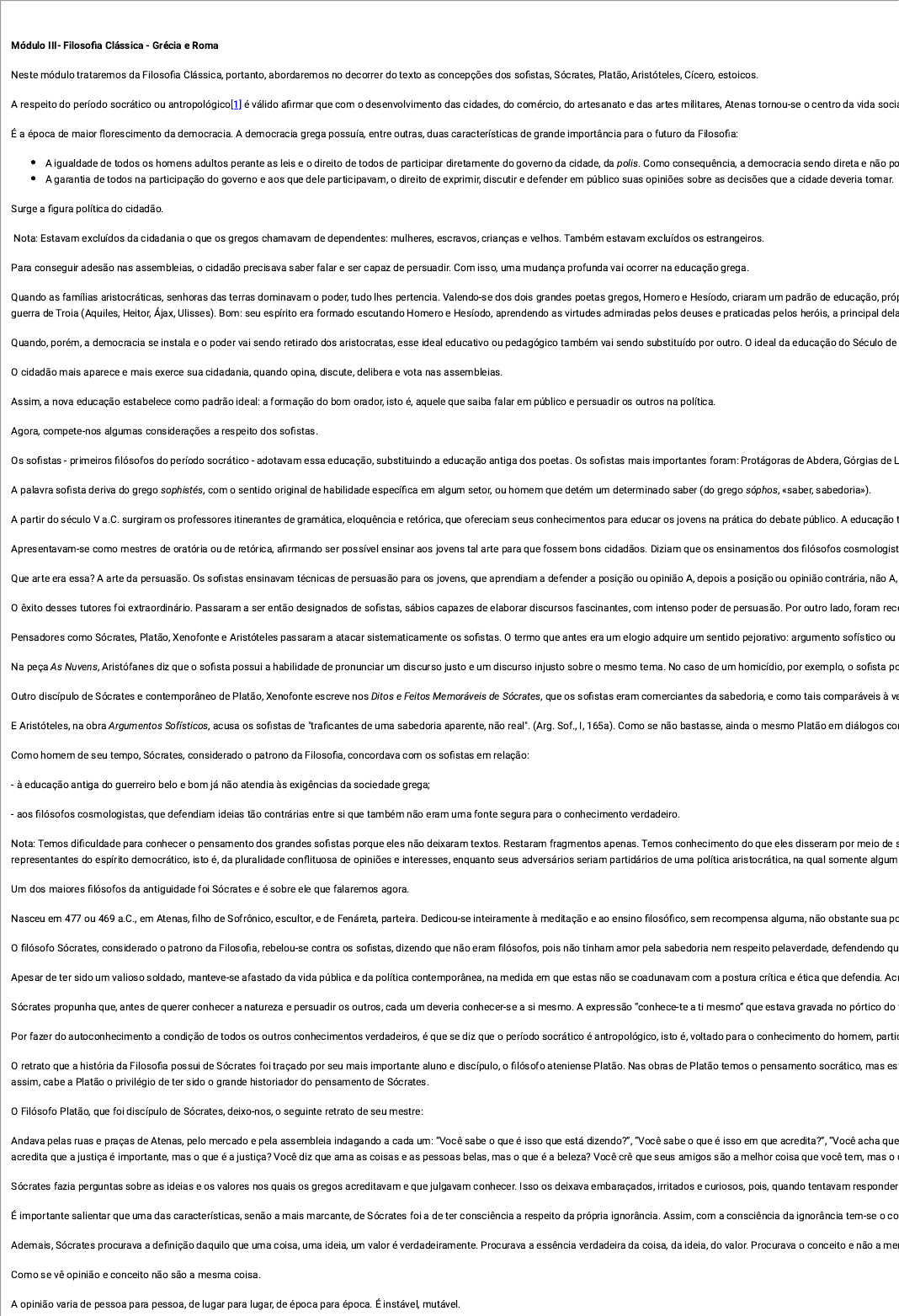 Módulo III- Filosofia Clássica - Grécia e Roma Neste módulo trataremos da Filosofia Clássica, portanto, abordaremos no decorrer do texto as concepções dos sofistas, Sócrates, Platão, Aristóteles, Cícero, estoicos. A respeito do período socrático ou antropológico[1] é válido afirmar que com o desenvolvimento das cidades, do comércio, do artesanato e das artes militares, Atenas tornou-se o centro da vida socia É a época de maior florescimento da democracia. A democracia grega possuía, entre outras, duas características de grande importância para o futuro da Filosofia: A igualdade de todos os homens adultos perante as leis e o direito de todos de participar diretamente do governo da cidade, da polis. Como consequência, a democracia sendo direta e não po A garantia de todos na participação do governo e aos que dele participavam, o direito de exprimir, discutir e defender em público suas opiniões sobre as decisões que a cidade deveria tomar. Surge a figura política do cidadão. Nota: Estavam excluídos da cidadania o que os gregos chamavam de dependentes: mulheres, escravos, crianças e velhos. Também estavam excluídos os estrangeiros. Para conseguir adesão nas assembleias, o cidadão precisava saber falar e ser capaz de persuadir. Com isso, uma mudança profunda vai ocorrer na educação grega. Quando as famílias aristocráticas, senhoras das terras dominavam o poder, tudo lhes pertencia. Valendo-se dos dois grandes poetas gregos, Homero e Hesíodo, criaram um padrão de educação, próp guerra de Troia (Aquiles, Heitor, Ájax, Ulisses). Bom: seu espírito era formado escutando Homero e Hesíodo, aprendendo as virtudes admiradas pelos deuses e praticadas pelos heróis, a principal dela Quando, porém, a democracia se instala e o poder vai sendo retirado dos aristocratas, esse ideal educativo ou pedagógico também vai sendo substituído por outro. O ideal da educação do Século de O cidadão mais aparece e mais exerce sua cidadania, quando opina, discute, delibera e vota nas assembleias. Assim, a nova educação estabelece como padrão ideal: a formação do bom orador, isto é, aquele que saiba falar em público e persuadir os outros na política. Agora, compete-nos algumas considerações a respeito dos sofistas. Os sofistas - primeiros filósofos do período socrático - adotavam essa educação, substituindo a educação antiga dos poetas. Os sofistas mais importantes foram: Protágoras de Abdera, Górgias de L A palavra sofista deriva do grego sophistés, com o sentido original de habilidade específica em algum setor, ou homem que detém um determinado saber (do grego sóphos, «saber, sabedoria»). A partir do século V a.C. surgiram os professores itinerantes de gramática, eloquência e retórica, que ofereciam seus conhecimentos para educar os jovens na prática do debate público. A educação t Apresentavam-se como mestres de oratória ou de retórica, afirmando ser possível ensinar aos jovens tal arte para que fossem bons cidadãos. Diziam que os ensinamentos dos filósofos cosmologist Que arte era essa? A arte da persuasão. Os sofistas ensinavam técnicas de persuasão para os jovens, que aprendiam a defender a posição ou opinião A, depois a posição ou opinião contrária, não A, O êxito desses tutores foi extraordinário. Passaram a ser então designados de sofistas, sábios capazes de elaborar discursos fascinantes, com intenso poder de persuasão. Por outro lado, foram rece Pensadores como Sócrates, Platão, Xenofonte e Aristóteles passaram a atacar sistematicamente os sofistas. O termo que antes era um elogio adquire um sentido pejorativo: argumento sofístico ou Na peça As Nuvens, Aristófanes diz que o sofista possui a habilidade de pronunciar um discurso justo e um discurso injusto sobre o mesmo tema. No caso de um homicídio, por exemplo, o sofista po Outro discípulo de Sócrates e contemporâneo de Platão, Xenofonte escreve nos Ditos e Feitos Memoráveis de Sócrates, que os sofistas eram comerciantes da sabedoria, e como tais comparáveis à ve E Aristóteles, na obra Argumentos Sofísticos, acusa os sofistas de "traficantes de uma sabedoria aparente, não real". (Arg. Sof., I, 165a). Como se não bastasse, ainda o mesmo Platão em diálogos com Como homem de seu tempo, Sócrates, considerado o patrono da Filosofia, concordava com os sofistas em relação: - à educação antiga do guerreiro belo e bom já não atendia às exigências da sociedade grega; - aos filósofos cosmologistas, que defendiam ideias tão contrárias entre si que também não eram uma fonte segura para o conhecimento verdadeiro. Nota: Temos dificuldade para conhecer o pensamento dos grandes sofistas porque eles não deixaram textos. Restaram fragmentos apenas. Temos conhecimento do que eles disseram por meio de s representantes do espírito democrático, isto é, da pluralidade conflituosa de opiniões e interesses, enquanto seus adversários seriam partidários de uma política aristocrática, na qual somente algum Um dos maiores filósofos da antiguidade foi Sócrates e é sobre ele que falaremos agora. Nasceu em 477 ou 469 a.C., em Atenas, filho de Sofrônico, escultor, e de Fenáreta, parteira. Dedicou-se inteiramente à meditação e ao ensino filosófico, sem recompensa alguma, não obstante sua po O filósofo Sócrates, considerado o patrono da Filosofia, rebelou-se contra os sofistas, dizendo que não eram filósofos, pois não tinham amor pela sabedoria nem respeito pelaverdade, defendendo qu Apesar de ter sido um valioso soldado, manteve-se afastado da vida pública e da política contemporânea, na medida em que estas não se coadunavam com a postura crítica e ética que defendia. Acr Sócrates propunha que, antes de querer conhecer a natureza e persuadir os outros, cada um deveria conhecer-se a si mesmo. A expressão “conhece-te a ti mesmo” que estava gravada no pórtico do t Por fazer do autoconhecimento a condição de todos o