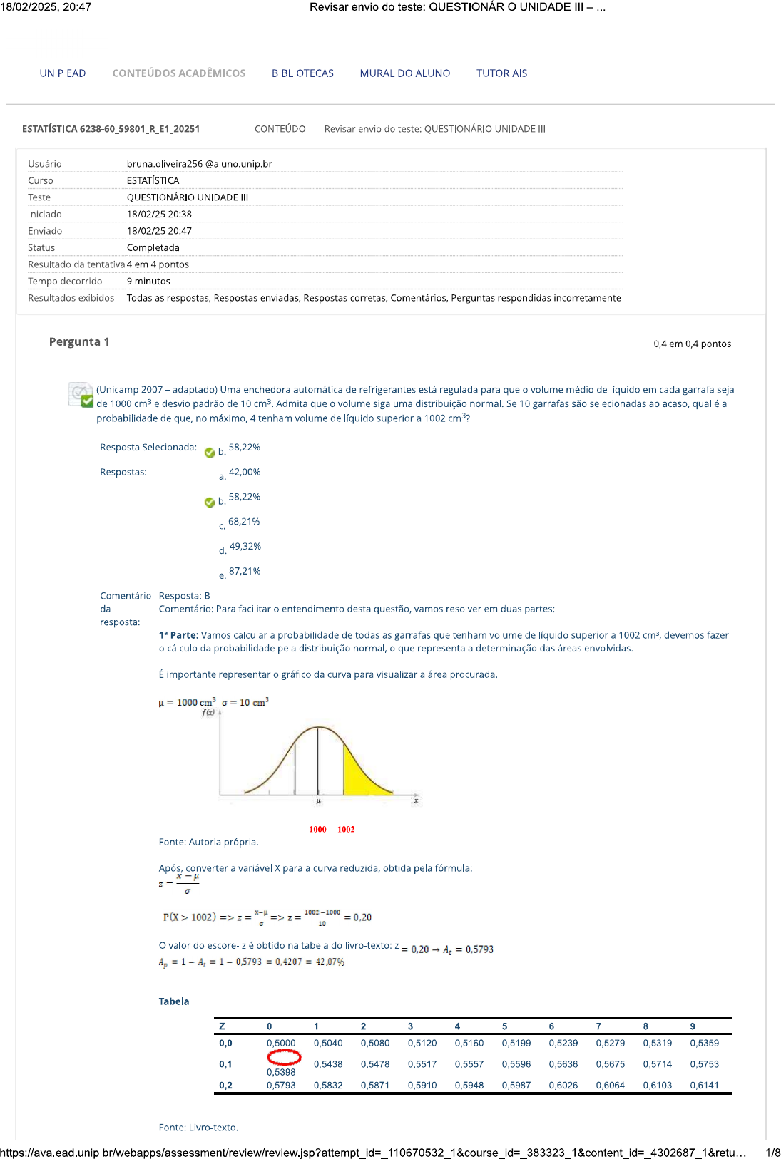 18/02/2025, 20:47 Revisar envio do teste: QUESTIONÁRIO UNIDADE III UNIP EAD CONTEÚDOS ACADÊMICOS BIBLIOTECAS MURAL DO ALUNO TUTORIAIS ESTATÍSTICA CONTEÚDO Revisar envio do teste: QUESTIONÁRIO UNIDADE III Usuário Curso ESTATÍSTICA Teste QUESTIONÁRIO UNIDADE III Iniciado 18/02/25 20:38 Enviado 18/02/25 20:47 Status Completada Resultado da tentativa 4 em 4 pontos Tempo decorrido 9 minutos Resultados exibidos Todas as respostas, Respostas enviadas, Respostas corretas, Comentários, Perguntas respondidas incorretamente Pergunta 1 0,4 em 0,4 pontos (Unicamp 2007 adaptado) Uma enchedora automática de refrigerantes está regulada para que o volume médio de líquido em cada garrafa seja de 1000 e desvio padrão de 10 Admita que o volume siga uma distribuição normal. Se 10 garrafas são selecionadas ao acaso, qual é a probabilidade de que, no máximo, 4 tenham volume de líquido superior a 1002 Resposta Selecionada: b. 58,22% Respostas: a. 42,00% b. 58,22% C. 68,21% d. 49,32% e. 87,21% Comentário Resposta: B da Comentário: Para facilitar o entendimento desta questão, vamos resolver em duas partes: resposta: Parte: Vamos calcular a probabilidade de todas as garrafas que tenham volume de líquido superior a 1002 devemos fazer o cálculo da probabilidade pela distribuição normal, o que representa a determinação das áreas envolvidas. É importante representar gráfico da curva para visualizar a área procurada. 1000 1002 Fonte: Autoria própria. Após, converter a variável X para a curva reduzida, obtida pela fórmula: 1002-1000 = valor do escore- 7 é obtido na tabela do livro-texto: 0.4207 = 42,07% Tabela Z 0 1 2 3 4 5 6 7 8 9 0,0 0,5000 0,5040 0,5080 0,5120 0,5160 0,5199 0,5239 0,5279 0,5319 0,5359 0,1 0.5438 0.5478 0,5517 0,5557 0,5596 0,5636 0,5675 0.5714 0,5753 0,5398 0,2 0,5793 0,5832 0,5871 0,5910 0,5948 0,5987 0,6026 0,6064 0,6103 0,6141 Fonte: Livro-texto. 1/820:47 Revisar envio do teste: QUESTIONÁRIO UNIDADE Parte: Se 10 garrafas são selecionadas ao acaso, qual é a probabilidade de que, no máximo, 4 tenham volume de líquido superior a 1002 vamos efetuar o cálculo usando diretamente a fórmula da distribuição binomial. Para usar a fórmula, determinar o valor de três parâmetros: garrafas Probabilidade de sucesso: p = 0,42 (calculada na parte da questão volume de líquido superior a 1002 (no máximo), então, temos que calcular a probabilidade de = 10! = Portanto, a probabilidade de que no máximo 4 garrafas tenham volume de líquido superior a 1002 é P + 0,0311 + 0,1017 + + 0,2488 = 0,5822 = 58,22% Pergunta 2 0,4 em 0,4 pontos Durante um ano particular, 70% das ações negociadas na bolsa de valores do Rio de Janeiro tiveram sua cotação aumentada, enquanto 30% tiveram sua cotação diminuída ou estável. No começo do ano, um serviço de assessoria financeira escolhe dez ações como sendo especialmente recomendadas. Se as dez ações representam uma seleção aleatória, qual a probabilidade de que todas as dez ações escolhidas tenham tido suas cotações aumentadas? Resposta Selecionada: 2,82% a. Respostas: 1,98% 2,30% 2,98% Comentário da Resposta: A resposta: Comentário: Para resolver esta questão, vamos efetuar o cálculo usando diretamente a fórmula da distribuição binomial. Para usar a fórmula, determinar o valor de três parâmetros: in 10 Probabilidade de sucesso: (probabilidade de uma ação ter alta) 10! P(X=10) = = 0.0282 ou18/02/2025, 20:47 Revisar envio do teste: QUESTIONÁRIO UNIDADE III - Pergunta 3 0,4 em 0,4 pontos trem do metrô para no meio de um túnel. o defeito pode ser na antena receptora ou no painel de controle. Se o defeito for na antena, o conserto poderá ser feito em 5 minutos. Se no defeito for no painel, o conserto poderá ser feito em 15 minutos. o encarregado da manutenção acredita que a probabilidade de o defeito ser no painel é de 40%. Qual é a expectativa do tempo de conserto? Tempo de conserto Local do defeito (min) xi Antena 5 Painel 15 Fonte: Livro: Estatística para os cursos de economia, administração e ciências Ermes Medeiros e outros autores - 2.ed. São Paulo: Atlas, Resposta Selecionada: 9 minutos. C. Respostas: 11 minutos. a. b. 6 minutos. 9 minutos. C. d. 5 minutos. 2 minutos. e. Comentário da Resposta: C resposta: Comentário: Para resolver esta questão, o ponto de partida é construir uma tabela distribuição de probabilidades a partir dos dados do enunciado e encontrar o valor esperado (esperança matemática). Probabilid Tempo de Probabilid Local do ade conserto ade defeito (em (min) (min) (em %) decimal) Antena 5 60 0,60 Painel 15 40 0,40 15.0,40 6 Valor esperado 9 Portanto, a expectativa do tempo de conserto é de 09 minutos. Pergunta 4 0,4 em 0,4 pontos Sabendo-se que a probabilidade de um estudante obter aprovação em certo teste de estatística é igual a 0,80 e considerando um grupo de 5 estudantes, determine a probabilidade de que no máximo dois sejam aprovados. Resposta Selecionada: b. 5,79% Respostas: 2,00% a. b. 5,79% C. 3,18% d. 5,45% 4,90% e. Comentário da Resposta: B resposta: Comentário: Para resolver esta questão, vamos efetuar o cálculo usando diretamente a fórmula da distribuição binomial. Para usar a fórmula, determinar o valor de três parâmetros: n; p; X. Probabilidade de sucesso: (probabilidade de uma aprovação) (no máximo), então, temos que calcular a probabilidade de18/02/2025 20:47 Revisar envio do teste: QUESTIONÁRIO UNIDADE III 5! 5! Portanto, a probabilidade de que no máximo dois sejam aprovados é de = 0,05792 = 5,79% Pergunta 5 0,4 em 0,4 pontos Supondo que o número de carros que chegam a uma fila do guichê de um pedágio seja uma taxa de 5 por minuto, calcule a probabilidade de que cheguem 6 carros nos próximos 2 minutos. Resposta Selecionada: b. 6,31% Respostas: 16,20% C. d. 7,05% 15,03% Comentário da Resposta: B resposta: Comentário: Para resolver esta questão, vamos efetuar o cálculo usando diretamente a fórmula da distribuiçã