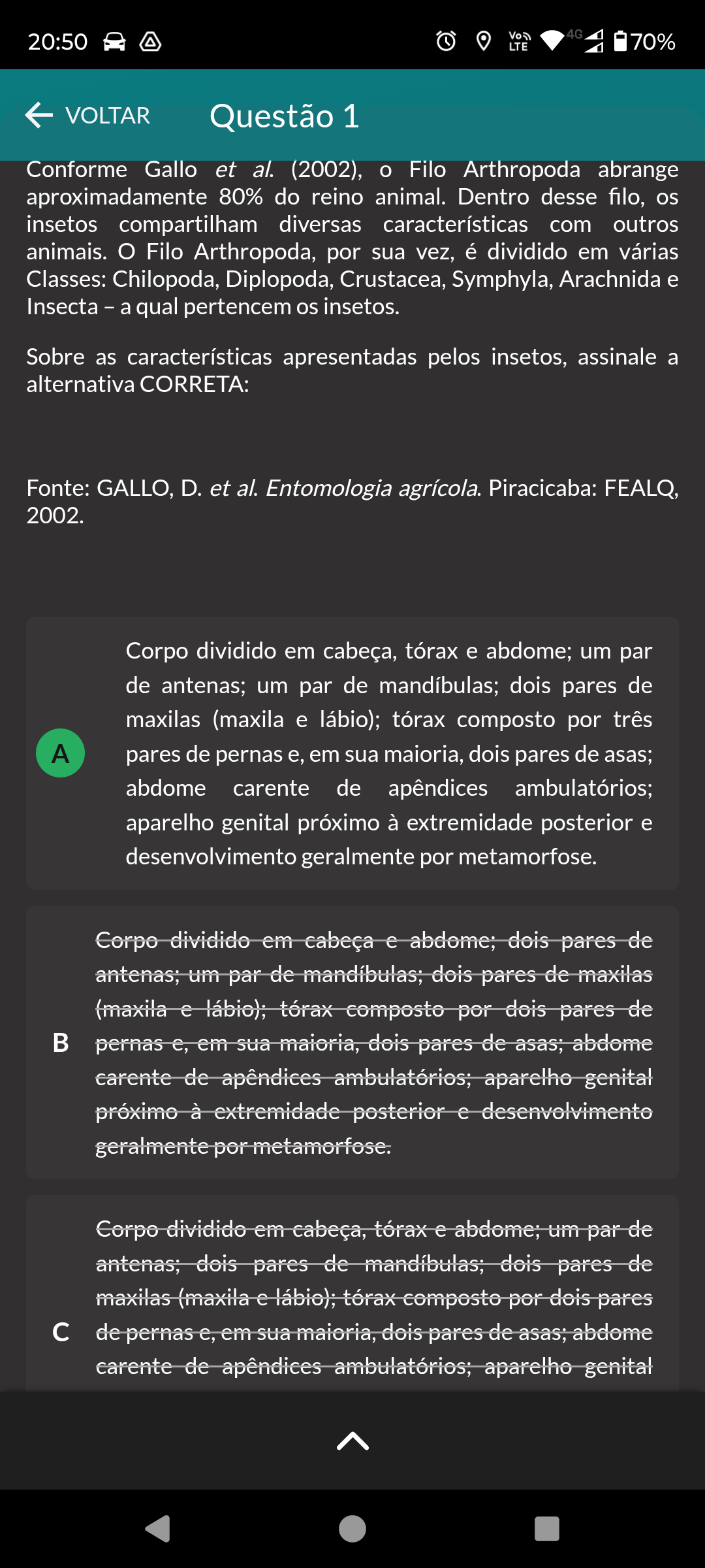 4G 20:50 LTE 70% VOLTAR Questão 1 Conforme Gallo et al. (2002), Filo Arthropoda abrange aproximadamente 80% do reino animal. Dentro desse filo, os insetos compartilham diversas características com outros animais. O Filo Arthropoda, por sua vez, é dividido em várias Classes: Chilopoda, Diplopoda, Crustacea, Symphyla, Arachnida e Insecta - a qual pertencem os insetos. Sobre as características apresentadas pelos insetos, assinale a alternativa CORRETA: Fonte: GALLO, D. et al. Entomologia agrícola. Piracicaba: FEALQ, 2002. Corpo dividido em cabeça, tórax e abdome; um par de antenas; um par de mandíbulas; dois pares de maxilas (maxila e lábio); tórax composto por três A pares de pernas e, em sua maioria, dois pares de asas; abdome carente de apêndices ambulatórios; aparelho genital próximo à extremidade posterior e desenvolvimento geralmente por metamorfose. Corpo-dividido em cabeça e abdome; dois pares de antenas; um par de dois pares de maxilas (maxila e lábio); tórax composto por dois pares de pernas e, em sua maioria, dois pares de asas; abdome carente de apêndices ambulatórios; aparelho-genita próximo à extremidade posterior e desenvolvimento geralmente por metamorfose. Corpo dividido em cabeça, e abdome; um par de antenas; dois pares de dois pares de maxilas (maxila e lábio); tórax composto por dois pares C de pernas e, em sua maioria, dois pares de asas; abdome carente de apêndices ambulatórios; genital