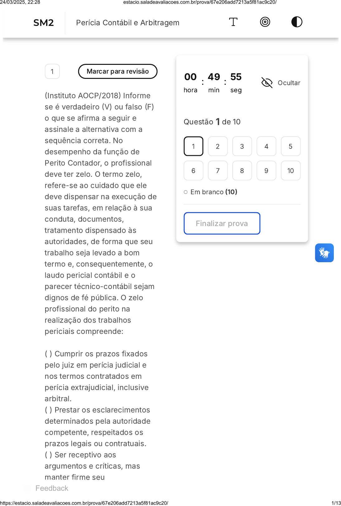1 Marcar para revisão (Instituto AOCP/2018) Informe se é verdadeiro (V) ou falso (F) o que se afirma a seguir e assinale a alternativa com a sequência correta. No desempenho da função de Perito Contador, o profissional deve ter zelo. O termo zelo, refere-se ao cuidado que ele deve dispensar na execução de suas tarefas, em relação à sua conduta, documentos, tratamento dispensado às autoridades, de forma que seu trabalho seja levado a bom termo e, consequentemente, o laudo pericial contábil e o parecer técnico-contábil sejam dignos de fé pública. O zelo profissional do perito na realização dos trabalhos periciais compreende: ( ) Cumprir os prazos fixados pelo juiz em perícia judicial e nos termos contratados em perícia extrajudicial, inclusive arbitral. ( ) Prestar os esclarecimentos determinados pela autoridade competente, respeitados os prazos legais ou contratuais. ( ) Ser receptivo aos argumentos e críticas, mas manter firme seu 00 hora : 49 min : 55 seg Ocultar Questão 1 de 10 Em branco (10) Finalizar prova 1 2 3 4 5 6 7 8 9 10 SM2 Perícia Contábil e Arbitragem Feedback 24/03/2025, 22:28 estacio.saladeavaliacoes.com.br/prova/67e206add7213a5f81ac9c20/ https://estacio.saladeavaliacoes.com.br/prova/67e206add7213a5f81ac9c20/ 1/13 A B C D E A B C posicionamento anterior, sem ratificar ou retificar. ( ) Ser prudente, no limite dos aspectos técnico-científicos, e atento às consequências advindas dos seus atos. V - F - F - V F - V - F - F V - V - F - V V - F - V - V F - V - V - V 2 Marcar para revisão O perito produz o laudo pericial. O laudo pericial representa: Exame do exercício social Vídeo respondendo perguntas formuladas Exposição de ideias 24/03/2025, 22:28 estacio.saladeavaliacoes.com.br/prova/67e206add7213a5f81ac9c20/ https://estacio.saladeavaliacoes.com.br/prova/67e206add7213a5f81ac9c20/ 2/13 D E Documento escrito Podcast 3 Marcar para revisão O parecer contábil e o laudo pericial contábil devem seguir as regulamentações. Sobre esse tema, analise as afirmações a seguir. I. O perito nomeado, depois de protocolado o laudo, pode fornecer cópia aos assistentes técnicos. II. O assistente técnico não pode validar o laudo pericial quando o documento tiver sido elaborado por leigo ou profissional de outra área, devendo, neste caso, oferecer o parecer pericial contábil sobre a matéria periciada. III. O laudo pericial contábil e o parecer pericial contábil podem ser elaborados somente por contador, não precisando, no entanto, ser registrado e habilitado em Conselho Regional de Contabilidade. Diante das afirmativas, assinale a opção correta. 24/03/2025, 22:28 estacio.saladeavaliacoes.com.br/prova/67e206add7213a5f81ac9c20/ https://estacio.saladeavaliacoes.com.br/prova/67e206add7213a5f81ac9c20/ 3/13 A B C D E I II III II e III I e II 4 Marcar para revisão (FUNDATEC/2019) As Normas Brasileiras de Contabilidade (NBC) definem os conceitos e normas acerca da Auditoria Contábil e da Perícia Contábil, restando claro do exame das referidas normas a distinção entre uma coisa e outra. Em relação a tais diferenças, analise as assertivas abaixo: I. A auditoria contábil é uma técnica contábil que consiste na verificação e fidedignidade dos dados contidos nas demonstrações contábeis por meio do exame minucioso dos registros da contabilidade e dos documentos que a eles deram origem. II. A perícia contábil constitui o conjunto de procedimentos técnico-científicos destinados 24/03/2025, 22:28 estacio.saladeavaliacoes.com.br/prova/67e206add7213a5f81ac9c20/ https://estacio.saladeavaliacoes.com.br/prova/67e206add7213a5f81ac9c20/ 4/13 A B C D E a levar à instância decisória elementos de prova necessários a subsidiar a justa solução do litígio ou constatação de fato. III. Enquanto a auditoria apresenta seu resultado expressando uma opinião por meio do relatório de auditoria, o perito apresenta o resultado da perícia com um laudo pericial contábil ou parecer técnico- contábil. Quais estão corretas? I II III I e II I, II e III 5 Marcar para revisão Os peritos devem seguir as regulamentações que regem a perícia contábil. Sobre isso, analise as afirmações a seguir. I. Os peritos devem consignar, no final do laudo pericial contábil ou do parecer pericial 24/03/2025, 22:28 estacio.saladeavaliacoes.com.br/prova/67e206add7213a5f81ac9c20/ https://estacio.saladeavaliacoes.com.br/prova/67e206add7213a5f81ac9c20/ 5/13 A B C D E contábil, de forma clara e precisa, as suas conclusões. II. O laudo e o parecer devem contemplar o resultado final alcançado por meio de elementos de prova inclusos nos autos ou arrecadados em diligências que o perito tenha efetuado, por intermédio de peças contábeis e quaisquer outros documentos, tipos e formas. III. Quando se tratar de laudo pericial contábil, assinado em conjunto pelos peritos, há responsabilidade individual do perito principal sobre o referido documento. Diante das afirmativas, assinale a opção correta. I II III II e III I e II 6 Marcar para revisão A NBC PP 01 é um documento essencial para a atividade do 24/03/2025, 22:28 estacio.saladeavaliacoes.com.br/prova/67e206add7213a5f81ac9c20/ https://estacio.saladeavaliacoes.com.br/prova/67e206add7213a5f81ac9c20/ 6/13 A B C perito contábil. Sobre essa norma, analise as afirmações a seguir. I. O perito é responsável pelo trabalho de sua equipe técnica. II. Tratando-se de perícia que abranja mais de uma área de conhecimento especializado, o perito deve comunicar ao juízo. III. Na elaboração do plano de trabalho e respectiva proposta de honorários, o perito deve considerar, entre outros fatores: a relevância, o vulto, o risco, a responsabilidade, a complexidade operacional, o pessoal técnico, o prazo estabelecido e a forma de recebimento. IV. O assistente técnico não é obrigado a celebrar contrato de prestação de serviços com o seu cliente, observando as normas estabelecidas pelo Conselho Federal de Contabilidade. D