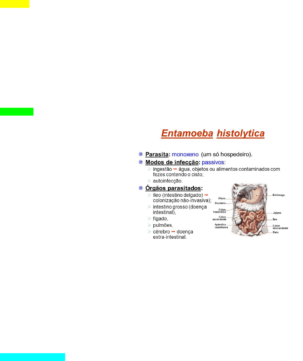 Circo RESUMO PARASITOLOGIA Assunto: Amebíase Introdução A E. histolytica é o agente etiológico da amebíase, importante problema de saúde pública que leva ao óbito anualmente cerca de 100.000 pessoas, constituindo a segunda causa de mortes por parasitoses. A E. díspar é responsável pela maioria dos casos de amebíase assintomática, porém a registros de casos de colite não-disentérica causado por esse parasita. Apenas 10% de todos os casos de infecções por E. histolytica (500 milhões mundialmente) apresentam sintomas. Os cistos permanecem viáveis durante cerca de 20 dias (ao abrigo da luz e em condições de umidade) Na região amazônica, a doença se manifesta de forma mais agressiva. o São frequentes as formas disentéricas e os abscessos hepáticos, que, por sua vez, são raros em outras regiões, principalmente Sudeste e Sul do país. A E. histolytica é endêmica em todas as áreas de sua distribuição, não causando epidemias; Classificação Todas as espécies do gênero Entamoeba vivem no intestino grosso de humanos ou de animais, à exceção da Entamoeba moshkoviskii, que é uma ameba de vida livre. As espécies de ameba pertencentes ao gênero Entamoeba foram reunidas em grupos diferentes, segundo o número de núcleos do cisto maduro ou pelo desconhecimento dessa forma. São eles: o Entamoeba com cistos contendo oito núcleos, também chamada grupo coli: E. coli (homem). o Entamoeba de cistos com quatro núcleos, também chamada grupo hystolytica: E. histolytica (homem), E. dispar (homem). o Entamoeba de cisto com um núcleo: E. polecki (porco, macaco e, eventualmente, humanos). o Entamoeba cujos cistos não são conhecidos ou não possuem cistos: E. gingivalis (humanos e macacos). E. histolytica é a única que em determinadas situações pode ser patogênica. Taxonomia: o Filo: Sarcomastigophora. o Ordem: Amoebida. o Família: Entamoebidae: o Generos: Entamoeba. Endolimax. Biologia e ciclo biológico Os trofozoíto da E. histolytica normalmente vivem na luz do intestino grosso podendo, ocasionalmente, penetrar na mucosa e produzir ulcerações intestinais ou em outras regiões do organismo, como fígado, pulmão e mais raramente, no cérebro. O parasita se alimenta principalmente de glicose e seus polímeros. Os trofozoítos de E. histolytica são anaeróbicos, porém, aguentam ambientes com até 5% de oxigênio. A locomoção se dá através de pseudópodes, e a ingestão de alimentos por fagocitose (partículas sólidas: hemácias, bactérias ou restos celulares) e por pinocitose (ingestão de partículas líquidas). Os não invasivos se alimentam de bactérias. Circo RESUMO PARASITOLOGIA Assunto: Amebíase Os invasivos alimentam-se de células e debris celulares (podem ser visualizadas hemácias no seu citoplasma). o Ao chegar nas mucosas ele começa a liberar muco que é encontrado nas fezes e ao penetrar na camada vascular irá liberar sangue que é encontrado nas fezes. o Abscesso amebiano (parasita quando chega ao fígado) Dor, cólica, ictérico. o Nos rins chega a dar insuficiência renal. o Pode formar abscessos amebianos no cérebro. o Pode formar catarro nos pulmões. Ciclo biológico o Se inicia pela ingestão dos cistos maduros junto de alimentos e agua contaminados. o Passam pelo estômago, resistindo à ação do suco gástrico, chegam ao final do intestino delgado ou início do intestino grosso, onde ocorre o desencistamento, com a saída do metacisto, através de uma pequena fenda na parede cística. o O metacisto, através de sucessivas divisões torna-se o trofozoito que adere a parede do intestino grosso e se alimenta dos dendritos que ali chegam. o Em algumas situações os trofozoitos podem passar a forma de cisto novamente e ser eliminado nas fezes. Ciclo patogênico o O equilíbrio parasito-hospedeiro pode ser rompido e os trofozoítos invadem a submucosa intestinal, multiplicando-se ativamente no interior das úlceras e podem, através da circulação porta, atingir outros órgãos, como o fígado e, posteriormente, pulmão, rim, cérebro ou pele, causando amebíase extra-intestinal. o Esse é o trofozoito de forma invasiva ou virulenta. o Não formam cistos, são hematófagos e muito ativos. o Principal fator de virulência do parasita: Lectina Gal/GalNac. o Uma vez invadida a mucosa, os trofozoítos se multiplicam e prosseguem penetrando nos tecidos sob a forma de microulcerações em direção à muscular da mucosa, com escassa reação inflamatória. o Na submucosa gera uma ulceração conhecida como “botão de camisa” o Ocasionalmente, os trofozoitos podem induzir uma resposta inflamatória proliferativa com formação de uma massa granulomatosa, chamada "ameboma". o Podem penetrar nos vasos sanguíneos e através da circulação atingir outros órgãos, sendo o primeiro deles o fígado. Circo RESUMO PARASITOLOGIA Assunto: Amebíase Resposta imune o A resistência à infecção em crianças está associada a IgA intestinal contra lectina. o A imunização de camundongos com a lectina purificada ou recombinante é capaz de prevenir a infecção intestinal. Transmissão Através da ingestão de cistos maduros em alimentos sólidos ou líquidos. O uso de agua contaminada por dejetos humanos é uma forma frequente de contaminação. Além disso, falta de higiene domiciliar pode facilitar a disseminação de cistos dentro da família. Assim como a maioria das protozooses, portadores assintomáticos são os principais disseminadores. Manifestação Clínica A manifestação pode vir de várias formas: o Assintomáticas, forma não invasiva (80-90%) dos casos. o Sintomáticas Colite amebiana. Disenteria amebiana ou diarreia sanguinolenta Apendicite amebiana. Amebíase intestinal invasiva. Ameboma do cólon. o Amebíase extra-intestinal. É raro em nosso meio, mas já têm sido relatados vários casos de abscessos hepáticos amebianos na Região Amazônica. Forma de abscesso amebiano no fígado é a forma mais predominante. As