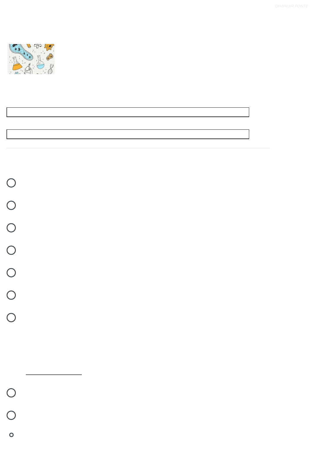 Ciências Biológicas % % Andamento Geral Andamento do Tópico MEU DESEMPENHO MENU PÁGINA INICIAL / MEUS CURSOS / CIÊNCIAS BIOLÓGICAS / ATIVIDADE AVALIATIVA Orientações Genética Imunologia, Mutação e Neoplasia Biotecnologia Qualidade de Vida Ecologia e Meio Ambiente Átomo, Termodinâmica e Soluções Questões de Fixação Atividade Avaliativa Átomo, Termodinâmica e Soluções Vida, Evolução e Bioquímica Anatomia e Fisiologia Humanas Minhas Mensagens Avaliação de aula Minhas Notas Contatos do curso Prova digital [ 1 ] IR PARA O CONTEÚDO [ 2 ] IR PARA O MENU SOBRE A ACESSIBILIDADE ALTO-CONTRASTE AUMENTAR FONTE DIMINUIR FONTE 09/04/2025, 16:39 Questões de Avaliação https://www.avaeduc.com.br/mod/quiz/review.php?attempt=3341034 1/10 https://www.avaeduc.com.br/ https://www.avaeduc.com.br/ https://www.avaeduc.com.br/course/view.php?id=7136 https://www.avaeduc.com.br/course/view.php?id=7136&topic=114955 https://www.avaeduc.com.br/course/view.php?id=7136&topic=114971 https://www.avaeduc.com.br/course/view.php?id=7136&topic=114972 https://www.avaeduc.com.br/course/view.php?id=7136&topic=114973 https://www.avaeduc.com.br/local/mail/view.php?t=inbox javascript:void(0); javascript:void(0); javascript:void(0); javascript:void(0); https://www.avaeduc.com.br/mod/page/view.php?id=1 https://www.avaeduc.com.br/mod/page/view.php?id=1 / QUESTÕES DE AVALIAÇÃO a. O título em massa é o resultado decimal da divisão da massa do soluto pela massa da solução, enquanto sua porcentagem é este valor multiplicado por cem. b. O título em massa é o resultado da divisão da massa do soluto pelo volume da solução e sua porcentagem é este valor multiplicado por cem. c. Não há diferença entre título e porcentagem. d. O título em massa do soluto é sua quantidade de massa e a porcentagem é dada pela divisão de sua massa pela massa da solução. e. O título em massa é o resultado da divisão da massa do solvente pela massa do soluto, sua porcentagem é dada por este valor multiplicado por cem. Iniciado em quarta, 9 abr 2025, 16:35 Estado Finalizada Concluída em quarta, 9 abr 2025, 16:39 Tempo empregado 3 minutos 22 segundos Avaliar 10,00 de um máximo de 10,00(100%) Questão 1 Correto Atingiu 1,00 de 1,00 É muito comum falarmos em termos quantitativos sobre a concentração de uma solução. Isso nos ajuda a ter uma noção comparativa em determinadas situações, como, por exemplo, se um remédio tem uma elevada concentração de determinado composto, sua ação é mais intensa, ou um suco cuja concentração de açúcar é maior terá um sabor mais adocicado. Dentre outras representações, é bem comum falarmos sobre a concentração da massa de soluto de uma solução em termos de sua porcentagem e de seu título em massa. Qual a diferença deles? Escolha uma: Questões de Avaliação [ 1 ] IR PARA O CONTEÚDO [ 2 ] IR PARA O MENU SOBRE A ACESSIBILIDADE ALTO-CONTRASTE AUMENTAR FONTE DIMINUIR FONTE 09/04/2025, 16:39 Questões de Avaliação https://www.avaeduc.com.br/mod/quiz/review.php?attempt=3341034 2/10 https://www.avaeduc.com.br/mod/quiz/view.php?id=499369 https://www.avaeduc.com.br/mod/page/view.php?id=1 https://www.avaeduc.com.br/mod/page/view.php?id=1 a. Os átomos de um mesmo elemento são sempre idênticos. b. Em uma transformação química, não se cria, não se destrói e não se converte átomos em outros átomos. c. Os átomos são compostos por prótons, nêutrons e elétrons. d. Os elétrons de um átomo possuem a mesma massa independente do nível de energia que ocupa. e. Toda a matéria é formada por átomos. Questão 2 Correto Atingiu 1,00 de 1,00 O britânico John Dalton propôs em 1808 um modelo atômico capaz de explicar a Lei da Conservação das Massas, enunciada por Lavoisier em 1774. Essa lei nos diz que a soma das massas dos reagentes é igual à soma das massas dos produtos. Qual das ideias de Dalton fornece uma explicação mais adequada para a lei enunciada por Lavoisier? Escolha uma: [ 1 ] IR PARA O CONTEÚDO [ 2 ] IR PARA O MENU SOBRE A ACESSIBILIDADE ALTO-CONTRASTE AUMENTAR FONTE DIMINUIR FONTE 09/04/2025, 16:39 Questões de Avaliação https://www.avaeduc.com.br/mod/quiz/review.php?attempt=3341034 3/10 https://www.avaeduc.com.br/mod/page/view.php?id=1 https://www.avaeduc.com.br/mod/page/view.php?id=1 a. A água recebeu uma quantidade de soluto menor do que ela é capaz de dissolver na temperatura em que ela se encontra. b. A água recebeu a quantidade exata de soluto que ela é capaz de dissolver na temperatura em que ela se encontra. c. A água recebeu uma quantidade de soluto maior do que ela é capaz de dissolver em condições normais e não há formação de corpo de fundo, sem que ocorra alguma perturbação do sistema. d. A água se encontra numa temperatura elevada e dissolve todo o soluto que recebe. e. A água recebeu uma quantidade de soluto maior do que ela é capaz de dissolver na temperatura em que ela se encontra e há formação de corpo de fundo. Questão 3 Correto Atingiu 1,00 de 1,00 A água, também chamada de solvente universal, pode ser utilizada para dissolver uma grande variedade de solutos e formar o que chamamos de solução aquosa. A ideia de que a água é um solvente universal vem do fato de que ela é capaz de dissolver solutos sólidos, líquidos e gasosos. Uma solução líquida, como a aquosa, pode se encontrar em três situações: saturada, insaturada e supersaturada. Em relação a uma solução aquosa supersaturada, pode-se dizer que: Escolha uma: [ 1 ] IR PARA O CONTEÚDO [ 2 ] IR PARA O MENU SOBRE A ACESSIBILIDADE ALTO-CONTRASTE AUMENTAR FONTE DIMINUIR FONTE 09/04/2025, 16:39 Questões de Avaliação https://www.avaeduc.com.br/mod/quiz/review.php?attempt=3341034 4/10 https://www.avaeduc.com.br/mod/page/view.php?id=1 https://www.avaeduc.com.br/mod/page/view.php?id=1 a. Não, pois a quantidade de calor fornecida pelo aquecedor é capaz de elevar a temperatura da água em apenas 60ºC. b. Não, pois a quant