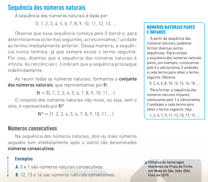 Sequência dos números naturais A sequência dos números naturais é dada por: 0, 1, 2, 3, 4. 5, 6. 7. 10, 11, 12, 13, NÚMEROS NATURAIS PARES Observe que essa sequência começa pelo 0 (zero) e, para E IMPARES determinarmos os termos seguintes, acrescentamos 1 unidade A partir da sequência dos naturais, podemos ao termo imediatamente anterior. Dessa maneira, a formar diversas outras cia nunca termina, já que sempre existe 0 termo seguinte. sequências. Para compor Por isso, dizemos que a sequência dos números naturais é a sequência dos números naturais infinita. As reticências (...) indicam que a sequência prossegue pares, por exemplo, começamos pelo 0 e adicionamos 2 unidades indefinidamente. a cada termo para obter termo Ao reunir todos os números naturais, formamos conjunto seguinte. dos números naturais, que representamos por N. 0, 2, 6, 8, 10, 12, 14, 16, 18, Para formar a sequência dos N = {0, 1, 2, 3, 4, 5, 6, 7, 8, 10, ...} numeros naturais impares, 0 conjunto dos números naturais não nulos, ou seja, sem 0 começamos pelo 1 e adicionamos zero, é representado por N* 2 unidades a cada termo para obter 0 termo seguinte. Veja. N* = 2, 3, 5, 6, 7, 8, 9, 11, 3. 5. 9. 11. 15, 17, 19. Números consecutivos Na sequência dos números naturais, dois ou mais seguidos (um imediatamente após outro) são denominados números consecutivos. Exemplos Filhotes de tartarugas A. 0 e 1 são naturais consecutivos. marinhas na Praia do Forte, em Mata de São João (BA). B. 12, 13 e 14 são números naturais Foto de 2019.