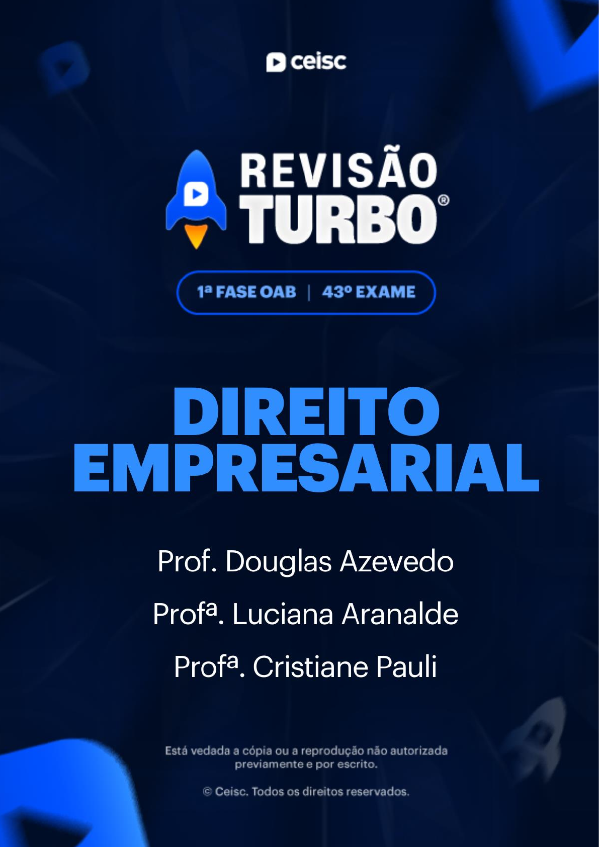 Revisão Turbo | 43º Exame de Ordem Direito Empresarial 1 Revisão Turbo | 43º Exame de Ordem Direito Empresarial 2 Revisão Turbo | 43º Exame de Ordem Direito Empresarial 3 Direito Empresarial Revisão Turbo | 43° Exame da OAB Sumário Aula 23/04/2025 – turno manhã ................................................................................................... 4 Aula 23/04/2025 – turno noite ...................................................................................................... 7 Revisão Turbo | 43º Exame de Ordem Direito Empresarial 4 Aula 23/04/2025 – turno manhã Prof. Douglas Azevedo 1) FGV – 2019 – OAB – 29° Exame de Ordem Unificado – Primeira Fase Luzia Betim pretende iniciar uma sociedade empresária em nome próprio. Para tanto, procura assessoria jurídica quanto à necessidade de inscrição no Registro Empresarial para regularidade de exercício da empresa. Na condição de consultor(a), você responderá que a inscrição do empresário individual é A) dispensada até o primeiro ano de início da atividade, sendo obrigatória a partir de então. B) obrigatória antes do início da atividade. C) dispensada, caso haja opção pelo enquadramento como microempreendedor individual. D) obrigatória, se não houver enquadramento como microempresa ou empresa de pequeno porte. 2) FGV – 2024 – OAB – 40° Exame de Ordem Unificado – Primeira Fase A partir de 2022, a possibilidade de o local de exercício da atividade empresarial ser virtual passou a ser reconhecido no Código Civil. A respeito desse tema, assinale a afirmativa correta. A) Se o empresário ou a sociedade empresária exercer a empresa em local virtual, tal local é denominado pelo Código Civil de “estabelecimento virtual”, com o mesmo significado jurídico de estabelecimento. B) Ao contrário do local físico de exercício da empresa, se ele for virtual, a fixação do horário de funcionamento competirá ao Município, observada a regra geral de qualquer horário ou dia da semana, inclusive feriados. C) Quando o local em que se exerce a atividade empresarial for virtual, o endereço informado para fins de registro poderá ser, conforme o caso, o endereço do empresário individual ou o de um dos sócios da sociedade empresária. D) A escolha do local virtual de exercício da empresa impõe ao empresário ou ao administrador da sociedade empresária o dever de comunicar sua alteração à Junta Comercial nos 15 (quinze) dias seguintes. 3) FGV – 2024 – OAB – 40° Exame de Ordem Unificado – Primeira Fase Os cientistas Pio Alves e Cardoso Moreira desenvolveram dois produtos que reúnem os requisitos de patenteabilidade e reivindicaram a autoria perante o Instituto Nacional da Propriedade Industrial (INPI). O primeiro recebeu registro de patente na categoria de invenção e, o segundo, a patente na categoria de modelo de utilidade. Assinale a opção que indica o privilégio de exploração que as patentes assegurarão aos autores. A) Temporário, para ambos. B) Vitalício, para ambos. C) Perpétuo, até a terceira geração de descendentes dos autores. D) Temporário, para Pio Alves, autor da invenção, e vitalício para Cardoso Moreira, autor do modelo de utilidade. Prof.ª Cristiane Pauli 4) FGV – 2024 – OAB – 42° Exame de Ordem Unificado – Primeira Fase A sociedade empresária Drogaria Ponto dos Volantes Ltda. requereu recuperação judicial e teve deferido o processamento, sendo que ambos os eventos ocorreram no ano de 2021. Nos exercícios sociais de 2021, 2022 e 2023, a sociedade não distribuiu lucros aos sócios, embora eles tivessem sido auferidos em 2022 e 2023. O sócio minoritário Lucas Sobrado consulta você, como advogado(a), para saber sobre a legalidade da ausência de distribuição de lucros nos referidos exercícios sociais, informando que o plano de recuperação judicial foi aprovado em dezembro de 2022 e a concessão ocorreu em janeiro de 2023, mas o processo ainda não foi encerrado. Assinale a opção que apresenta, corretamente, seu parecer. Revisão Turbo | 43º Exame de Ordem Direito Empresarial 5 A) É vedada a distribuição de lucros pela sociedade aos sócios enquanto não for encerrada a recuperação judicial, de modo que não há ilegalidade por parte dela. B) A sociedade não poderia ter deixado de distribuir lucros nos exercícios sociais de 2022 e 2023, pois os lucros devem ser pagos aos sócios por ser direito essencial deles. C) É vedada a distribuição de lucros pela sociedade aos sócios enquanto não for realizado o pagamento aos credores sujeitos à recuperação judicial, de modo que não há ilegalidade por parte dela. D) A sociedade empresarial, até a aprovação do plano de recuperação judicial, estava impedida de distribuir lucros aos sócios, mas não há justificativa para o não pagamento no exercício de 2023. 5) FGV – 2024 – OAB – 40° Exame de Ordem Unificado – Primeira Fase O juiz da falência da sociedade empresária Refrigeração Abaíra Ltda. determinou que o administrador judicial ficasse responsável pela guarda dos bens arrecadados. O administrador judicial, entretanto, apresentou justificativas que o impossibilitavam de assumir tal encargo. Foi proposto ao juiz que os bens situados fora do estabelecimento da falida ficassem sob a guarda do Sr. Belmonte, conhecido empresário na Comarca, e sob a responsabilidade do administrador judicial. Para os bens situados dentro do estabelecimento, inclusive o próprio imóvel, propôs o administrador judicial que a Sra. América Dourada, ex- administradora da sociedade e representante da falida no processo, fosse nomeada depositária dos bens. Sobre a proposta do administrador judicial, assinale a afirmativa correta. A) É ilícita, porque é uma atribuição legal e personalíssima do administrador judicial ter os bens arrecadados do falido sob sua guarda. B) Deve ser acatada, pois é permitido que os bens arrecadados fiquem sob a guarda d