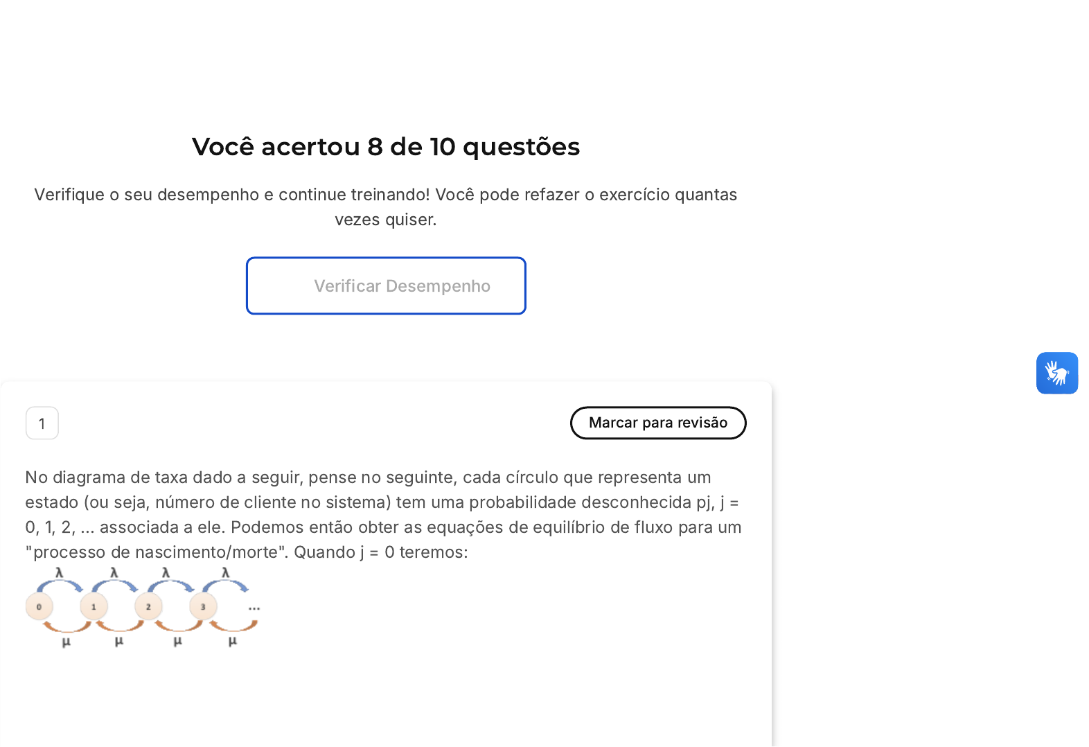Você acertou 8 de 10 questões Verifique o seu desempenho e continue treinando! Você pode refazer o exercício quantas vezes quiser. Verificar Desempenho 1 Marcar para revisão No diagrama de taxa dado a seguir, pense no seguinte, cada círculo que representa um estado (ou seja, número de cliente no sistema) tem uma probabilidade desconhecida pj, j = 0, 1, 2, ... associada a ele. Podemos então obter as equações de equilíbrio de fluxo para um "processo de nascimento/morte". Quando j = 0 teremos: A B C D E π λ = π λ .0 0 1 1 π λ = π λ .0 0 2 1 μ λ = μ λ .0 0 1 1 ρ λ = π λ .0 0 1 1 ρ λ = ρ λ .0 0 1 1 Resposta correta Parabéns, você selecionou a alternativa correta. Confira o gabarito comentado! Gabarito Comentado A B C D E 2 Marcar para revisão Os clientes chegam a um restaurante de fast food com um garçom de acordo com um processo de Poisson a uma taxa média de 30 por hora. O servidor acabou de se demitir e os dois candidatos para a substituição são X (rápido, mas caro) e Y (lento, mas barato). Ambos os candidatos teriam uma distribuição exponencial para tempos de serviço com X tendo uma média de 1,2 minutos e Y tendo uma média de 1,5 minutos. A receita mensal do restaurante é dada por $ 6.000/W, onde W é o tempo de espera esperado (em minutos) de um cliente no sistema. Determine o limite superior da diferença em suas remunerações mensais que justificaria a contratação de X em vez de Y. $ 2.000 $ 1.500 $ 1.000 $ 1.800 $ 2.100 Resposta correta Parabéns, você selecionou a alternativa correta. Confira o gabarito comentado! Gabarito Comentado 3 Marcar para revisão Observe o diagrama a seguir de um sistema M/M/2. Qual a probabilidade de o sistema estar vazio. Questão 3 de 10 Corretas (8) Incorretas (2) Em branco (0) 1 2 3 4 5 6 7 8 9 10 Lista de exercícios Modelos De Filas Sair A B C D E Fonte: YDUQS, 2023. 32,9% 38,4% 42,9% 47,6% 49,1% Resposta incorreta Opa! A alternativa correta é a letra C. Confira o gabarito comentado! Gabarito Comentado A B C 4 Marcar para revisão Uma seção da Administração local possui dois escritórios A e B. Os usuários vão ao escritório A, onde há um funcionário, seguindo um padrão de chegada regido por uma lei de Poisson de 12 pessoas/hora e o tempo de atendimento segue uma lei exponencial de média 4 minutos. Os usuários então se dirigem ao escritório B, onde o tempo de atendimento também segue uma exponencial de média 7,5 minutos para cada atendente. Quantos funcionários serão necessários no escritório B se você quiser que a probabilidade de esperar mais de 10 minutos seja menor que 0,05? 0 1 2 D E 3 4 Resposta incorreta Opa! A alternativa correta é a letra D. Confira o gabarito comentado! Gabarito Comentado Dados os sistemas A e B ligados em série, se o primeiro sistema A recebe usuários de acordo com uma Poisson com taxa de chegada λA e esse sistema é estável, então o sistema B recebendo usuários do sistema A os recebe de acordo com um processo Poissoniano de taxa de chegada λA. A figura a seguir representa os dois sistemas vinculados com suas taxas de entrada e saída, assumindo que ambos os sistemas, A e B, são estáveis. 5 Marcar para revisão Os atendentes gerenciam os berços de ferramentas enquanto os mecânicos, presumivelmente provenientes de uma população de chamadas infinitas, chegam para o serviço. Assuma chegadas de Poisson a uma taxa de 2 mecânicos por minuto e tempos de A B C atendimento exponencialmente distribuídos com média de 40 segundos. O que aconteceria se houvesse apenas s = 1 servidor? O processo teria uma taxa de ocupação de 4/3. O processo entraria em colapso. O processo teria uma taxa de ocupação de 2/3. D E O processo teria uma taxa de ocupação de 2/6. O processo teria uma taxa de ocupação de 3/4. Resposta correta Parabéns, você selecionou a alternativa correta. Confira o gabarito comentado! Gabarito Comentado λ = 2 por minuto e μ = 60/40 = 3/2 por minuto. Como a carga ofertada é maior que 1, ou seja, como λ / μ = 2 / (3/2) = 4/3 > 1, é necessário mais de um servidor para que o sistema tenha um equilíbrio estatístico. O requisito para o estado estacionário é que s > λ / μ = 4/3. Assim, são necessários pelo menos s = 2 atendentes. A quantidade 4/3 é o número esperado de servidores ocupados e, para ρ = 4 / (3s) é a proporção de tempo de longo prazo em que cada servidor está ocupado. Portanto com somente um servidor o processo entraria em colapso pois teria um λ > μ. 6 Marcar para revisão Uma companhia de petróleo está considerando a expansão de sua única instalação de descarga em sua refinaria. Devido a variações aleatórias no clima, atrasos no A B C D E carregamento e outros fatores, os navios que chegam à refinaria para descarregar petróleo bruto chegam a uma taxa de 5 navios por semana. A taxa de serviço é de 10 navios por semana. Assuma que as chegadas seguem um processo de Poisson e o tempo de atendimento é exponencial. Se um segundo berço for alugado, qual será o número médio de navios esperando antes de serem descarregados? 1/30 1/15 1/10 1/25 1/20 Resposta correta Parabéns, você selecionou a alternativa correta. Confira o gabarito comentado! Gabarito Comentado A B C 7 Marcar para revisão Um pequeno Call Center em Luanda (Angola) possui 4 linhas telefônicas com taxa de chegada de uma ligação a cada quatro minutos. A duração média de uma chamada é de oito minutos. Qual é a probabilidade de um cliente ser impedido de entrar no sistema. 7,3% 6,8% 5,4% D E 8,2% 9,5% Resposta correta Parabéns, você selecionou a alternativa correta. Confira o gabarito comentado! Gabarito Comentado 8 Marcar para revisão A. Kendall Erlang ficou eternizado ao desenvolver um padrão para classificar nós de uma fila. Utilizando a notação de Kendall, analise as afirmativas a seguir com relação às suposições de um modelo M/M/1: I. As chegadas são independentes das chegadas anteriores, mas a taxa d