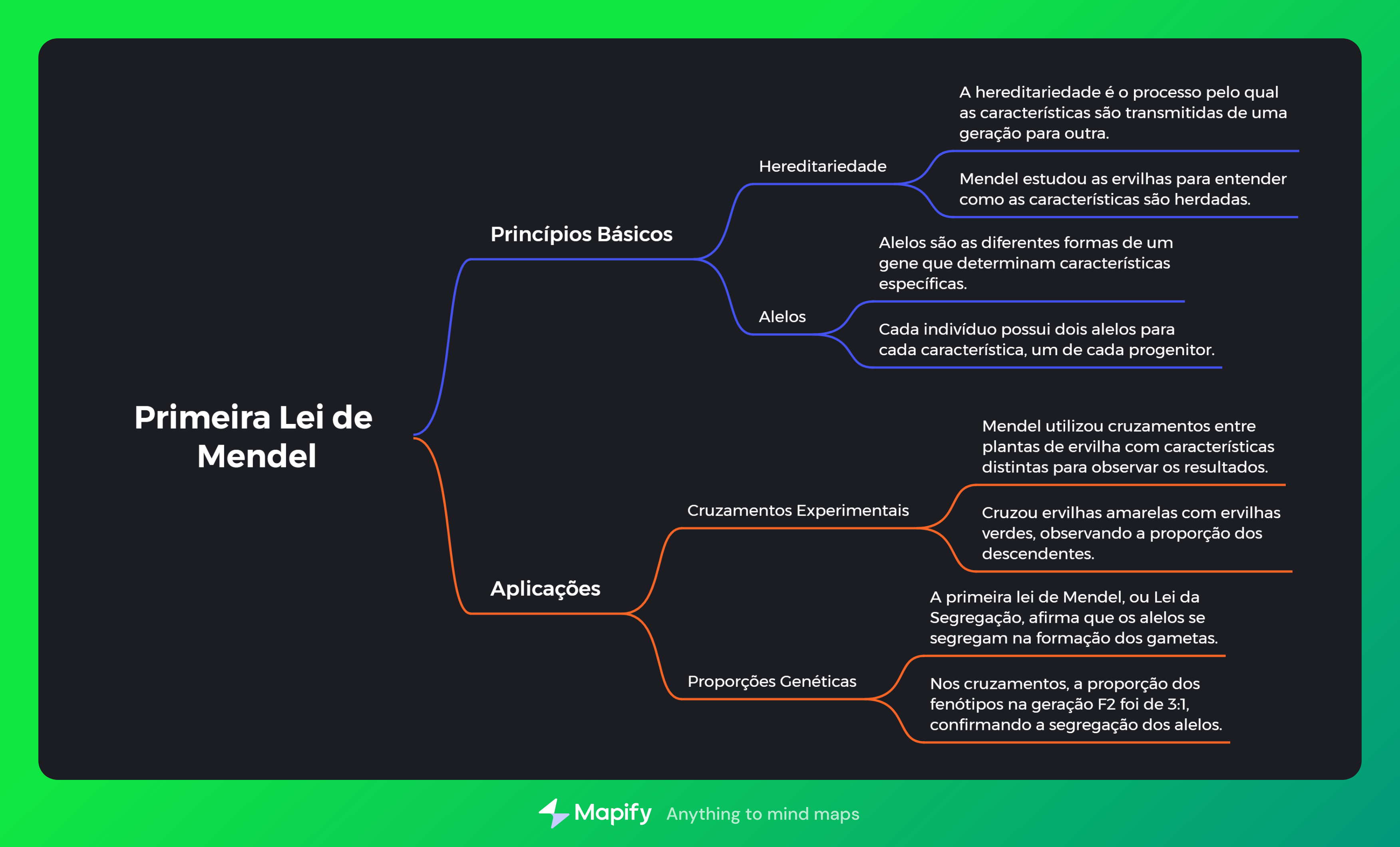 A hereditariedade é O processo pelo qual as características são transmitidas de uma geração para outra. Hereditariedade Mendel estudou as ervilhas para entender como as características são herdadas. Princípios Básicos Alelos são as diferentes formas de um gene que determinam características específicas. Alelos Cada indivíduo possui dois alelos para cada característica, um de cada progenitor. Primeira Lei de Mendel utilizou cruzamentos entre Mendel plantas de ervilha com características distintas para observar os resultados. Cruzamentos Experimentais Cruzou ervilhas amarelas com ervilhas verdes, observando a proporção dos descendentes. Aplicações A primeira lei de Mendel, ou Lei da Segregação, afirma que os alelos se segregam na formação dos gametas. Proporções Genéticas Nos cruzamentos, a proporção dos fenótipos na geração F2 foi de 3:1, confirmando a segregação dos alelos.