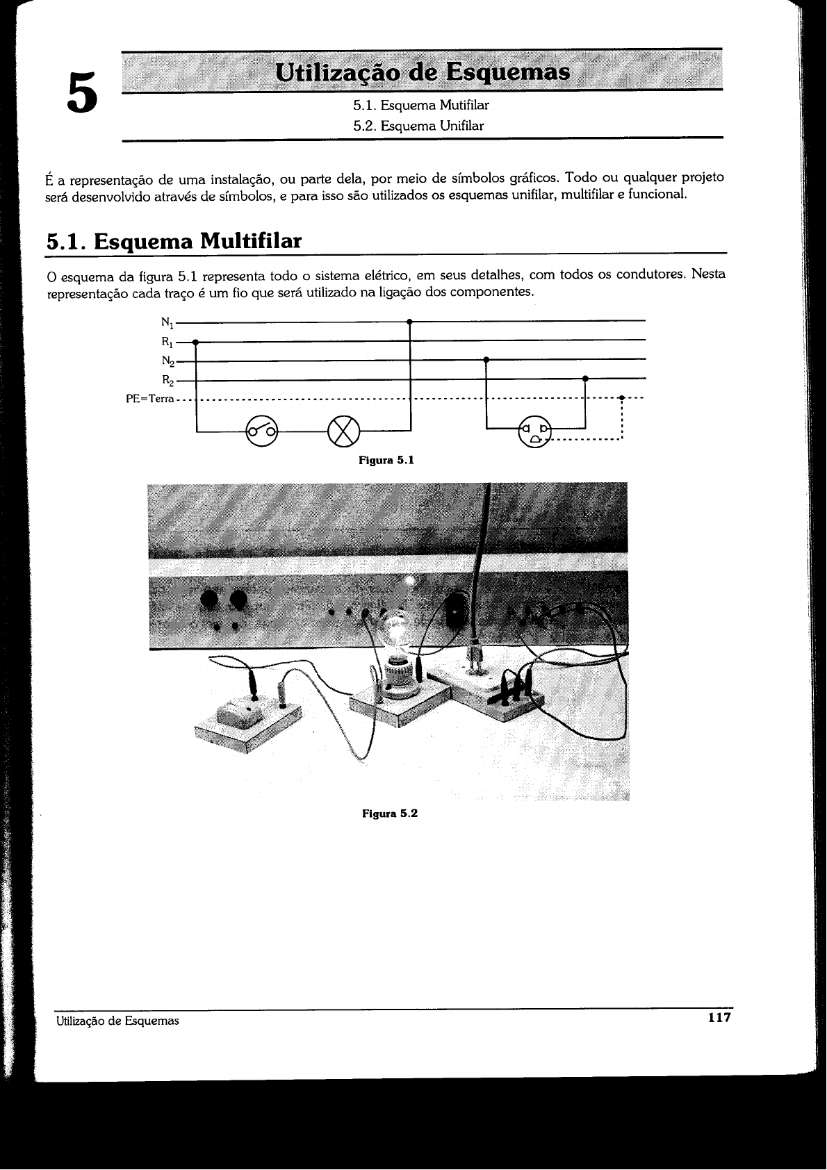 5 Utilização de Esquemas 5.1. Esquema Mutifilar 5.2. Esquema Unifilar É a representação de uma instalação, ou parte dela, por meio de símbolos gráficos. Todo ou qualquer projeto será desenvolvido através de símbolos, e para isso são utilizados os esquemas unifilar, multifilar e funcional. 5.1. Esquema Multifilar O esquema da figura 5.1 representa todo o sistema elétrico, em seus detalhes, com todos os condutores. Nesta representação cada traço é um fio que será utilizado na ligação dos componentes. N2 R2 PE=Terra Figura 5.1 Figura 5.2 Utilização de Esquemas 117O esquema das figuras 5.2 e 5.3 representa exatamente como a instalação da figura 5.1 é executada na prática Eletrodutos PE Caixas de QD passagem Quadro de distribuição Figura 5.3 Sempre que for representado um símbolo, ele deve estar instalado em uma caixa de passagem, seja no teto ou na parede, e os condutores devem passar por dentro dos eletrodutos, os quais partem de um Quadro de Distribuição (QD). Em um projeto, se a sua representação fosse feita na forma multifilar, cada condutor seria representado por um traço, saindo do QD e chegando ao seu destino. Como observamos na figura seria representar um projeto na forma multifilar, pois seriam tantos os traços que dificultariam a sua interpretação. Neste caso, para realizar um projeto com clareza e de maneira simplificada, utilizamos a forma unifilar. 5.2. Esquema Unifilar Ele representa um sistema elétrico simplificado, que identifica número de condutores e representa seus trajetos por um único traço. Geralmente, representa a posição física dos componentes da instalação, porém não reproduz com clareza o funcionamento e funcional dos circuitos. Na figura 5.4, temos um esquema de um circuito elétrico composto de interruptor simples, tomada, lâmpadas incandescentes, rede de eletrodutos e fiação, todos representados na forma unifilar. 1 2 a 2 -2- Vem do QD 100 W -1- a Figura 5.4 Apresenta todo sistema elétrico e permite interpretar, com clareza e rapidez, funcionamento ou funcional dos circuitos. Não se preocupe com a posição física dos componentes da instalação, pois os caminhos das correntes são representados por meio de retas, sem cruzamento ou inclinação na vertical ou horizontal. O esquema mostra equipamento exatamente como ele é encontrado à venda no mercado, ou como ele é industrialmente fabricado. 118 Instalações Elétricas PrediaisN1 R1 Figura 5.5 Recomendação Geral Basicamente, um esquema é representado com seus componentes de comando na posição desligada. O esquema de distribuição é unifilar, que permite interpretar com extrema rapidez a distribuição dos circuitos e dispositivos, ou seja, funcionamento. Para a execução de uma instalação, dois aspectos são fundamentais para eletricista: 1. O primeiro é a localização dos elementos na planta, quantos fios passarão em determinado eletroduto e qual trajeto da instalação. 2. O segundo é funcionamento: distribuição dos circuitos e dos dispositivos. Como não é possível representar ao mesmo tempo esses dois aspectos num único esquema, sem prejudicar a clareza de interpretação de um deles (posição física ou funcionamento), a instalação é representada por dois esquemas: esquema unifilar de fiação e de distribuição. Esta é a finalidade de utilização de tipos diferentes de esquemas. Utilização de Esquemas 1196 Dispositivos de Comando de Iluminação e Sinalização 6.1. Como Instalar Lâmpadas Incandescentes com Interruptor Simples, Interruptor Simples Bipolar e Tomada 6.2. Interruptores Paralelos 6.3. Interruptor Intermediário 6.4. Interruptor de Minuteria 6.5. Interruptor Horário 6.6. Relé de Impulso (Ri) 6.7. Interruptor Automático por Presença 6.8. Sinalização 6.9. Relé Fotoelétrico 6.1. Como Instalar Lâmpadas Incandescentes com Interruptor Simples, Interruptor Simples Bipolar e Tomada Instrução No circuito da figura 6.1, temos uma lâmpada comandada por interruptor simples. Ele é alimentada por uma tensão ou corrente contínua, que pode ser uma bateria, pilha ou outra fonte de tensão ou corrrente contínua qualquer. Quando o interruptor é fechado, o sentido da corrente será indicado pela seta, ou seja, do terminal + (positivo) para terminal (negativo), fazendo com que a lâmpada acenda. Como a transmissão de energia elétrica é feita em tensão ou corrente alternada, as instalações elétricas, sejam prediais, residenciais, comerciais ou industriais, recebem alimentação nessa modalidade de energia. Ué? + Queimou? f.e.m. 110V Figura 6.1 220V O comando por interruptor simples é feito para comandar uma lâmpada ou mais por um único local ou ponto de comando. Precaução: Os aparelhos e lâmpadas elétricas, em geral, são construídos para funcionar em uma determinada tensão. Verifique sempre a tensão de funcionamento dos aparelhos e lâmpadas antes de energizá-los; caso contrário... Figura 6.2 120 Instalações Elétricas PrediaisInterruptor de uma Tecla Simples de Embutir Visto de frente Visto de trás Visto de frente Visto de trás Figura 6.3 De embutir. Figura 6.4 - De sobrepor ou aparente. 6.1.1. Representação de Esquemas Multifilar e Unifilar Vamos representar os esquemas multifilar e unifilar do comando de uma lâmpada incandescente de 60W/127V com interruptor simples. Diagrama funcional N1 PE Figura 6.5 Figura 6.6 Dispositivos de Comando de Iluminação e Sinalização 121Na realização dos exercícios, consideramos os dois traços do esquema, sendo um neutro e outro a fase. Esses dois condutores sempre vêm de um quadro terminal de luz. Na prática, sempre condutor vivo, ou seja, a fase, é que deve ser seccionado pelo elemento de comando, que neste caso será o interruptor. Esquema multifilar Esquema unifilar N1 PE a Vem 1 do Ponto de conexão QD ou ligação la 100W a 60W/127V Condutor fase Condutor neutro Condutor retorno Figura 6.7 Figura 6.8 A direção do neutro e da fase sempr