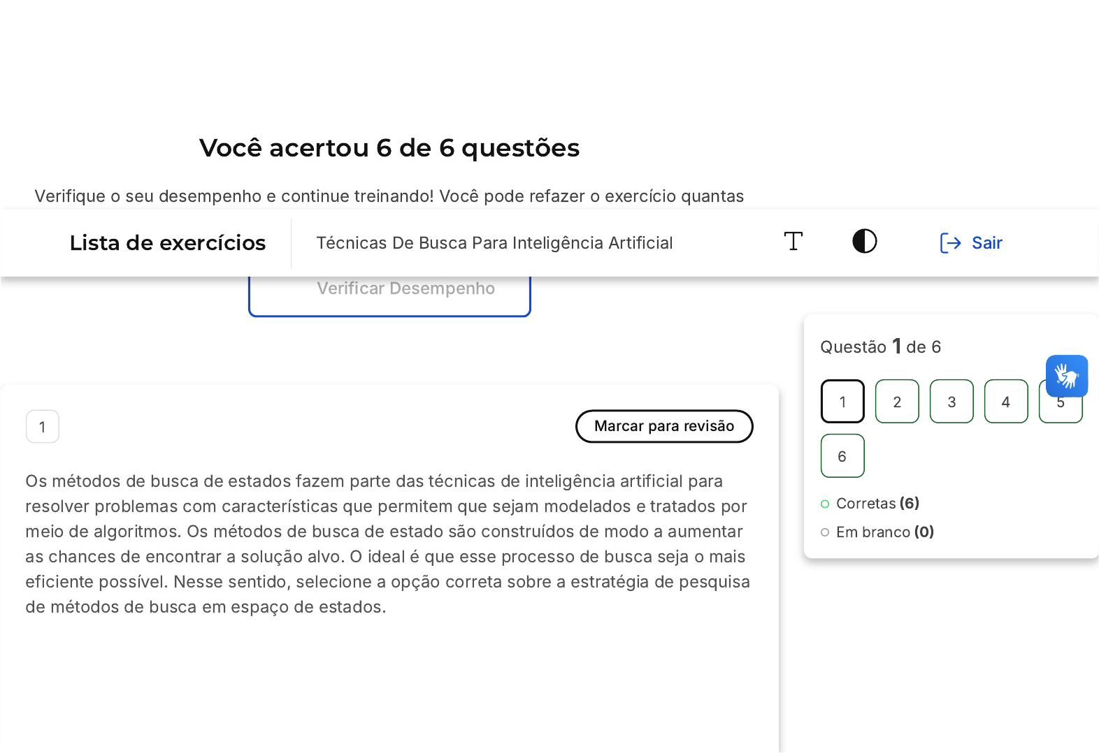 Você acertou 6 de 6 questões Verifique o seu desempenho e continue treinando! Você pode refazer o exercício quantas vezes quiser. Verificar Desempenho 1 Marcar para revisão Os métodos de busca de estados fazem parte das técnicas de inteligência artificial para resolver problemas com características que permitem que sejam modelados e tratados por meio de algoritmos. Os métodos de busca de estado são construídos de modo a aumentar as chances de encontrar a solução alvo. O ideal é que esse processo de busca seja o mais eficiente possível. Nesse sentido, selecione a opção correta sobre a estratégia de pesquisa de métodos de busca em espaço de estados. Questão 1 de 6 Corretas (6) Em branco (0) 1 2 3 4 5 6 Lista de exercícios Técnicas De Busca Para Inteligência Artificial Sair A B C D E É definida como a melhor escolha que o algoritmo pode fazer. Um exemplo é o algoritmo Best First. Ela está relacionada à ordem em que os nós são escolhidos. Corresponde à escolha entre os algoritmos de busca, de modo a maximizar a quantidade de passos. É uma forma eficiente de sempre encontrar a melhor resposta. Refere-se às variações do algoritmo Best First que, normalmente, é o método de melhor desempenho para buscas em espaços de estados. Resposta correta Parabéns, você selecionou a alternativa correta. Confira o gabarito comentado! Gabarito Comentado Existem diversos métodos para explorar espaços de estados. Muitos desses métodos são tentativas de obter soluções viáveis que não são necessariamente a melhor solução. Isso ocorre como uma tentativa de que essas soluções sejam de boa qualidade e obtidas em um tempo computacional que seja considerado aceitável. A B C D E 2 Marcar para revisão Selecione a opção que apresenta a busca que é implementada com uma estrutura do tipo fila: primeiro a entrar, primeiro a sair. Busca em profundidade. Busca em largura. Pesquisa bidirecional. Busca greedy. Busca em grafo. Resposta correta Parabéns, você selecionou a alternativa correta. Confira o gabarito comentado! Gabarito Comentado O algoritmo de busca em largura explora as soluções vizinhas a uma determinada solução. Para isso, ele faz uma rotulação dos vértices por meio de uma numeração A B C sequencial na ordem em que eles são visitados pela primeira vez com o uso de uma estrutura de dados fila de vértices. 3 Marcar para revisão Ao desenvolver um método de busca em espaço de estados, a escolha da estratégia deve ser uma preocupação, pois ela vai influenciar no desempenho do algoritmo. Nesse sentido, selecione a opção correta a respeito dos métodos de busca no espaço de estados e de suas estratégias. De fato, as estratégias podem afetar o desempenho de um agente na execução de um método, no entanto qualquer uma delas garantirá a melhor solução do problema. As estratégias não são determinísticas, por isso não é possível prever o comportamento de um agente. Uma estratégia pode levar a um comportamento cíclico de um agente, ou seja, ele pode retornar a um estado que já visitou e ficar preso em um ciclo. D E Por tratar-se de uma sequência de passos determinada, sempre é possível o comportamento de um agente ao aplicar-se uma determinada estratégia. As estratégias são uma forma de garantir que o agente obtenha a solução ótima de um problema. Resposta correta Parabéns, você selecionou a alternativa correta. Confira o gabarito comentado! Gabarito Comentado Utilizar métodos não exatos para resolver problemas de busca em espaço de estados possui diversas vantagens, tais como: flexibilidade, adaptabilidade, tempo de resposta e facilidade de implementação. No entanto, esses métodos precisam ser tratados com bastante atenção, em especial, para evitar cair em situações em que fiquem presos em ciclos de escolhas. 4 Marcar para revisão Selecione a opção que apresenta a situação adequada para aplicar a busca em largura. A B C D E Quando os nós sucessores tiverem custos maiores que o do nó atual. Quando todos os custos dos nós sucessores forem iguais. Quando todos os custos dos nós sucessores forem diferentes. Sempre deve ser aplicada mesmo que seja combinada com outras estratégias. Quando não for possível aplicar a busca pelo melhor primeiro (Best First Search). Resposta correta Parabéns, você selecionou a alternativa correta. Confira o gabarito comentado! Gabarito Comentado Só faz sentido buscar por nós se tiverem custos menores do que o do nó atual. A busca em largura é um método de exploração dos vizinhos de uma determinada solução. Quando a profundidade da árvore de busca de um problema pode variar e é necessário pesquisar apenas uma parte da árvore para encontrar uma solução, a busca em largura é a opção mais adequada. A escolha da estratégia de busca deve estar relacionada ao tipo de problema e ao contexto de sua aplicação. A B C 5 Marcar para revisão Observe o problema de otimização combinatória a seguir: Um estado é representado pela tupla (x ,x ,x ) . Nesse sentido, selecione a opção correta a respeito do problema. 1 2 3 Certamente, o estado (1,1,1) não é uma solução viável para o problema. A solução ótima do problema é (0,1,0). Apesar de não ser a solução ótima, o estado (0, 0, 0) é uma solução viável para o problema. D E Esse problema não pode ser modelado por um método de busca no espaço de estados. Trata-se de um problema de otimização linear, sendo que as variáveis x ,x e x podem assumir quaisquer valores entre zero e um. 1 2 3 Resposta correta Parabéns, você selecionou a alternativa correta. Confira o gabarito comentado! Gabarito Comentado A formulação matemática é uma poderosa ferramenta para representar um problema, pois ela imediatamente nos fornece: as variáveis de decisão, a função utilidade - quando o problema é de maximização - ou função custo - quando o problema é de minimização, além das restrições do problem