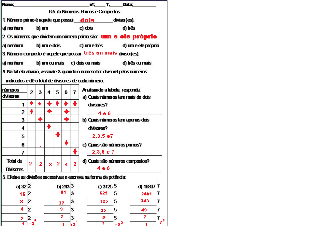 T. Data: 657a Números Primos e Compostos 1 Número primo é aquele que possui dois a) nenhum b) um c) dois d) três 2 Os números que dividem um número primo um e ele próprio a) nenhum b) um e dois c) ume três d) um e ele próprio 3 Número composto é aquele que possui três ou mais a) nenhum b) um ou mais c) dois ou mais d) três ou mais 4 Na tabela abaixo, assinale X quando o número for pelos números indicados e de o total de divisores de cada números 2 3 4 5 6 7 Analisando a tabela, responda dvisores a) Quais números tem mais de 1 divisores? 2 4 e 6 3 b) Quais números apenas dois 4 divisores? 5 2,3,5 e 7 6 c) Quais são números primos? 7 2,3,5 e 7 Total de 2 2 2 d) Quais são números compostos? 3 4 2 Divisores 4e6 5 Efetue as divisões sucessivas e escreva na forma de a) 32 2 b) 243 3 c) 3125 5 d) 16807 7 16 2 81 3 625 5 2401 7 8 2 27 3 125 5 343 7 4 2 9 3 25 5 49 7 2 3 2 3 5 5 7 7 5 4 = 2 1 =3 1 5 1 =55 1