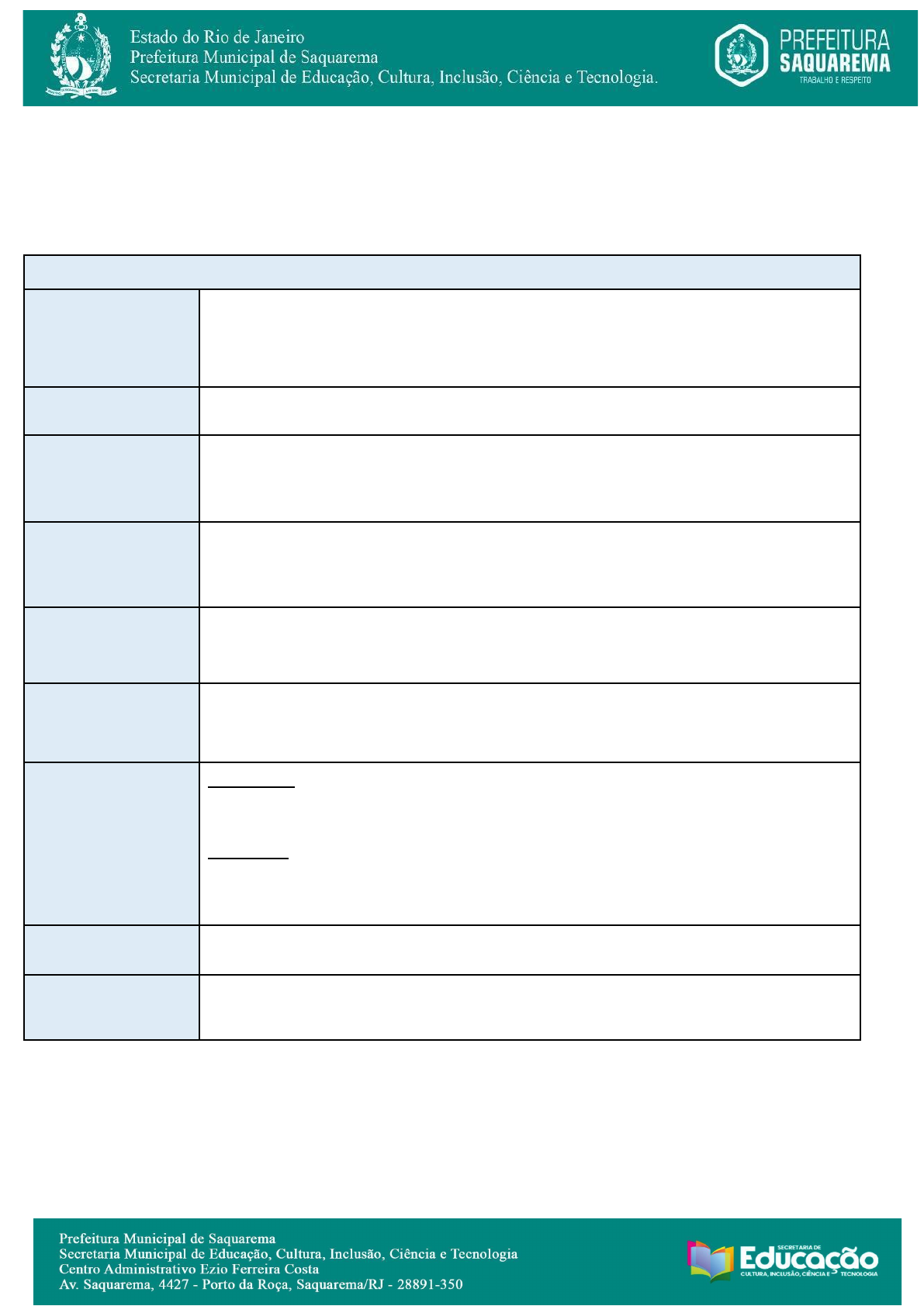 PLANO DE AULA COMPARTILHADO - ROTINA PEDAGÓGICA 4ª SEMANA DE MARÇO 2025 UNIDADE ESCOLAR: CRECHE MUNICIPAL DOMICIANA MONTEIROS DOS SANTOS PROFESSORAS: BENEDICTA, GLEICE, THAINÁ E KELLY TURMAS: 20/21 E 22/23 TURNOS: 1º E 2º DATA: 24/03/2025 Tema da semana: CIRCO COMPETÊNCIAS GERAIS DA BNCC Conhecimento Pensamento Científico, crítico e criativo Autogestão Autoconhecimento e Autocuidado Senso Estético e Repertório Cultural Cultura Digital Empatia e Cooperação Comunicação Argumentação Autonomia DIREITOS DE APRENDIZAGEM ( X ) CONVIVER ( X ) BRINCAR ( X ) PARTICIPAR ( X ) EXPLORAR ( X ) EXPRESSAR ( ) CONHECER-SE SABERES E CONHECIMENTOS (Intencionalidade pedagógica) LINGUAGEM ORAL / GESTOS E MOVIMENTOS. CAMPOS DE EXPERIÊNCIAS ( ) O EU, O OUTRO E O NÓS ( ) CORPO, GESTOS E MOVIMENTOS ( ) TRAÇOS, SONS, CORES E FORMAS (X) ESCUTA, FALA, PENSAMENTO E IMAGINAÇÃO ( ) ESPAÇOS, TEMPOS, QUANTIDADES, RELAÇÕES E TRANSFORMAÇÕES OBJETIVOS DE APREND. E DESENV. CÓDIGOS ALFANUMÉRICO (EI01EF06) Comunicar-se com outras pessoas usando movimentos, gestos, balbucios, fala e outras formas de expressão. OBJETIVOS ESPECÍFICOS 1º TURNO - PARTICIPAR DE BRINCADEIRAS COM A TEMÁTICA CIRCO QUE ENVOLVAM JOGOS CORPORAIS. 2º TURNO - USAR PALAVRAS PARA DESIGNAR OBJETOS E PESSOAS QUE FAZEM PARTE DO MUNDO CIRCENSE. ESTRATÉGIAS/PRÁTICAS PEDAGÓGICAS QUE POSSIBILITEM A APRENDIZAGEM E O DESENVOLVIMENTO Turno: Manhã Em rodinha, a professora irá apresentar o jogo “Boca do Palhaço” para turma explicando que vamos colocar as bolas vermelhas na boca do palhaço. Cada aluno irá colocar as bolas na boca do palhaço. Turno: Tarde Em rodinha, a professora irá apresentar alguns itens usados pelos profissionais circenses e os objetos pertencentes ao universo circense. RECURSOS/ MATERIAIS Jogo Boca do Palhaço, bolas vermelhas, imagens do picadeiro, imagens dos profissionais circenses, nariz, peruca, roupa de palhaço, cartola e varinha de mágico. AVALIAÇÃO / OBSERVAÇÕES: Benedicta Simões Gleice Queli Cestaro Kelly Braga Luz Thainá de Paula _____________________________________ ____________________________________ PROFESSORA REGENTE ORIENTADORA PEDAGÓGICA PLANO DE AULA COMPARTILHADO - ROTINA PEDAGÓGICA 4ª SEMANA DE MARÇO 2025 UNIDADE ESCOLAR: CRECHE MUNICIPAL DOMICIANA MONTEIROS DOS SANTOS PROFESSORAS: BENEDICTA, GLEICE, THAINÁ E KELLY TURMAS: 20/21 E 22/23 TURNOS: 1º E 2º DATA: 25/03/2025 Tema da semana: CIRCO COMPETÊNCIAS GERAIS DA BNCC Conhecimento Pensamento Científico, crítico e criativo Autogestão Autoconhecimento e Autocuidado Senso Estético e Repertório Cultural Cultura Digital Empatia e Cooperação Comunicação Argumentação Autonomia DIREITOS DE APRENDIZAGEM ( X ) CONVIVER ( X ) BRINCAR ( X ) PARTICIPAR ( X ) EXPLORAR ( X ) EXPRESSAR ( X ) CONHECER-SE SABERES E CONHECIMENTOS (Intencionalidade pedagógica) ESTRATÉGIAS E PROCEDIMENTOS PARA BRINCAR / REVISÃO DO MOVIMENTO SENTAR-SE. INTERAÇÃO SOCIAL / DIA DO CIRCO. CAMPOS DE EXPERIÊNCIAS (X) O EU, O OUTRO E O NÓS (X) CORPO, GESTOS E MOVIMENTOS ( ) TRAÇOS, SONS, CORES E FORMAS ( ) ESCUTA, FALA, PENSAMENTO E IMAGINAÇÃO ( ) ESPAÇOS, TEMPOS, QUANTIDADES, RELAÇÕES E TRANSFORMAÇÕES OBJETIVOS DE APREND. E DESENV. CÓDIGOS ALFANUMÉRICO (EI01CG05) UTILIZAR OS MOVIMENTOS DE PREENSÃO, ENCAIXE E LANÇAMENTO, AMPLIANDO SUAS POSSIBILIDADES DE MANUSEIO DE DIFERENTES MATERIAIS E OBJETOS. (EI01EO02) PERCEBER AS POSSIBILIDADES E OS LIMITES DE SEU CORPO NAS BRINCADEIRAS E INTERAÇÕES DAS QUAIS PARTICIPA. OBJETIVOS ESPECÍFICOS 1º TURNO - REPRESENTAR ARTISTAS CIRCENSES MANIPULANDO BOLAS DE DIFERENTES TAMANHOS / EXPLORAR MATERIAIS DO MUNDO CIRCENSE, COMO: CARTOLA, BOLAS, CHOCALHOS, TECIDOS, ÓCULOS, INSTRUMENTOS MUSICAIS E OUTROS, EM SITUAÇÕES DE INTERAÇÃO SOCIAL. 2º TURNO - SENTAR-SE PASSANDO DA POSIÇÃO DEITADA IMITANDO UM ARTISTA DO CIRCO (CONTORCIONISTA) / PARTICIPAR DE ATIVIDADES DE CARACTERIZAÇÃO USANDO ACESSÓRIOS COM A TEMÁTICA DA SEMANA(CHAPÉU DE PALHAÇO, ENTRE OUTROS). ESTRATÉGIAS/PRÁTICAS PEDAGÓGICAS QUE POSSIBILITEM A APRENDIZAGEM E O DESENVOLVIMENTO Turno: Manhã Em rodinha, a professora irá apresentar alguns itens do universo circense, explorando os tamanhos diferentes das bolas usadas pelos artistas palhaços e malabaristas e os demais itens usados por esses profissionais, explorar os itens usados pelos mágicos e alguns instrumentos musicais circenses. Turno: Tarde Em rodinha, a professora irá brincar com os alunos imitando contorcionista, deitando e sentando-se. Após, irá caracterizar os alunos como artistas circenses. RECURSOS/ MATERIAIS Roupa e itens de artistas circenses e de mágicos, apitos, tambores, chocalhos, bolas de tamanhos diferentes. AVALIAÇÃO / OBSERVAÇÕES: Benedicta Simões Gleice Queli Cestaro Kelly Braga Luz Thainá de Paula _____________________________________ ____________________________________ PROFESSORA REGENTE ORIENTADORA PEDAGÓGICA PLANO DE AULA COMPARTILHADO - ROTINA PEDAGÓGICA 4ª SEMANA DE MARÇO 2025 UNIDADE ESCOLAR: CRECHE MUNICIPAL DOMICIANA MONTEIROS DOS SANTOS PROFESSORAS: BENEDICTA, GLEICE, THAINÁ E KELLY TURMAS: 20/21 E 22/23 TURNOS: 1º E 2º DATA: 26/03/2025 Tema da semana: CIRCO COMPETÊNCIAS GERAIS DA BNCC Conhecimento Pensamento Científico, crítico e criativo Autogestão Autoconhecimento e Autocuidado Senso Estético e Repertório Cultural Cultura Digital Empatia e Cooperação Comunicação Argumentação Autonomia DIREITOS DE APRENDIZAGEM ( X ) CONVIVER ( X ) BRINCAR ( X ) PARTICIPAR ( X ) EXPLORAR ( X ) EXPRESSAR ( X ) CONHECER-SE SABERES E CONHECIMENTOS (Intencionalidade pedagógica) LINGUAGEM MUSICAL E CORPORAL. CAMPOS DE EXPERIÊNCIAS ( ) O EU, O OUTRO E O NÓS ( ) CORPO, GESTOS E MOVIMENTOS (X) TRAÇOS, SONS, CORES E FORMAS ( ) ESCUTA, FALA, PENSAMENTO E IMAGINAÇÃO ( ) ESPAÇOS, TEMPOS, QUANTIDADES, RELAÇÕES E TRANSFORMAÇÕES OBJETIVOS DE APREND. E DESENV. CÓDIGOS ALFANUMÉRICO (EI01TS03) EXPLORAR DIFERENTES FONTES SONORAS E MATER