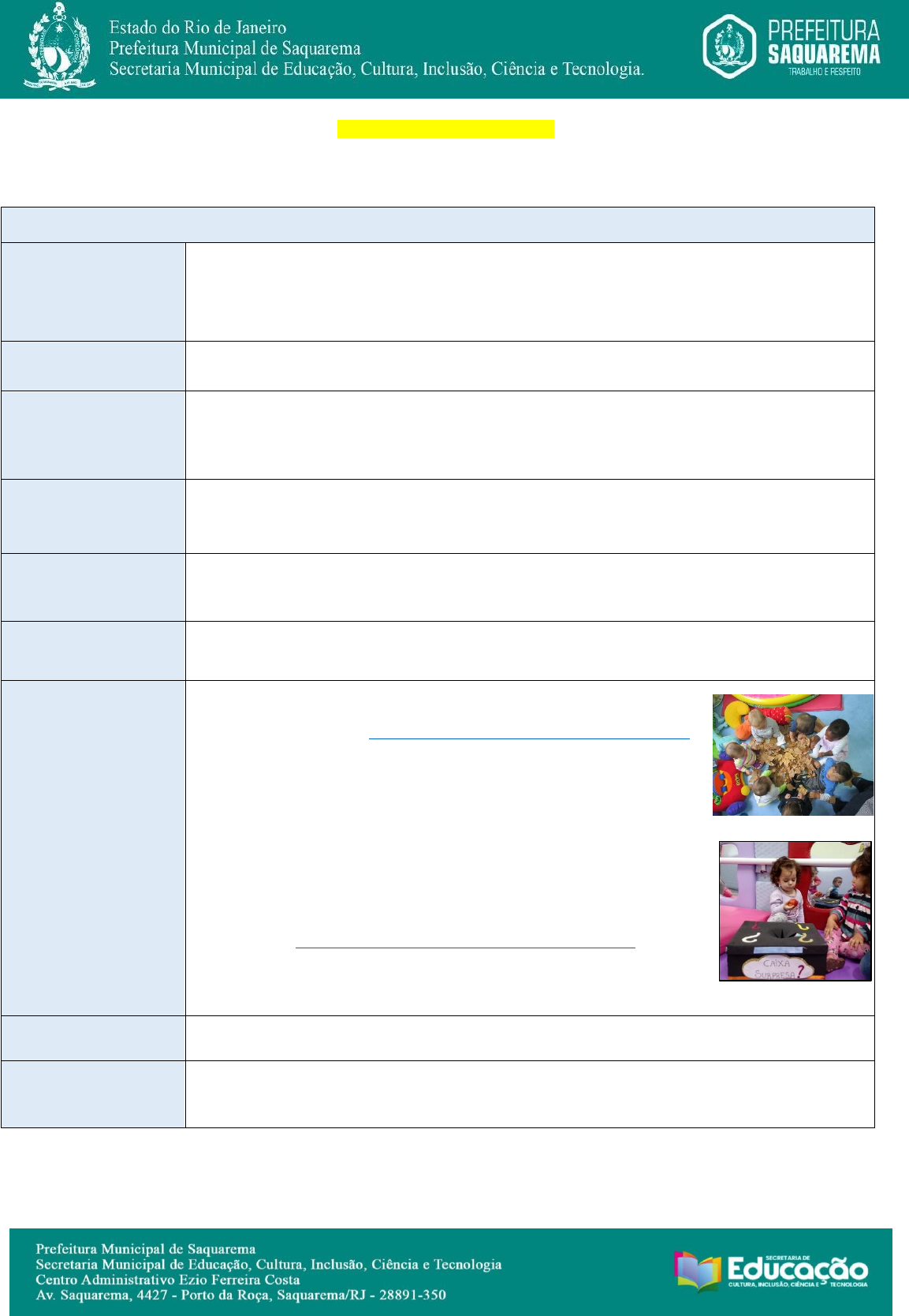 PLANO DE AULA - ROTINA PEDAGÓGICA 3ª SEMANA DE MARÇO 2025 UNIDADE ESCOLAR: CRECHE MUNICIPAL DOMICIANA MONTEIRO DOS SANTOS. PROFªS: THAINÁ, KELLY, BENEDICTA E GLEICE QUELI TURMAS: 20/21 E 22/23 TURNO: 1º E 2º DATA: 17/03/25 Tema da semana: OUTONO/ ÁGUA COMPETÊNCIAS GERAIS DA BNCC Conhecimento Pensamento Científico, crítico e criativo Autogestão Autoconhecimento e Autocuidado Senso Estético e Repertório Cultural Cultura Digital Empatia e Cooperação Comunicação Argumentação Autonomia DIREITOS DE APRENDIZAGEM ( X ) CONVIVER ( X ) BRINCAR ( ) PARTICIPAR ( X ) EXPLORAR ( ) EXPRESSAR ( ) CONHECER-SE SABERES E CONHECIMENTOS (Intencionalidade pedagógica) Movimento: sentar-se CAMPOS DE EXPERIÊNCIAS ( ) O EU, O OUTRO E O NÓS ( X ) CORPO, GESTOS E MOVIMENTOS ( ) TRAÇOS, SONS, CORES E FORMAS ( ) ESCUTA, FALA, PENSAMENTO E IMAGINAÇÃO ( ) ESPAÇOS, TEMPOS, QUANTIDADES, RELAÇÕES E TRANSFORMAÇÕES OBJETIVOS DE APREND. E DESENV. CÓDIGOS ALFANUMÉRICO (EI01CG02) Experimentar as possibilidades corporais nas brincadeiras e interações em ambientes acolhedores e desafiantes. OBJETIVOS ESPECÍFICOS 1º TURNO - Realizar a habilidade corporal sentar-se usando superfícies planas e macias e manipulando elementos que façam referência ao outono (folhas secas e frutas). 2º TURNO - Participar do momento da rodinha sentando-se de forma coordenada. ESTRATÉGIAS/PRÁTICAS PEDAGÓGICAS QUE POSSIBILITEM A APRENDIZAGEM E O DESENVOLVIMENTO ⮚ MANHÃ • Em rodinha, falar sobre a chegada do outono através da história “Outono” do canal Bisnagas Kids (https://www.youtube.com/watch?v=DvJgxPgJv4U), dramatizando as brincadeiras e movimentos realizados pela personagem. Em seguida, apresentar aos alunos a folha seca presente na história para que possam visualizar e senti-la. Finalizar disponibilizando folhas e flores para exploração, convidando os educandos a explorarem o material e estimulando o rasgar das folhas (que serão utilizadas posteriormente em outra atividade). ⮚ TARDE: • Na rodinha, a professora retomará a chegada do outono com imagens ilustrativas alusivas à estação. Após, será apresentada a música “Estações do ano” do canal Bento e Totó (https://www.youtube.com/watch?v=ddKmgEEKGDE), frisando que no outono temos muitas frutas e legumes na colheita. Com auxílio de uma caixa surpresa a professora retirará os frutos típicos da estação e apresentará aos alunos. Em seguida, permitirá que explorem suas texturas, cores e aromas. RECURSOS/ MATERIAIS História, TV, pendrive/internet, folhas secas, caixa surpresa e frutos diversos. AVALIAÇÃO / OBSERVAÇÔES: ___________________________________ ____________________________________ PROFESSORA REGENTE ORIENTADORA PEDAGÓGICA https://www.youtube.com/watch?v=DvJgxPgJv4U https://www.youtube.com/watch?v=ddKmgEEKGDE PLANO DE AULA - ROTINA PEDAGÓGICA 3ª SEMANA DE MARÇO 2025 UNIDADE ESCOLAR: CRECHE MUNICIPAL DOMICIANA MONTEIRO DOS SANTOS. PROFªS: THAINÁ, KELLY, BENEDICTA E GLEICE QUELI TURMAS: 20/21 E 22/23 TURNO: 1º E 2º DATA: 18/03/25 Tema da semana: OUTONO/ ÁGUA COMPETÊNCIAS GERAIS DA BNCC Conhecimento Pensamento Científico, crítico e criativo Autogestão Autoconhecimento e Autocuidado Senso Estético e Repertório Cultural Cultura Digital Empatia e Cooperação Comunicação Argumentação Autonomia DIREITOS DE APRENDIZAGEM ( X ) CONVIVER ( X ) BRINCAR (X ) PARTICIPAR ( ) EXPLORAR ( ) EXPRESSAR ( ) CONHECER-SE SABERES E CONHECIMENTOS (Intencionalidade pedagógica) Início do outono. CAMPOS DE EXPERIÊNCIAS ( ) O EU, O OUTRO E O NÓS ( ) CORPO, GESTOS E MOVIMENTOS ( ) TRAÇOS, SONS, CORES E FORMAS ( X ) ESCUTA, FALA, PENSAMENTO E IMAGINAÇÃO ( ) ESPAÇOS, TEMPOS, QUANTIDADES, RELAÇÕES E TRANSFORMAÇÕES OBJETIVOS DE APREND. E DESENV. CÓDIGOS ALFANUMÉRICO (EI01EF02) Demonstrar interesse ao ouvir a leitura de poemas e a apresentação de músicas. OBJETIVOS ESPECÍFICOS 1º TURNO - Participar de situações de escuta de poemas e músicas com a temática do outono, utilizando máscaras ou outros acessórios para tornar a experiência mais imersiva e expressiva. 2º TURNO - Cantar e participar articulando gestos e vocalizando palavras. ESTRATÉGIAS/PRÁTIC AS PEDAGÓGICAS QUE POSSIBILITEM A APRENDIZAGEM E O DESENVOLVIMENTO ⮚ MANHÃ • Pela manhã, após o uso da caixa musical, a professora retirará da caixa um pássaro de brinquedo e questionará qual música nova conheceremos com esse item. Em seguida, apresentará a canção “Quando chega o outono voa a andorinha” de Mensagem Viva Kids. A canção será apresentada em forma de teatrinho e serão utilizados acessórios para dramatização, como folhas caindo ao vento e um borrifador para simular a chuva. Após, a professora disponibilizará algumas folhas e máscaras de pássaro para imitarmos a andorinha da história. ⮚ TARDE: • Na rodinha, relembrando a temática outono, a professora da tarde apresentará a música “As folhas vão cair” de Bolinha de Música, que ilustra situações do outono utilizando lenços e pedaços de tecido. A turma realizará, seguindo os comandos da professora, a dramatização da história acompanhando os gestos e expressões presentes na canção. Em seguida, a docente disponibilizará os tecidos para manipulação pelos alunos e sugerirá brincadeiras, como esconde-esconde com os tecidos. RECURSOS/ MATERIAIS Pássaro de brinquedo, caixa musical, folhas, borrifador, tecidos e TV AVALIAÇÃO / OBSERVAÇÔES: ___________________________________ ____________________________________ PROFESSORA REGENTE ORIENTADORA PEDAGÓGICA PLANO DE AULA - ROTINA PEDAGÓGICA 3ª SEMANA DE MARÇO 2025 UNIDADE ESCOLAR: CRECHE MUNICIPAL DOMICIANA MONTEIRO DOS SANTOS. PROFªS: THAINÁ, KELLY, BENEDICTA E GLEICE QUELI TURMAS: 20/21 E 22/23 TURNO: 1º E 2º DATA: 19/03/25 Tema da semana: OUTONO/ÁGUA COMPETÊNCIAS GERAIS DA BNCC Conhecimento Pensamento Científico, crítico e criativo Autogestão Autoconhecimento e Autocuidado Senso