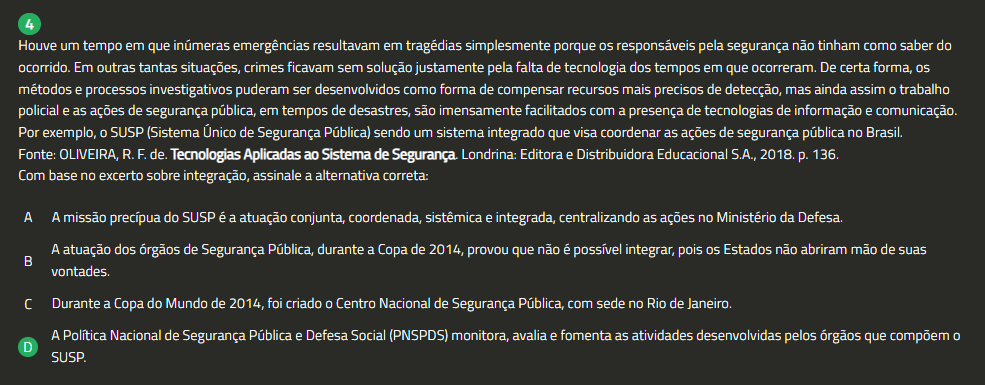 4 Houve um tempo em que inúmeras emergências resultavam em tragédias simplesmente porque responsáveis pela segurança não tinham como saber do ocorrido. Em outras tantas situações, crimes ficavam sem solução justamente pela falta de tecnologia dos tempos em que ocorreram. De certa forma, os métodos e processos investigativos puderam ser desenvolvidos como forma de compensar recursos mais precisos de detecção, mas ainda assim trabalho policial e as ações de segurança pública, em tempos de desastres, são imensamente facilitados com a presença de tecnologias de informação e comunicação. Por exemplo, SUSP (Sistema Unico de Segurança Pública) sendo um sistema integrado que visa coordenar as ações de segurança pública no Brasil. Fonte: OLIVEIRA, R.F. de. Tecnologias Aplicadas ao Sistema de Segurança Londrina: Editora e Distribuidora Educacional S.A., 2018. p. 136. Com base no excerto sobre integração, assinale a alternativa correta: A A missão precípua do SUSP é a atuação conjunta, coordenada, sistêmica e integrada, centralizando as ações no Ministério da Defesa. A atuação dos órgãos de Segurança Pública, durante a Copa de 2014, provou que não é possível integrar, pois os Estados não abriram mão de suas B Durante a Copa do Mundo de 2014, foi criado Centro Nacional de Segurança Pública, com sede no Rio de Janeiro. A Política Nacional de Segurança Pública e Defesa Social (PNSPDS) monitora, avalia e fomenta as atividades desenvolvidas pelos que compõem D SUSP.