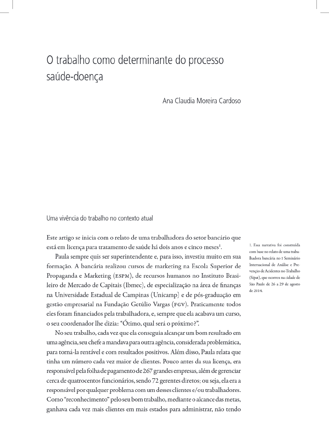 O trabalho como determinante do processo saúde-doença Ana Claudia Moreira Cardoso Uma vivência do trabalho no contexto atual Este artigo se inicia com o relato de uma trabalhadora do setor bancário que está em licença para tratamento de saúde há dois anos e cinco 1. Essa narrativa foi construída com base no relato de uma traba- Paula sempre quis ser superintendente e, para isso, investiu muito em sua bancária no I Seminário formação. A bancária realizou cursos de marketing na Escola Superior de Internacional de Análise Pre- venção de Acidentes no Trabalho Propaganda e Marketing (ESPM), de recursos humanos no Instituto Brasi- (Sipat), que ocorreu na de leiro de Mercado de Capitais (Ibmec), de especialização na área de finanças Paulo de 26 a 29 de agosto de 2014. na Universidade Estadual de Campinas (Unicamp) e de pós-graduação em gestão empresarial na Fundação Getúlio Vargas (FGV). Praticamente todos eles foram financiados pela trabalhadora, e, sempre que ela acabava um curso, o seu coordenador lhe dizia: qual será o No seu trabalho, cada vez que ela conseguia alcançar um bom resultado em uma agência, seu chefe a mandava para outra agência, considerada problemática, para torná-la rentável e com resultados positivos. Além disso, Paula relata que tinha um número cada vez maior de clientes. Pouco antes da sua licença, era responsável pela folha de pagamento de 267 grandes empresas, além de gerenciar cerca de quatrocentos funcionários, sendo 72 gerentes diretos; ou seja, ela era a responsável por qualquer problema com um desses clientes e/ ou trabalhadores. Como "reconhecimento" pelo seu bom trabalho, mediante o alcance das metas, ganhava cada vez mais clientes em mais estados para administrar, não tendoo trabalho como determinante do processo saúde-doença, 73-93 mais tempo "para sequer almoçar, nem responder e-mails". Muito menos para sua família e amigos. Foi quando deslocaram Paula para trabalhar no Rio Janeiro, na época da implantação das Unidades de Polícia Pacificadora motorista que a acompanhava até trabalho várias vezes ia à frente, para ver se era possível entrar nas agências em que ela trabalhava, localizadas nos morros do Jacaré, Macaco e Borel. Paula, ao voltar para o hotel em que se hospedava, estava es- gotada e ainda tinha todos os e-mails do dia para responder, somar a produção diária, cobrar os que deixaram de fazer, entre outras pendências. Ela se sentia muito cansada, com fadiga, dores de cabeça, no ombro, tontura "vontade de sumir", confessando ter desejado se jogar do 27 andar do luxuoso hotel Othon. Mas queria se mostrar firme e precisava atingir a meta, ou seria humilhada na reunião semanal do banco. "Eu alcançava todas as metas impostas, sei que consegui fazer muito resultado para o banco. Mas também foi assim que banco foi tirando as horas da minha vida e da minha família. Eu não tinha mais tempo para nada. Fui sentindo que minha energia estava acabando". Cansada de tudo e não vendo mais saída, Paula tirou licença para realizar uma cirurgia da bexiga, que já era solicitada por seu médico há três anos e, por conta da carga de trabalho, não conseguira fazer. Quando se afastou para realizar o procedimento cirúrgico, a bancária passou a ser atendida apenas pelo departamento de recursos humanos do banco e a receber números de protocolos. Tal situação, agravada por seu histórico no trabalho, a deixou transtornada: "meu cérebro entrou em pane mental, tive um branco, tive surto e síndrome do pânico. Naquele momento, me levaram a um psiquiatra, que detectou que eu estava com estresse profundo, correndo risco de a minha mente nem se recuperar". A Comunicação de Acidente de Trabalho (CAT) foi aberta pelo sindicato dos Bancários de São Paulo e, ainda assim, o banco informou ao Instituto Nacional do Seguro Social (INSS) que não tinha rece- bido documento. Paula relata tristemente suas idas aos peritos do INSS, um ortopedista, outro otorrino. "Nenhum quis ouvir o que eu tinha para contar, minha experiência no trabalho, meus sintomas e minhas dores: os médicos não consideram o que os trabalhadores falam". Até que, numa terceira perícia, ela começou falando à médica que, se não pudesse novamente contar o que estava sentindo e o que estava acontecendo, iria embora e desistiria. Nesse momento, a médica se propôs a ouvi-la e explicitou que não conhecia muito sobre adoecimento mental ou, especificamente, sobre a Síndrome de Burnout, mas solicitou que Paula deixasse com ela o material sobre o assunto para que pudesse pesquisar. 74 Tempo Social, revista de sociologia da USP, V. 27, n. 1Ana Claudia Moreira Cardoso Da parte da empresa, explicita Paula, silêncio total. Nenhum telefonema. Até hoje a CAT não foi aberta, e ela permanece licenciada em função da sua cirurgia na bexiga e não do adoecimento mental. Entretanto, o diagnóstico de Burnout foi dado por dois médicos psiquiatras. "Hoje em dia, eu nem consigo passar na frente do banco", afirma Paula. Após o diagnóstico, Paula tentou tratamento com vários remédios: Venvance, Dormonid, Dalmadorm, Frontal XR, Lyrica, Aropax, Razapina e Quetiapima, que desencadearam efeitos colaterais, como melancolia e dimi- nuição do desejo sexual. Isso se refletiu em seu relacionamento familiar, tanto emocional como financeiro. Afinal, a conta mensal com remédios chega a R$ 600 mensais. Desde que iniciou o tratamento, houve pouca melhora, e alguns medicamentos passaram a ser ministrados em doses elevadas. No que se refere aos impactos na família, eles vão ainda mais longe; uma de suas filhas tentou o suicídio, dizendo que não aguentava mais ver a mãe sem reagir e cada vez mais debilitada. "Ela é muito jovem e não conseguiu entender que eu não tinha condições de reagir, mesmo com os remédios", relatou Paula. Um dos últimos incidentes antes de sua licença ocorreu na noite anterior à visita a um cliente que ela faria com seu coorden