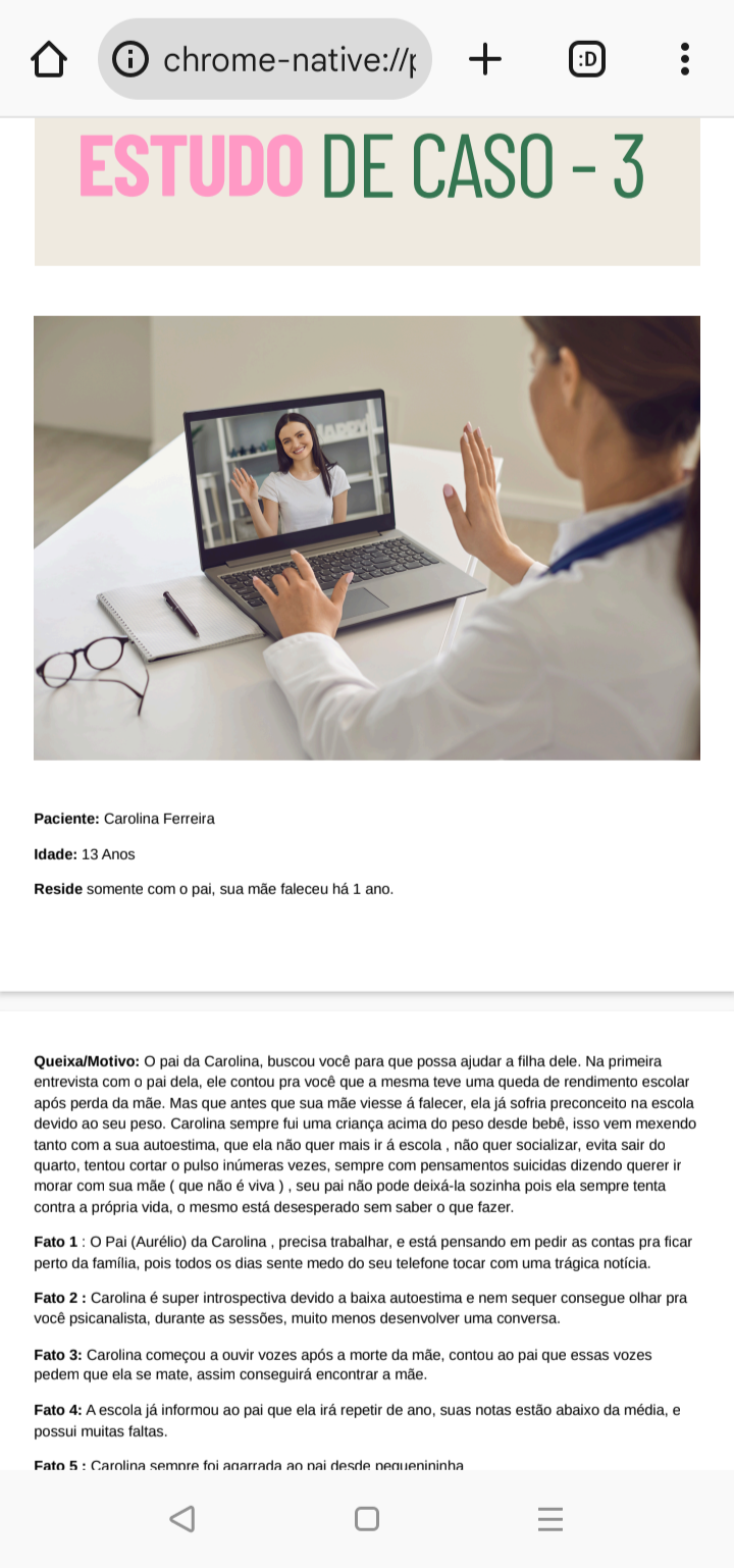 i chrome-native://p + :D ESTUDO DE CASO - 3 Paciente: Carolina Ferreira Idade: 13 Anos Reside somente com o pai, sua mãe faleceu há 1 Queixa/Motivo: pai da Carolina, buscou você para que possa ajudar a filha dele. Na primeira entrevista com o pai dela, ele contou pra você que a mesma teve uma queda de rendimento escolar após perda da mãe. Mas que antes que sua mãe viesse falecer, ela já sofria preconceito na escola devido ao seu peso. Carolina sempre fui uma criança acima do peso desde bebê, isso vem mexendo tanto com a sua autoestima, que ela não quer mais in escola não quer socializar, evita sair do quarto, tentou cortar o pulso inúmeras vezes, sempre com pensamentos suicidas dizendo querer in morar com sua mãe ( que não é viva seu pai não pode deixá-la sozinha pois ela sempre tenta contra a própria o mesmo está desesperado sem saber que Fato 1 o Pai (Aurélio) da Carolina precisa trabalhar, e está pensando em pedir as contas pra ficar perto da família, pois todos os dias sente medo do seu telefone tocar com uma trágica notícia. Fato 2 : Carolina é super introspectiva devido a baixa autoestima e nem sequer consegue olhar pra você psicanalista, durante as sessões, muito menos desenvolver uma conversa. Fato 3: Carolina começou a ouvir vozes após a morte da mãe, contou ao pai que essas vozes pedem que ela se assim conseguirá encontrar a mãe. Fato 4: A escola já informou ao pai que ela irá repetir de ano, suas notas estão abaixo da média, e possui muitas faltas. Fato 5 : Carolina sempre foi agarrada ao desde
